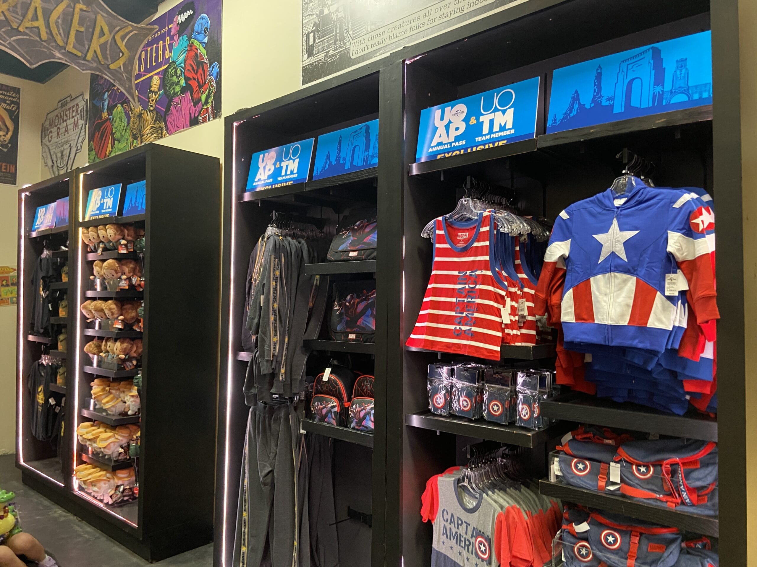 One display is dedicated to Marvel merchandise, including items inspired by Captain America and Spider-Man.