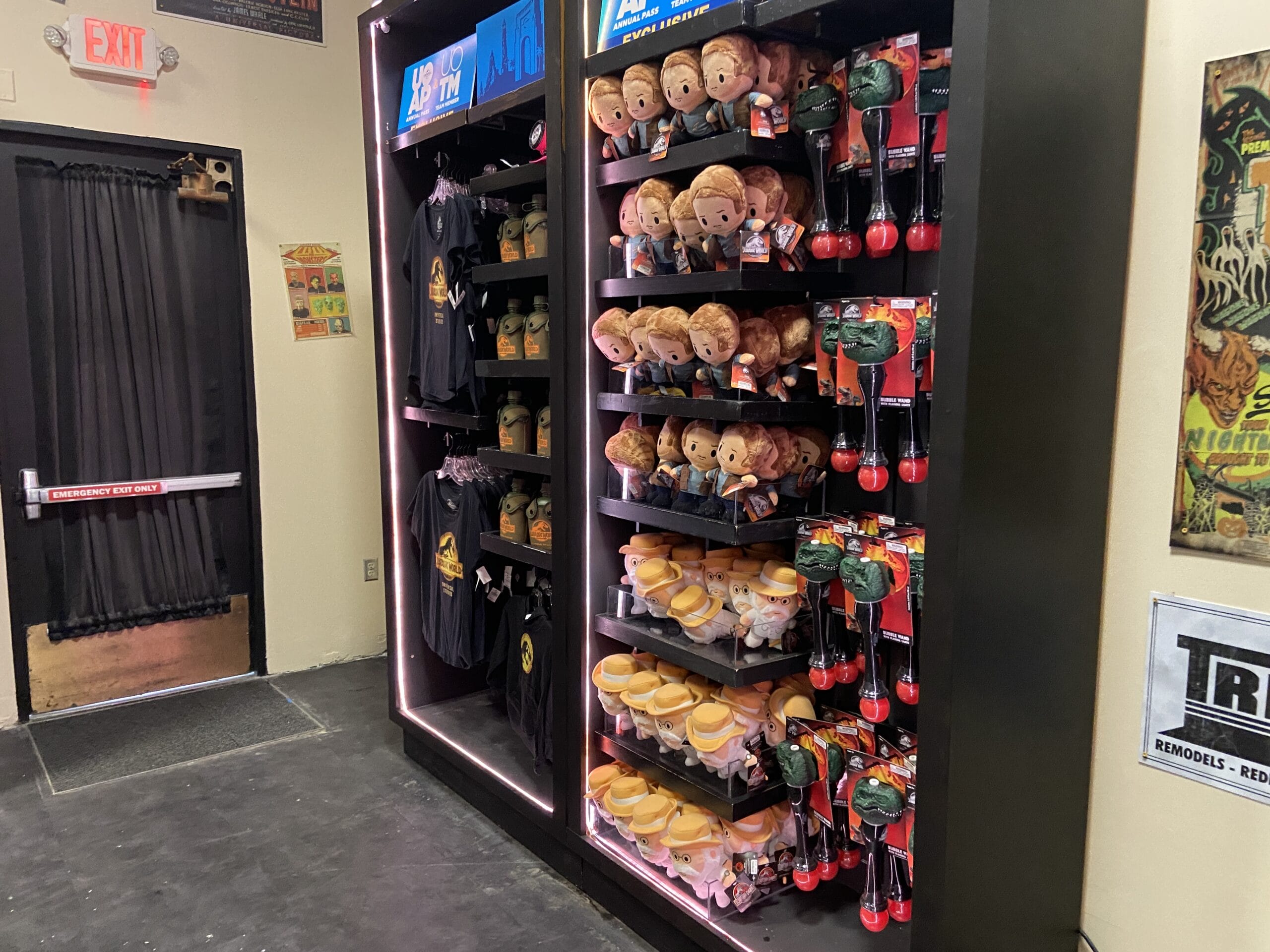 Another shelf is full of “Jurassic World” merch, including plush, apparel, and bubble wands.