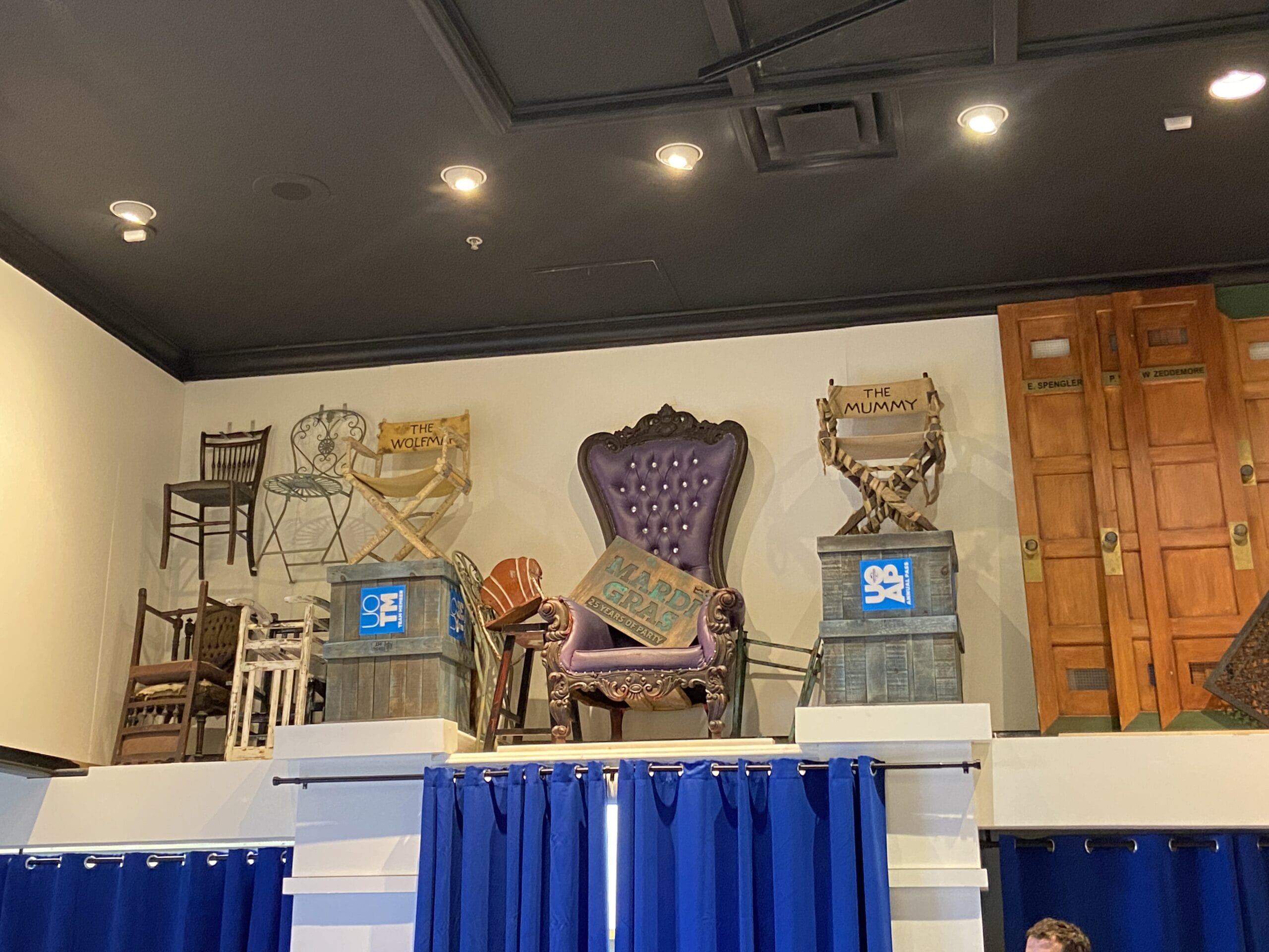 On the other side of the room, a smaller Mardi Gras room sits in a purple chair. The two director’s chairs for The Mummy and The Wolfman are also from All Hallows Eve Boutique.
