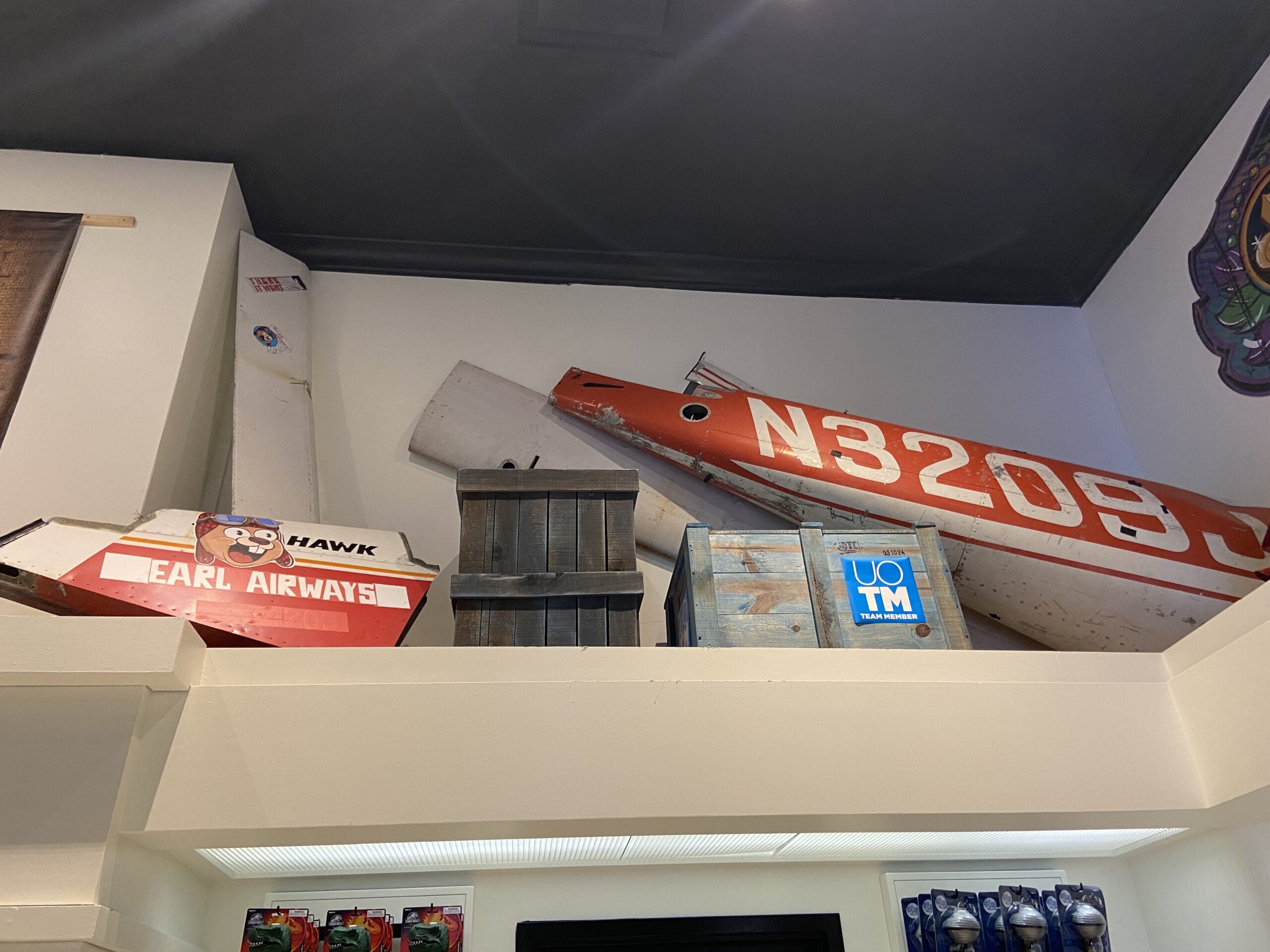A dismantled plane features an Earl Airways logo.
