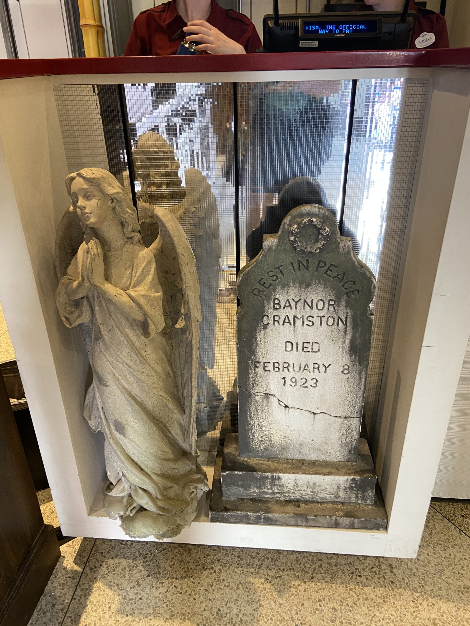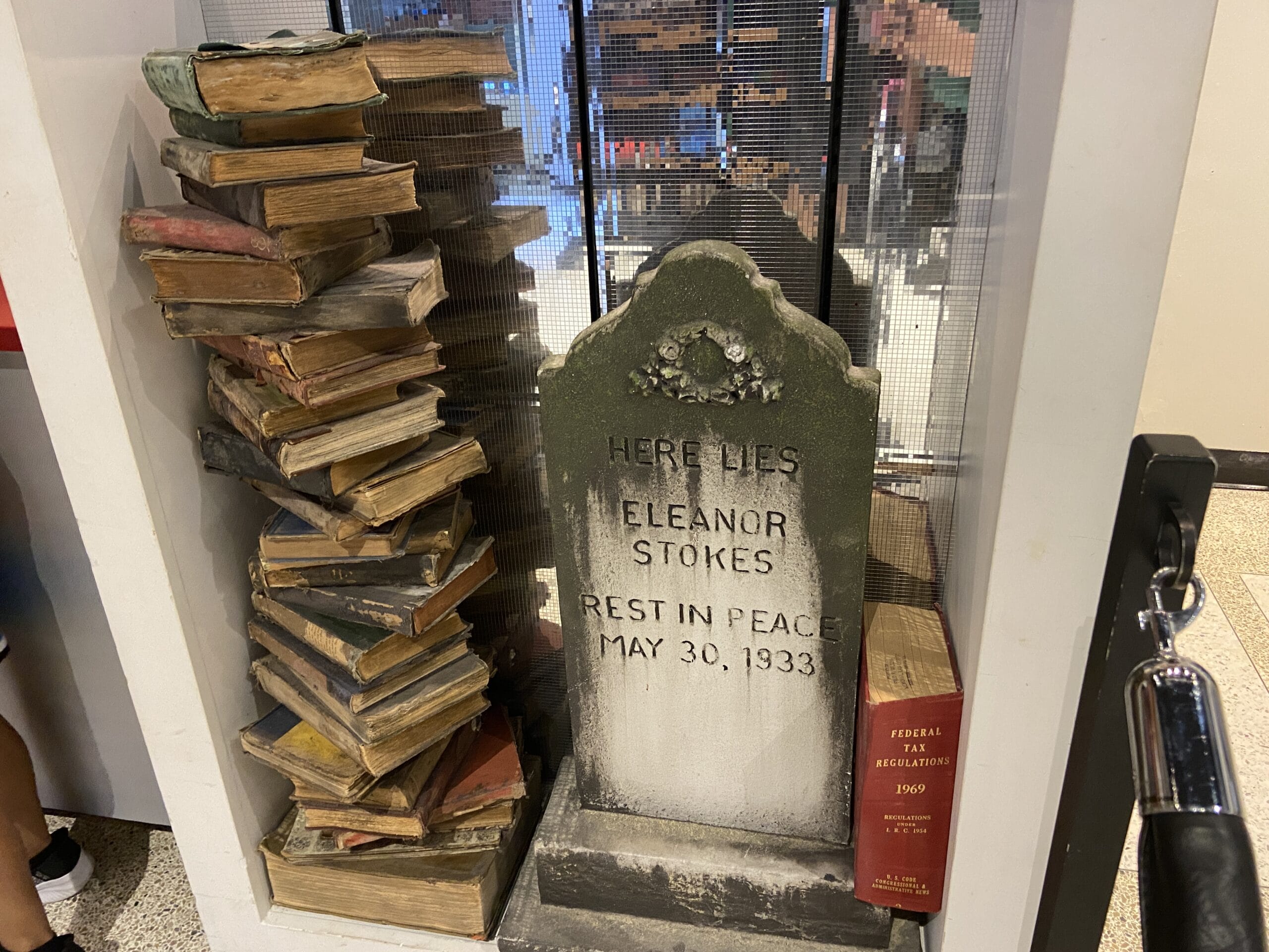 A pair of graves on the fronts of the counters honor Eleanor Stokes and Baynor Cramston. Next to the former is a book of the 1969 Federal Tax Regulations.
