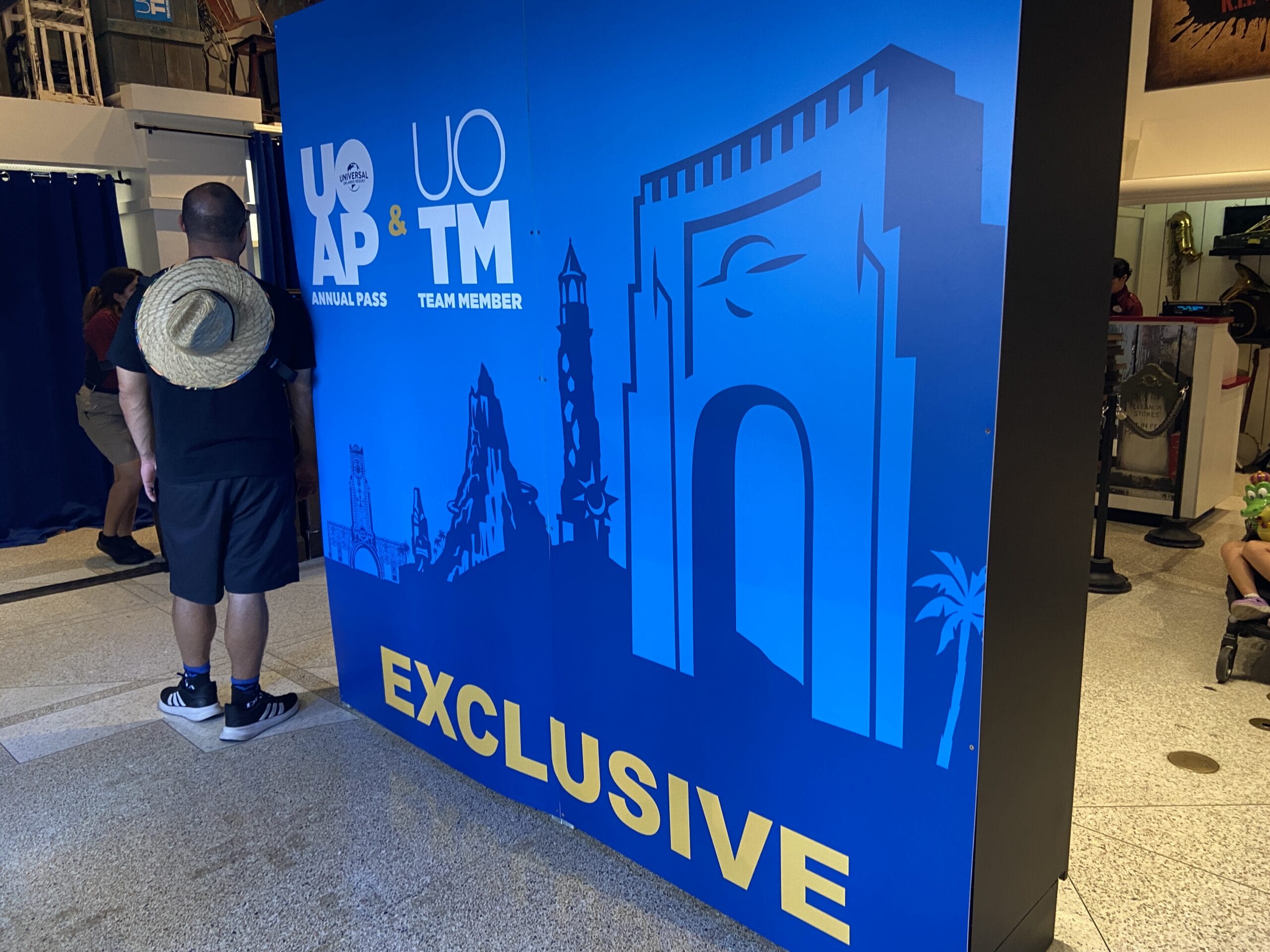 A large decal mural showcasing the icons of Universal Orlando Resort (including the Epic Universe entrance gate) is at the exit.
