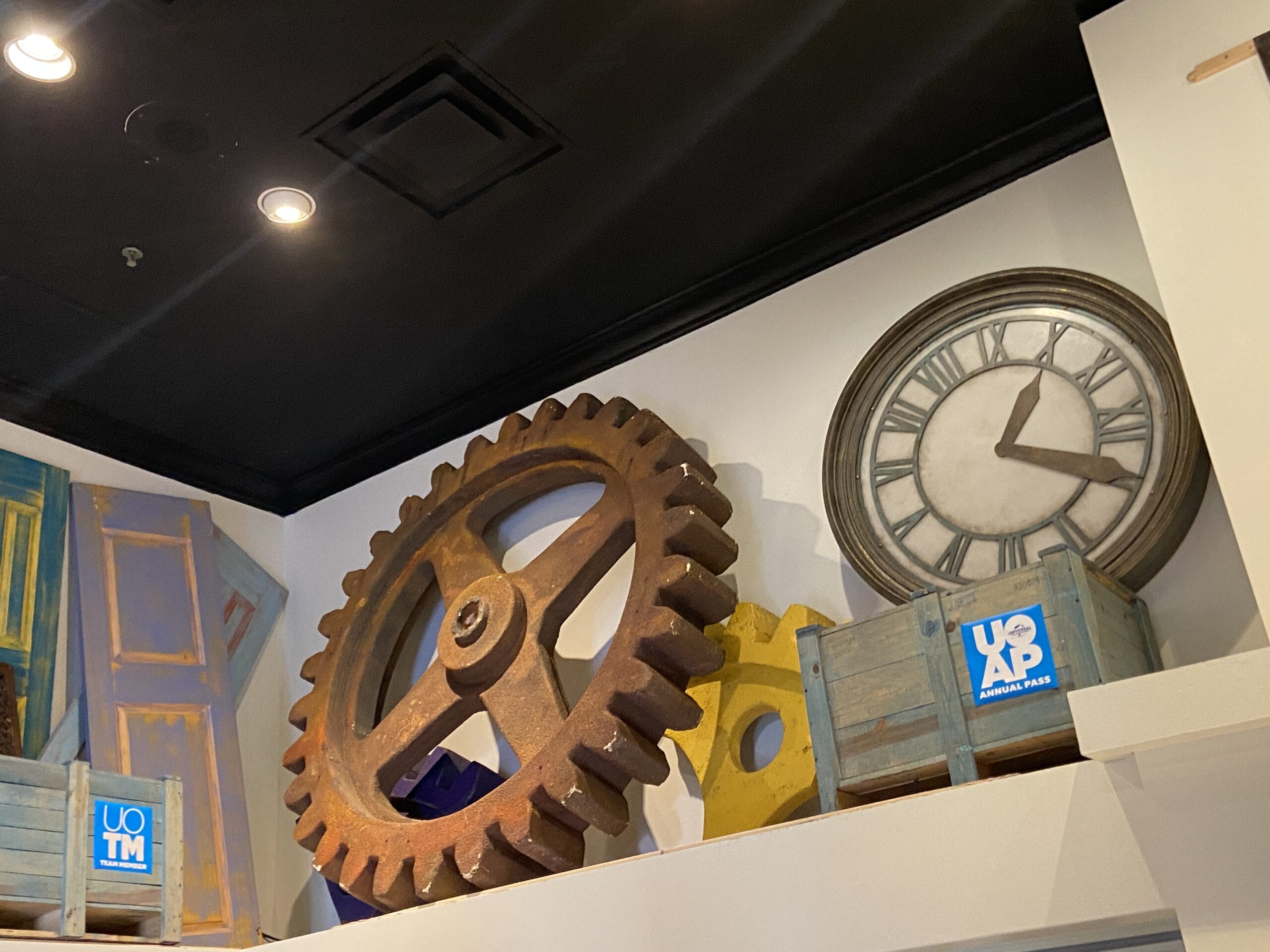 Next to the banner is a large gear and clock from “Back to the Future.”