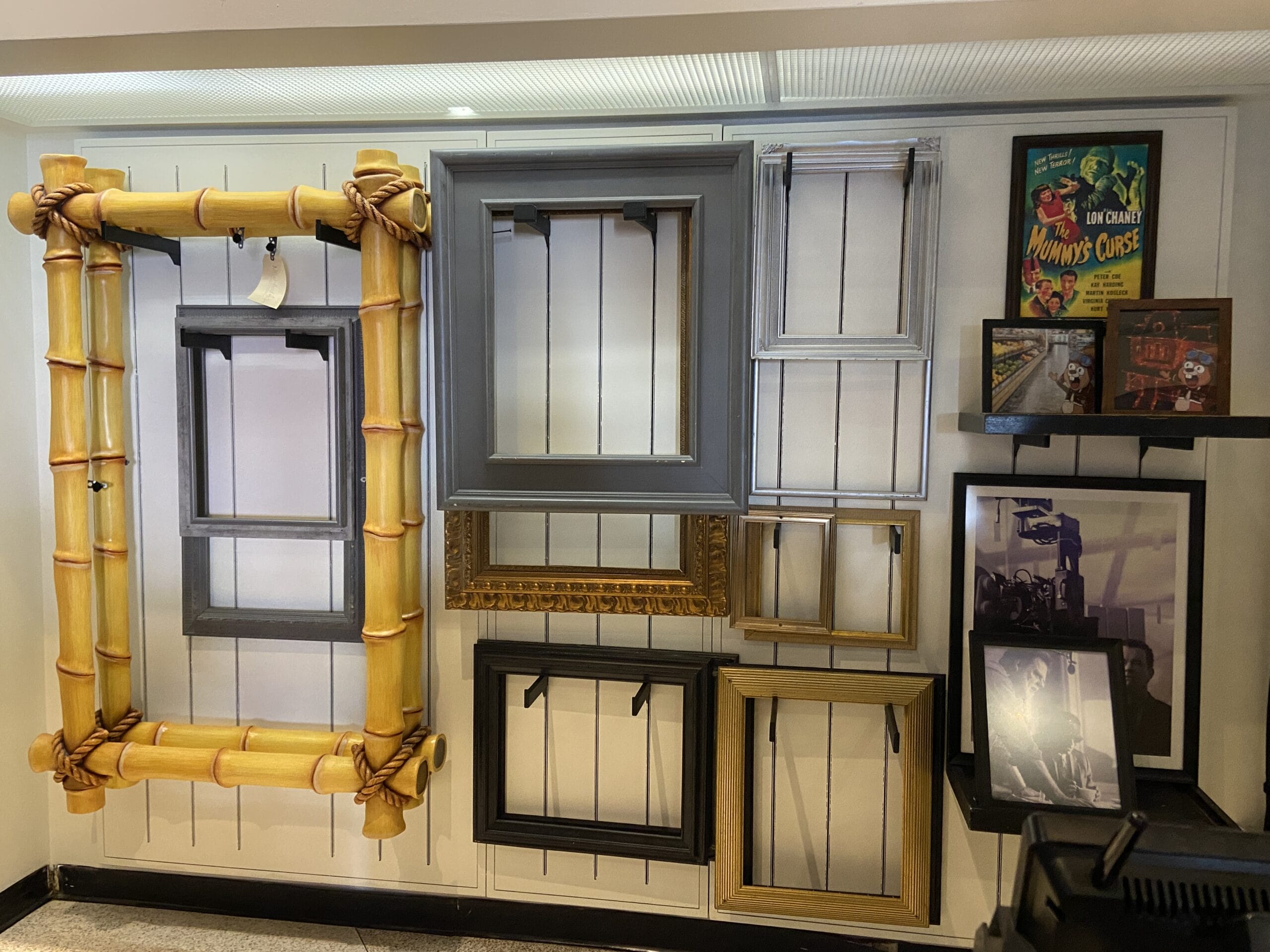 Several empty picture frames hang behind one counter, alongside framed black-and-white photos, pictures of Earl the Squirrel, and a poster for The Mummy’s Curse.
