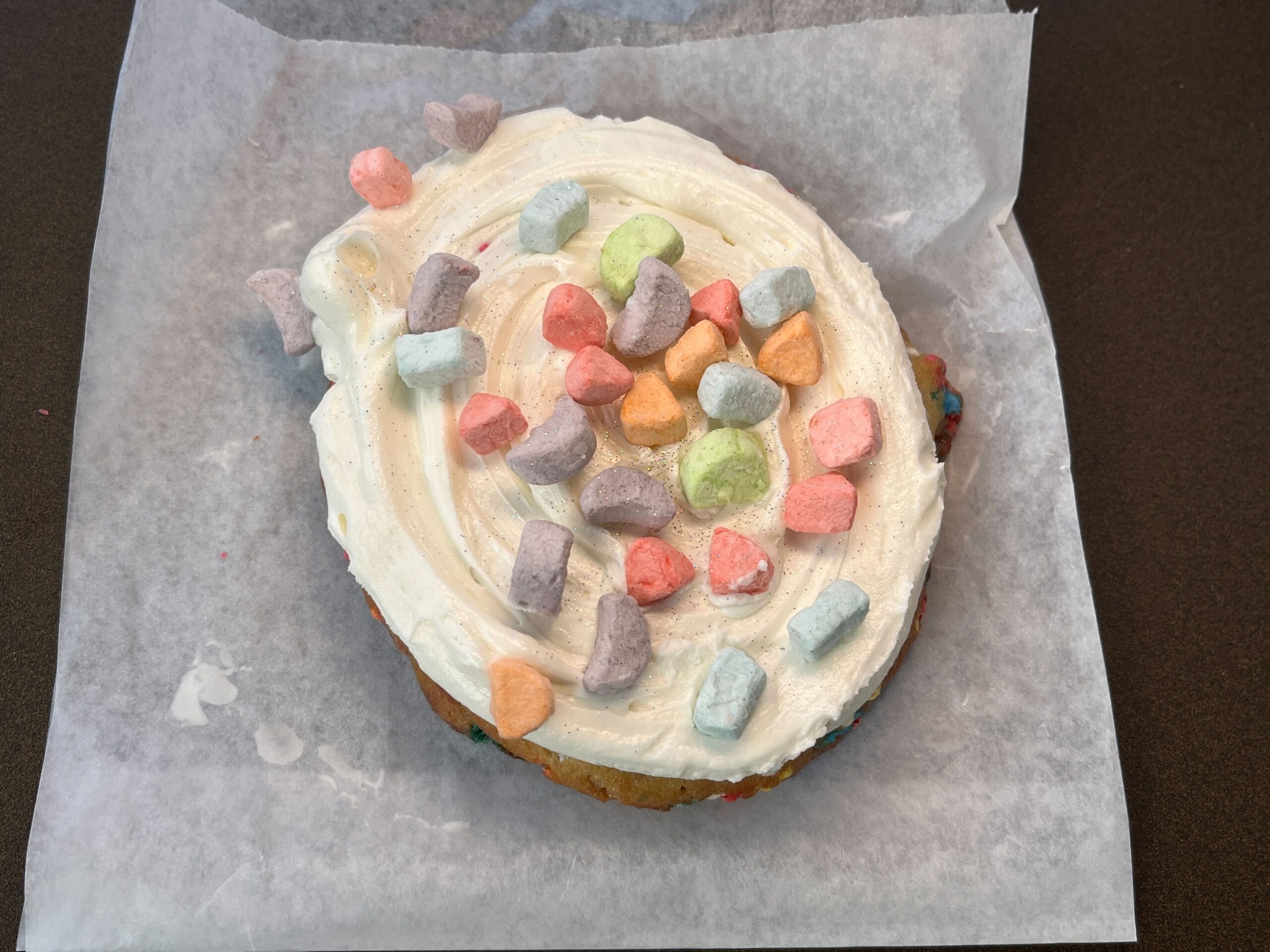 This cookie is huge! The inside looks like Funfetti cake mix, and it’s moist and soft. We like this, but definitely need a drink that can cut the richness of the buttercream frosting. The marshmallows taste just like those you’d find in a box of Lucky Charms cereal. We don’t think we could even eat half of this by ourselves, so you’ll definitely want to share it.