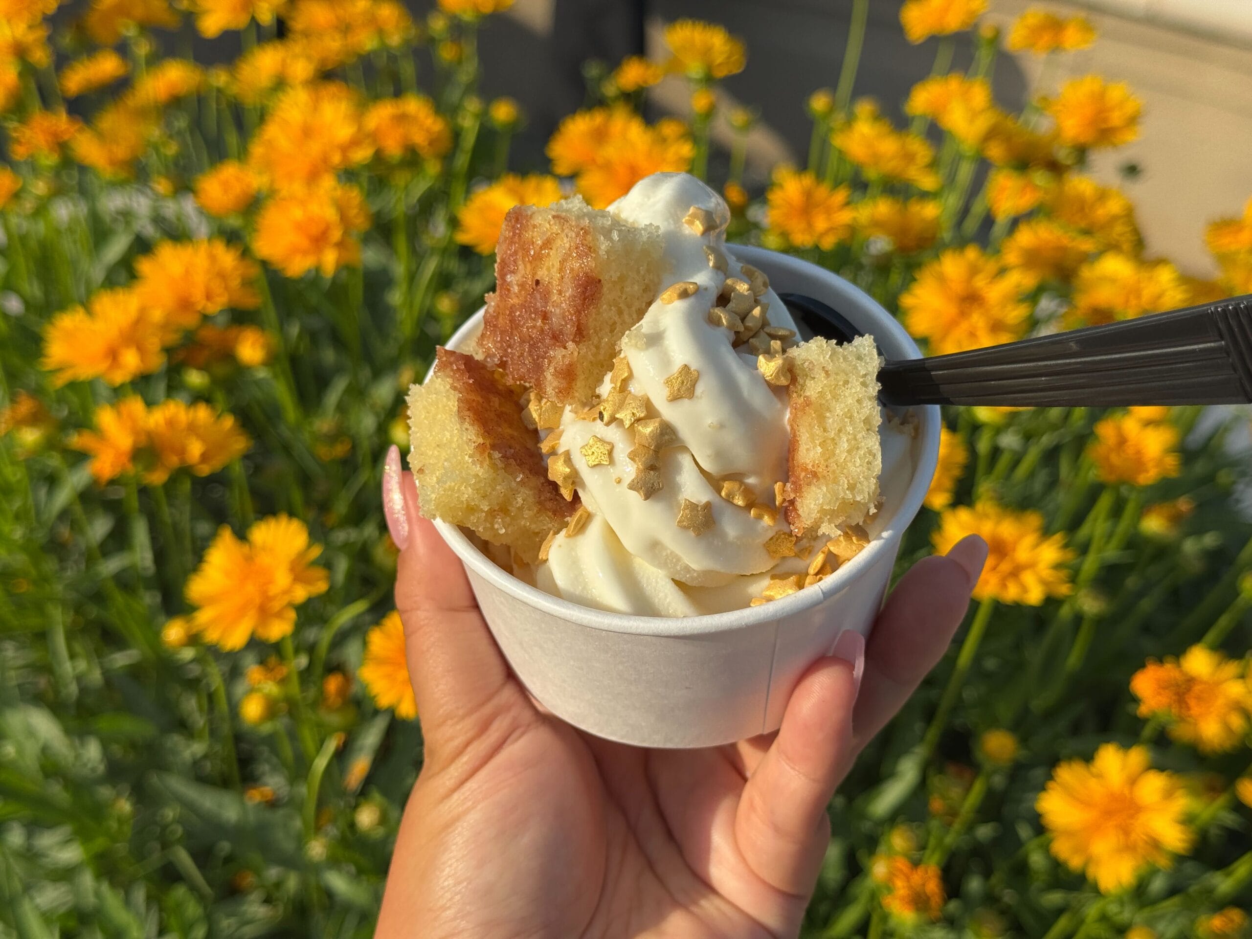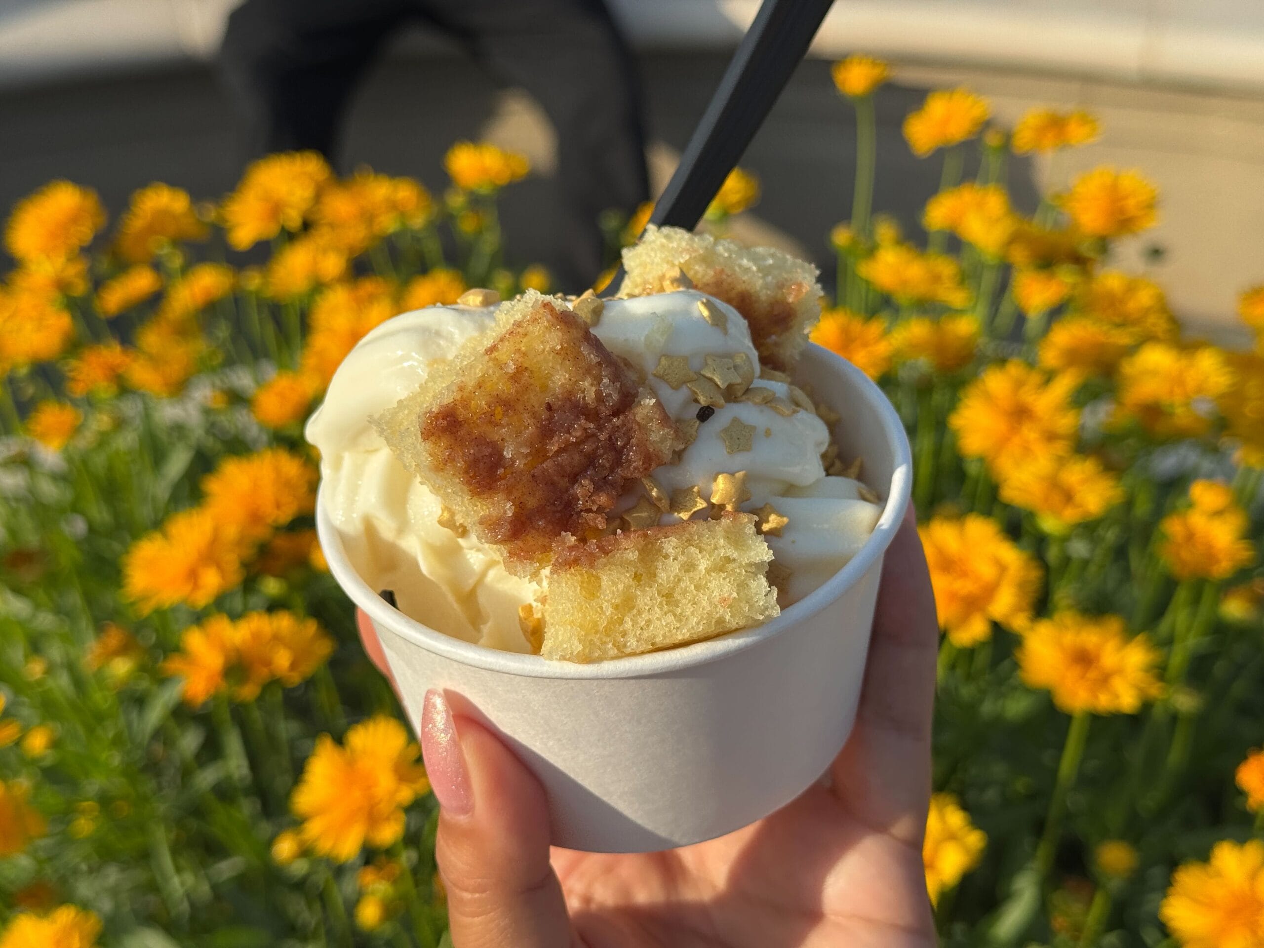 For the ice cream at Frosty Moon, you can choose one of six flavors, accompanied by up to two toppings of your choice. We opted for cheesecake-flavored ice cream, topped with gold star sprinkles and streusel cake pieces. We were hoping for more creative flavor options, so that was a bit disappointing.