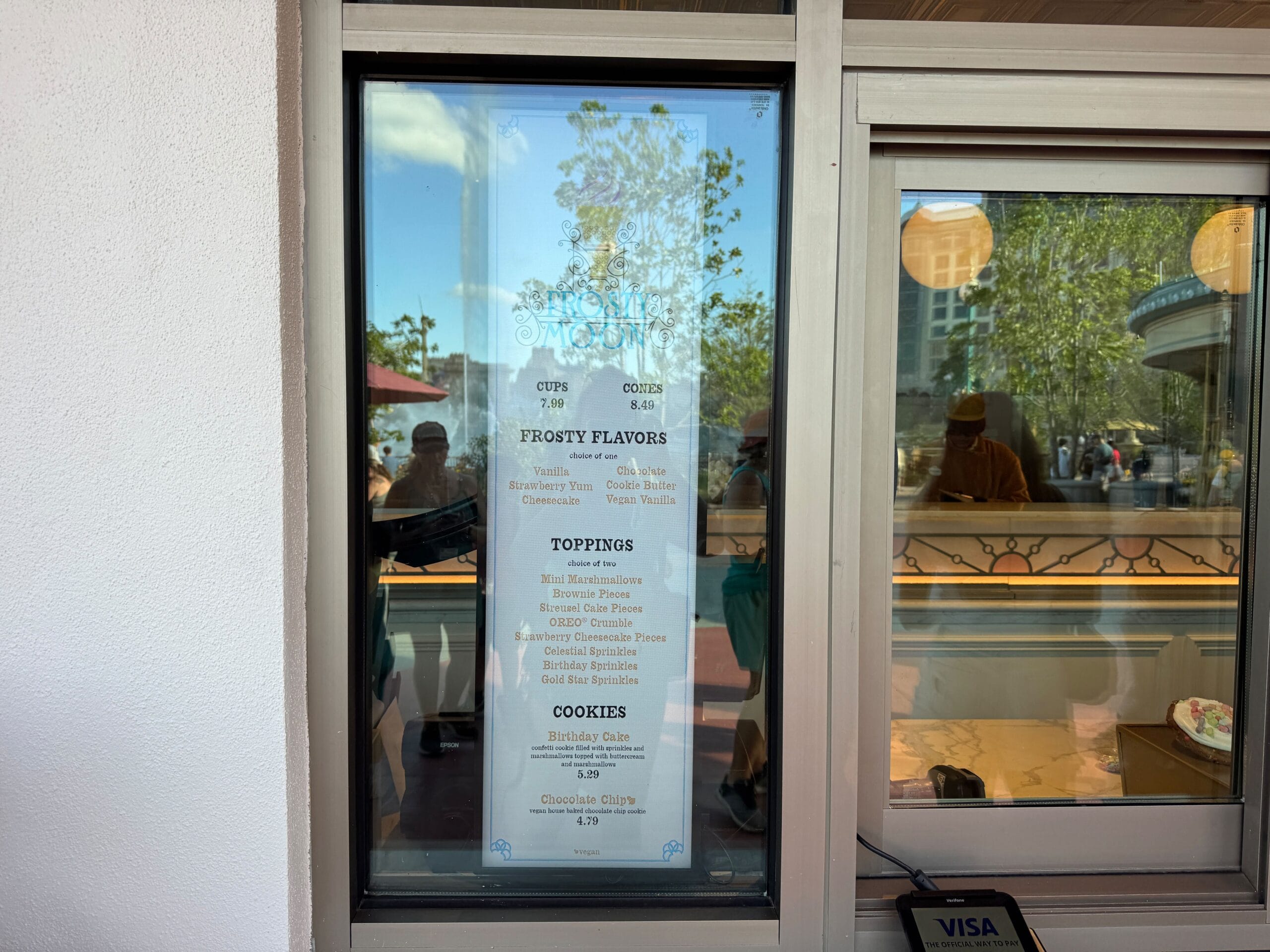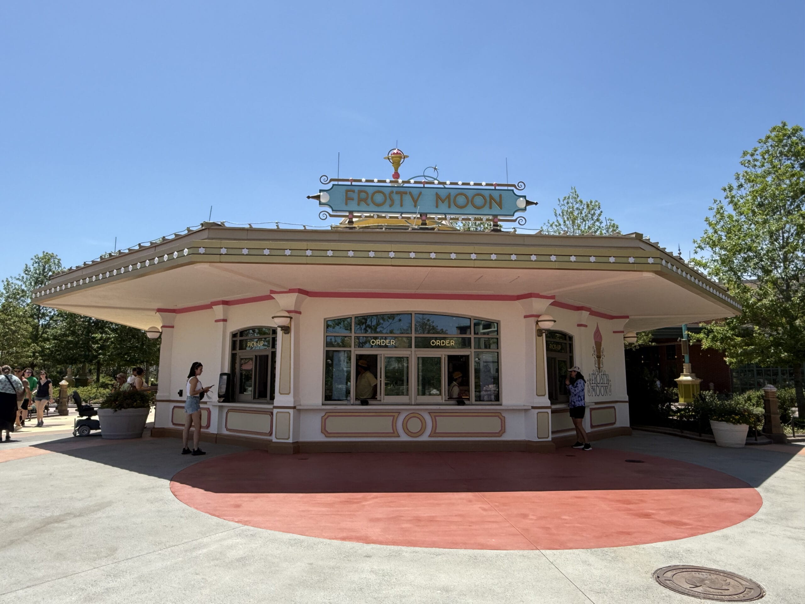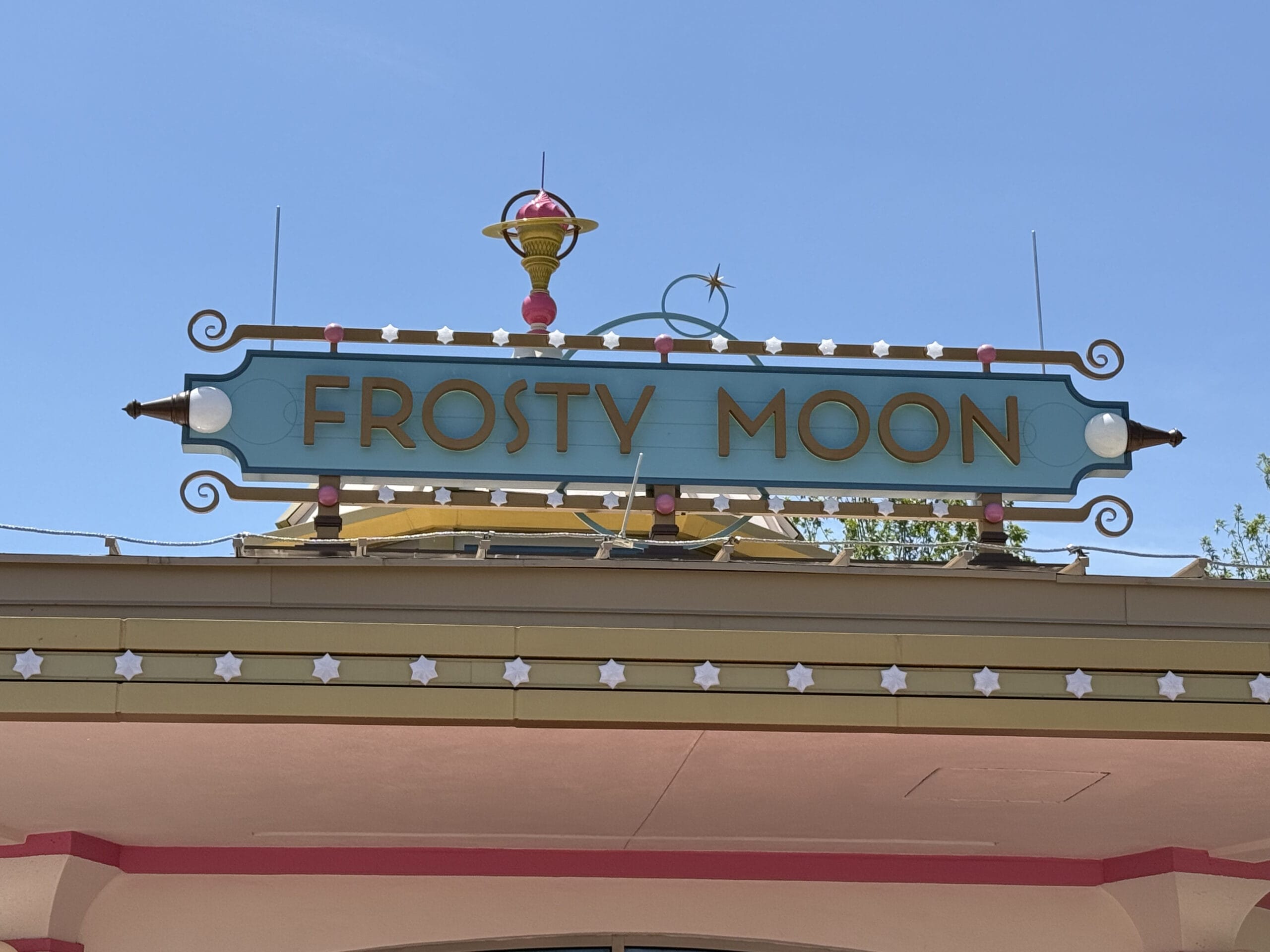 Frosty Moon is a cream and pink-colored permanent kiosk with a roof lined with stars.