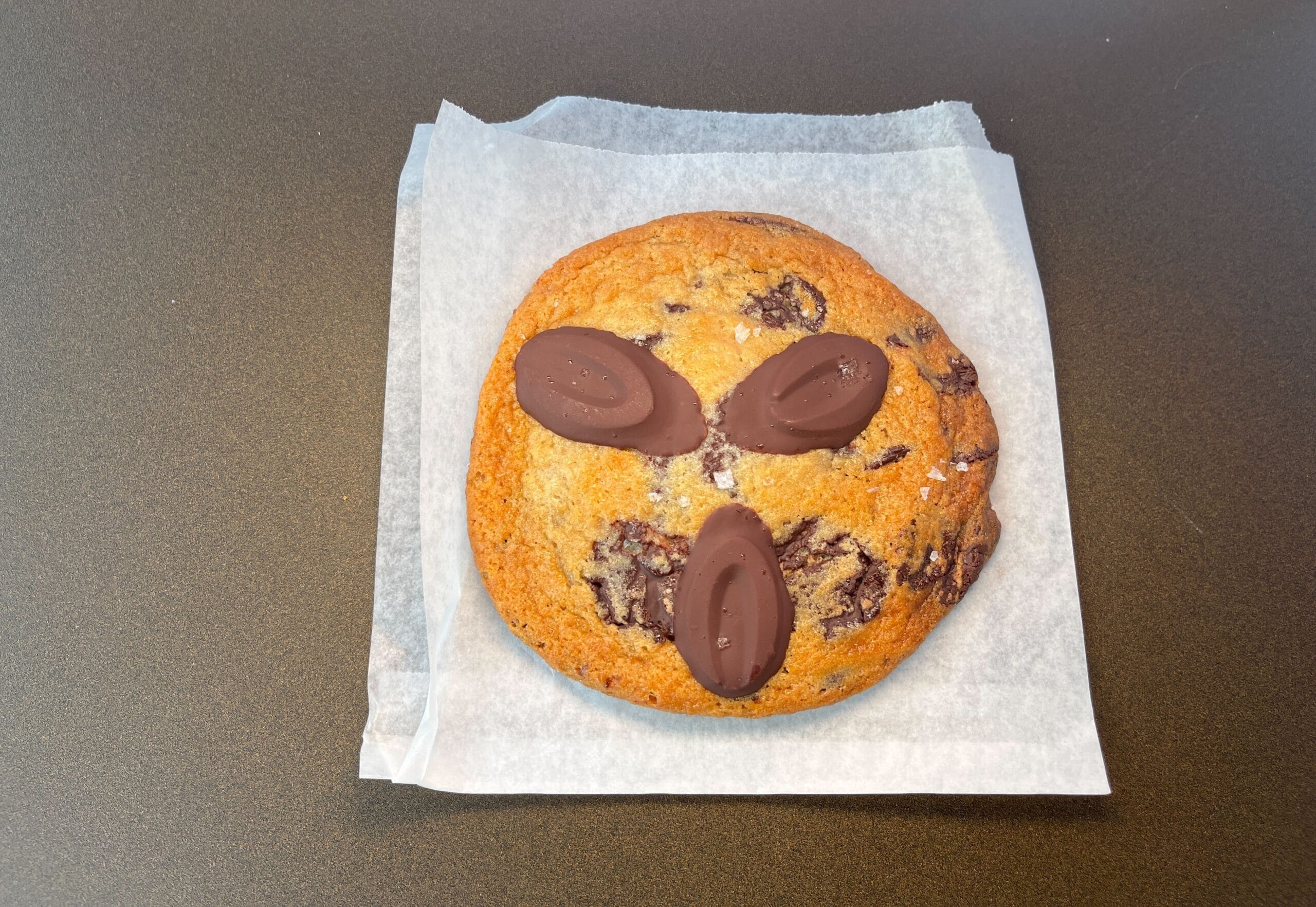 We thought the chocolate chip arrangement of this cookie looked like “The Scream” by Edvard Munch, or perhaps craters in a planet.