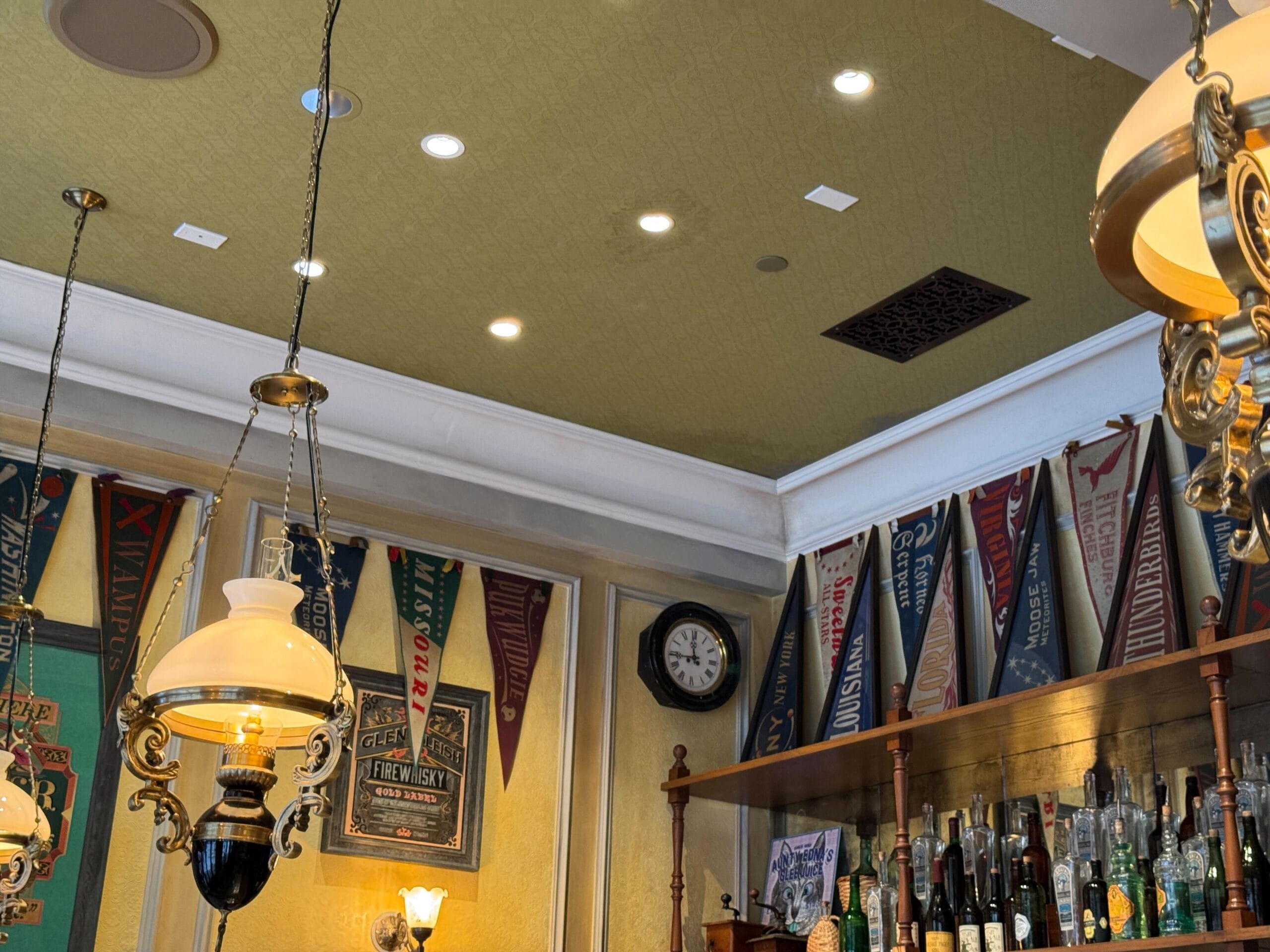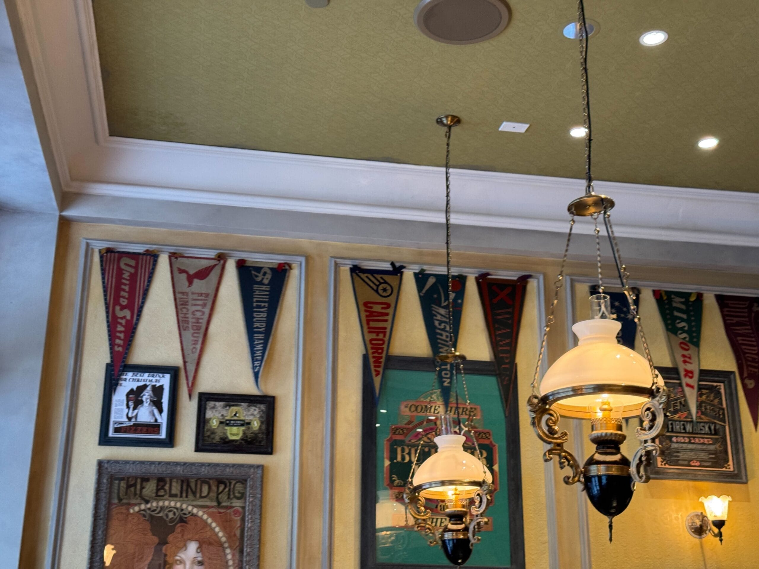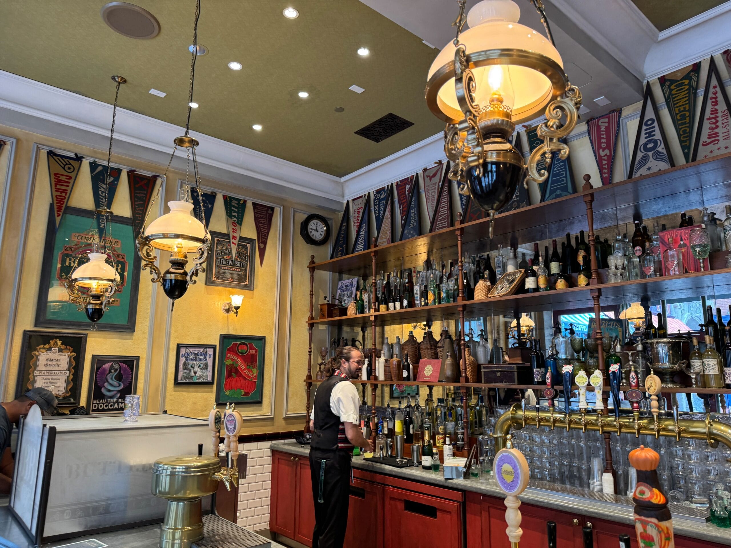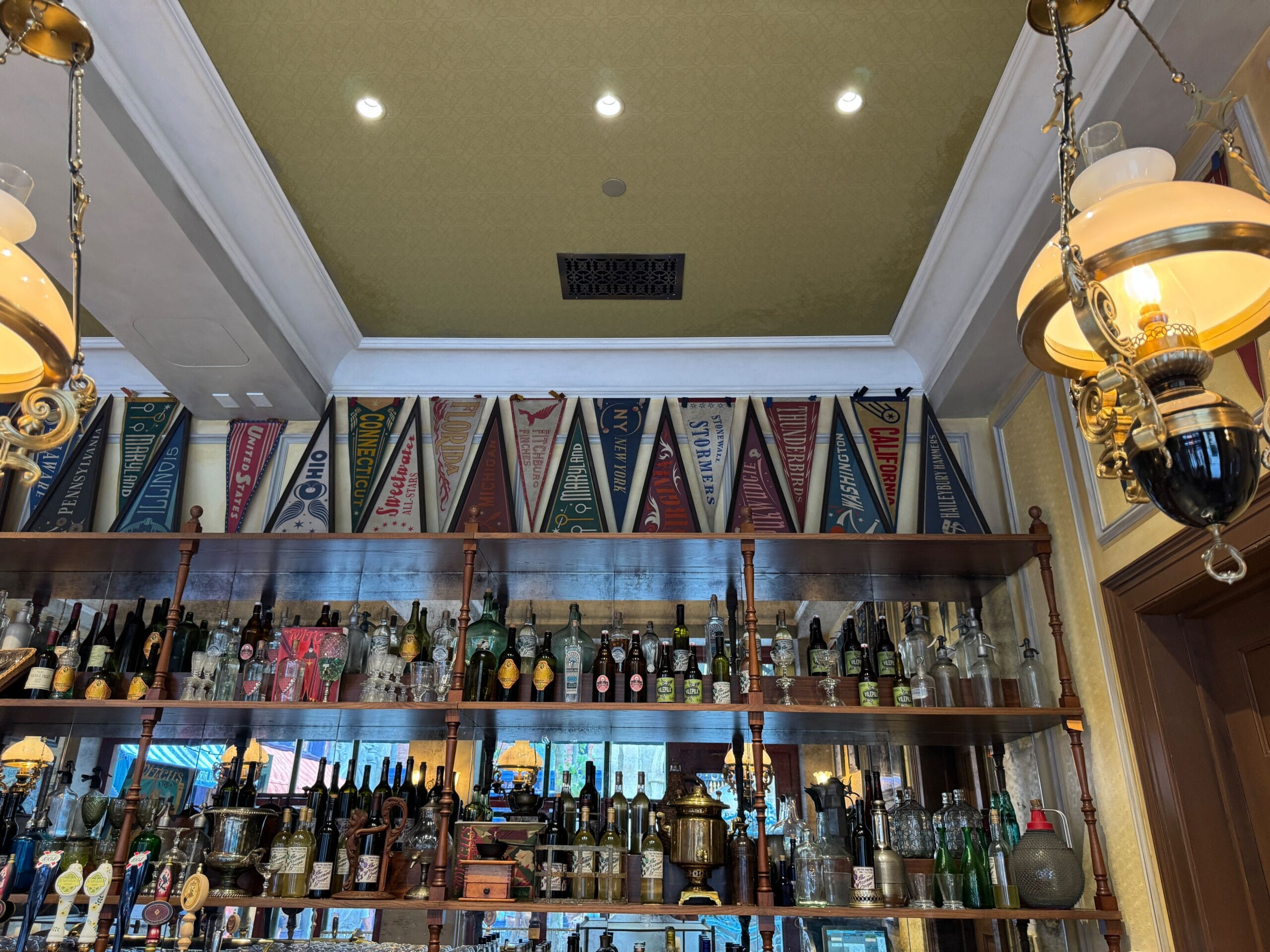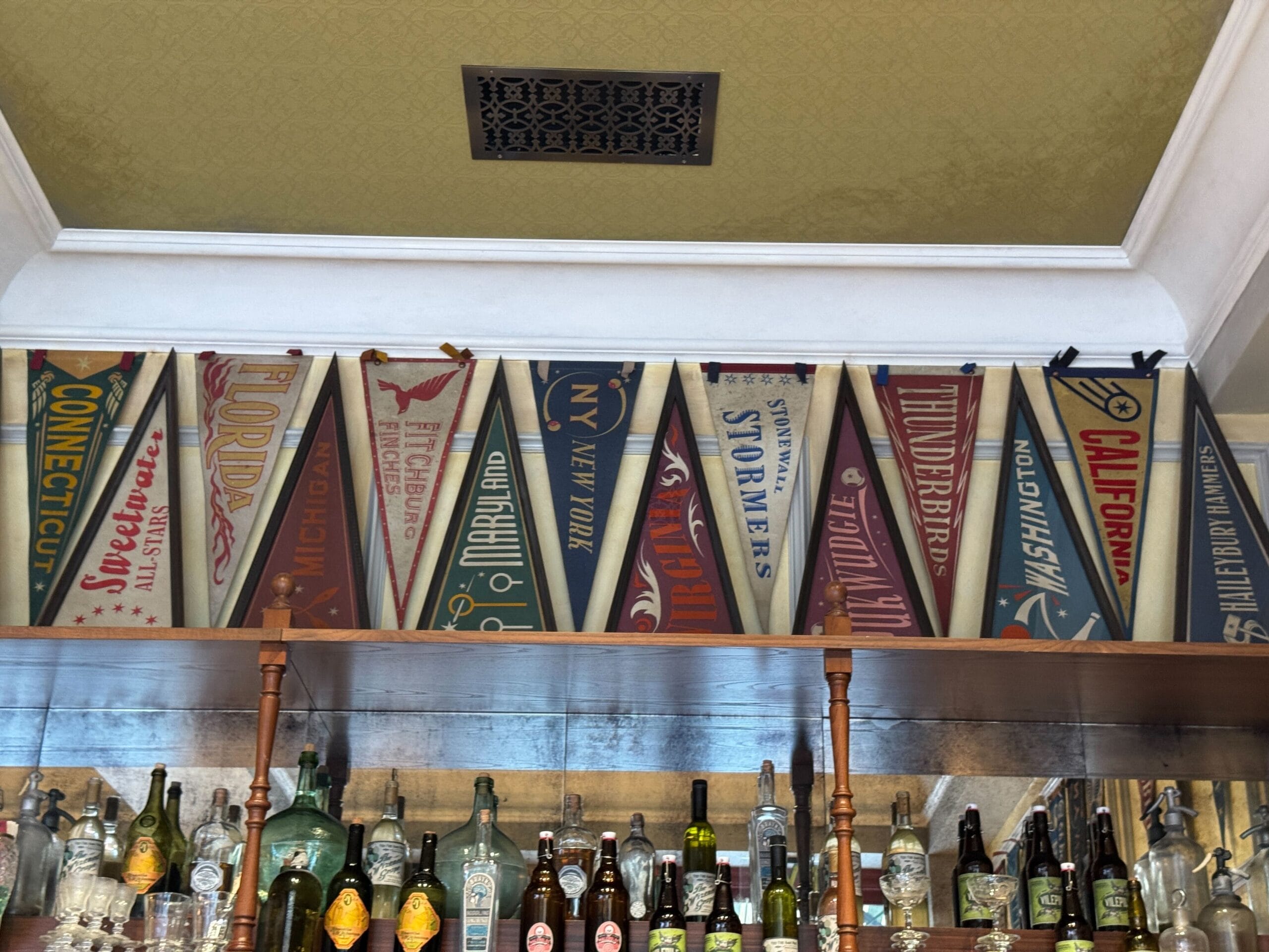 Decor on the left side of the bar is more of the same, with pennants for Quidditch teams lining the ceiling and framed advertisements.