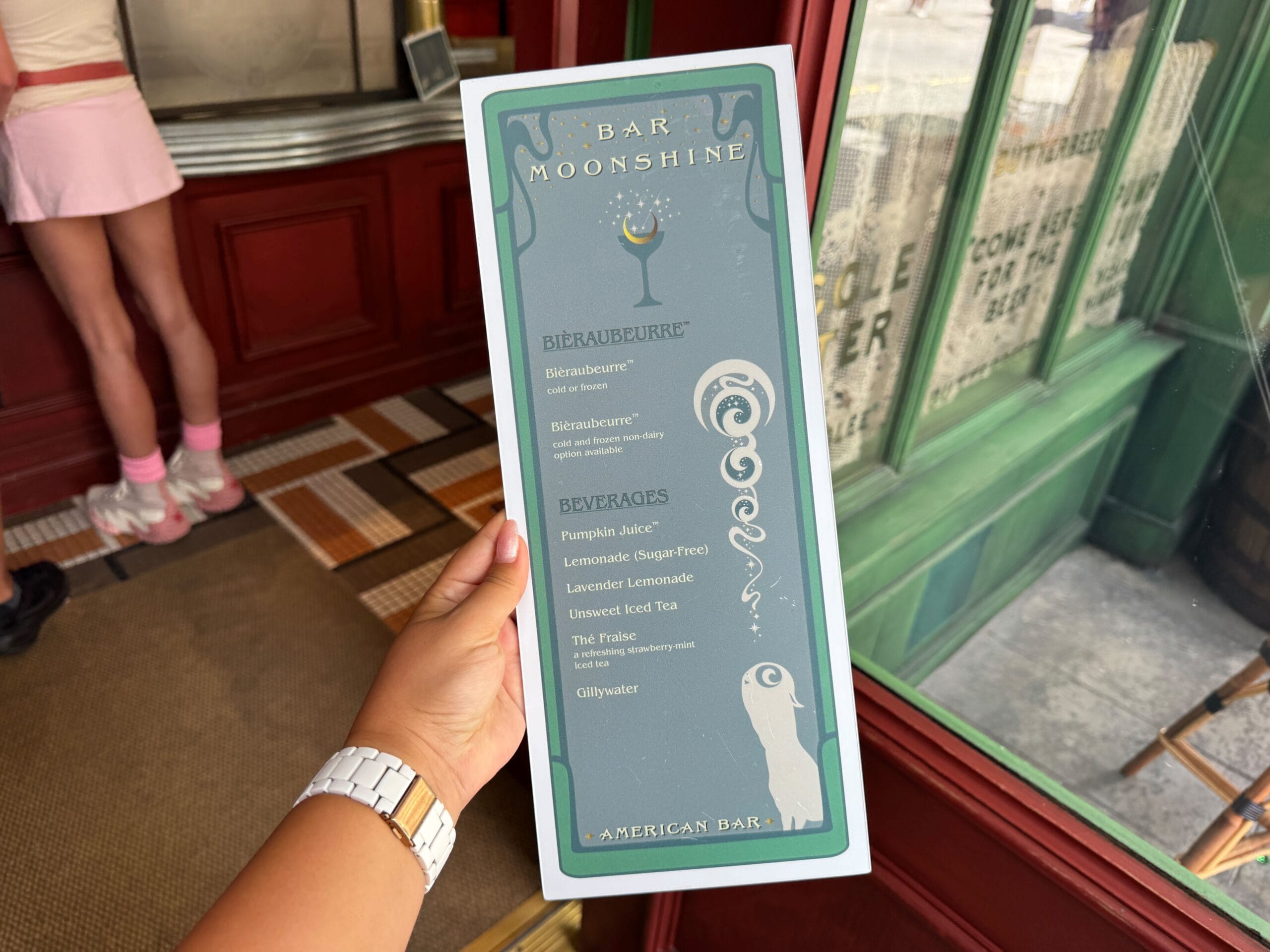 Bar Moonshine is a wizarding take on an American sports bar, specifically celebrating American Quidditch. Here, you’ll find American cocktails, alongside beer and wine.