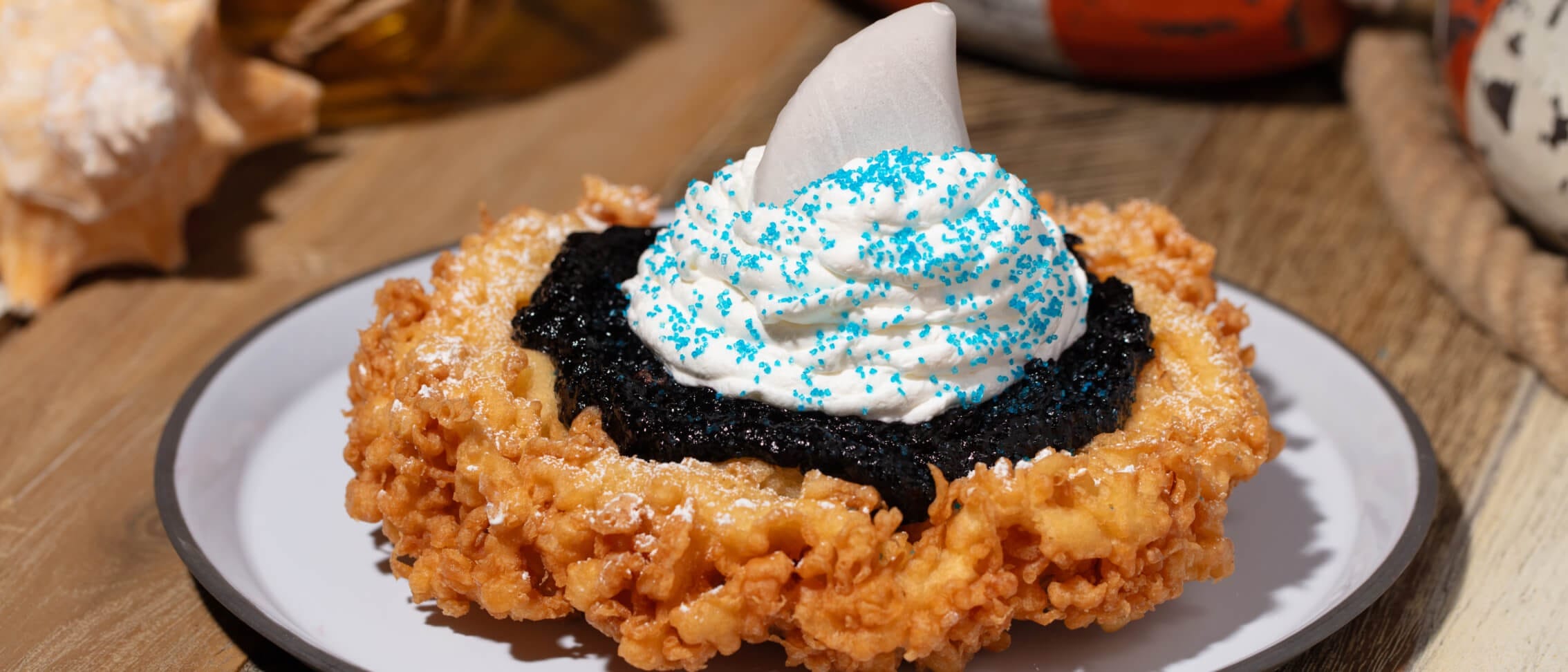 - Shark Fin Funnel Cake: Funnel cake topped with blueberry compote, whipped cream, blue sanding sugar, and a shark fin.