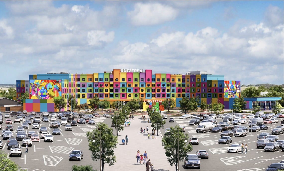 The on-site hotel, which does not have an official name yet, is expected to have 300 rooms. The updated concept art shows a multicolored, five-story building with murals of Universal characters on the ends of each wing.