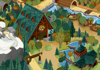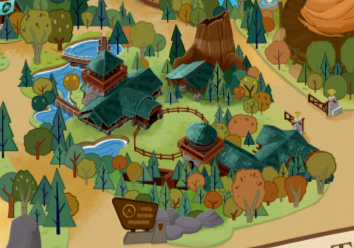 A fun map shows cabins, trees, waterfalls, and a building with a triangular green roof in a camp setting.