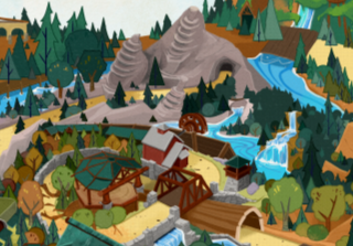 Where the river seems to flow from Tiana’s Bayou Adventure, it travels down into Piston Peak National Park. There are a couple of waterfalls in the area, and there appears to be a water wheel.