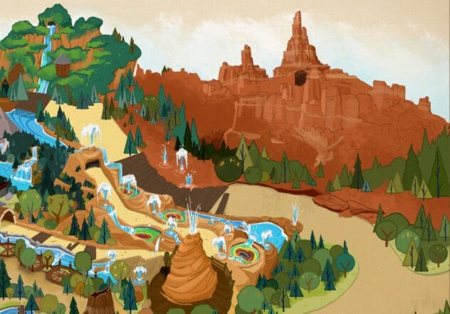 Guests will be able to experience the geyser field from the nearby town of Tumbleweed for the first time. As guests journey away from Big Thunder Mountain Railroad, the architecture will gradually become “Car-itecture,” and some of the geysers may appear tire-esque. A larger geyser, “The Old Tankful,” will erupt periodically.