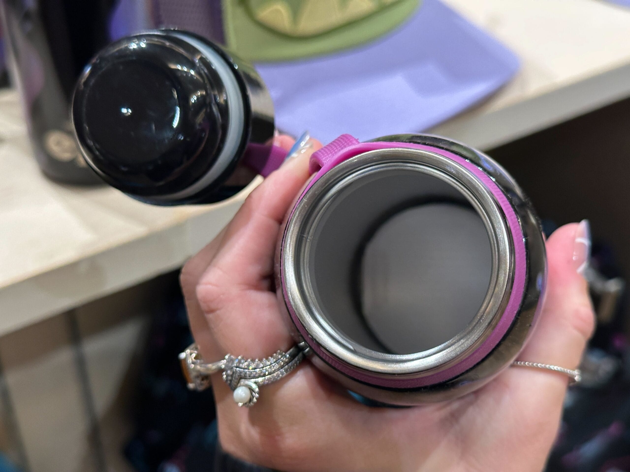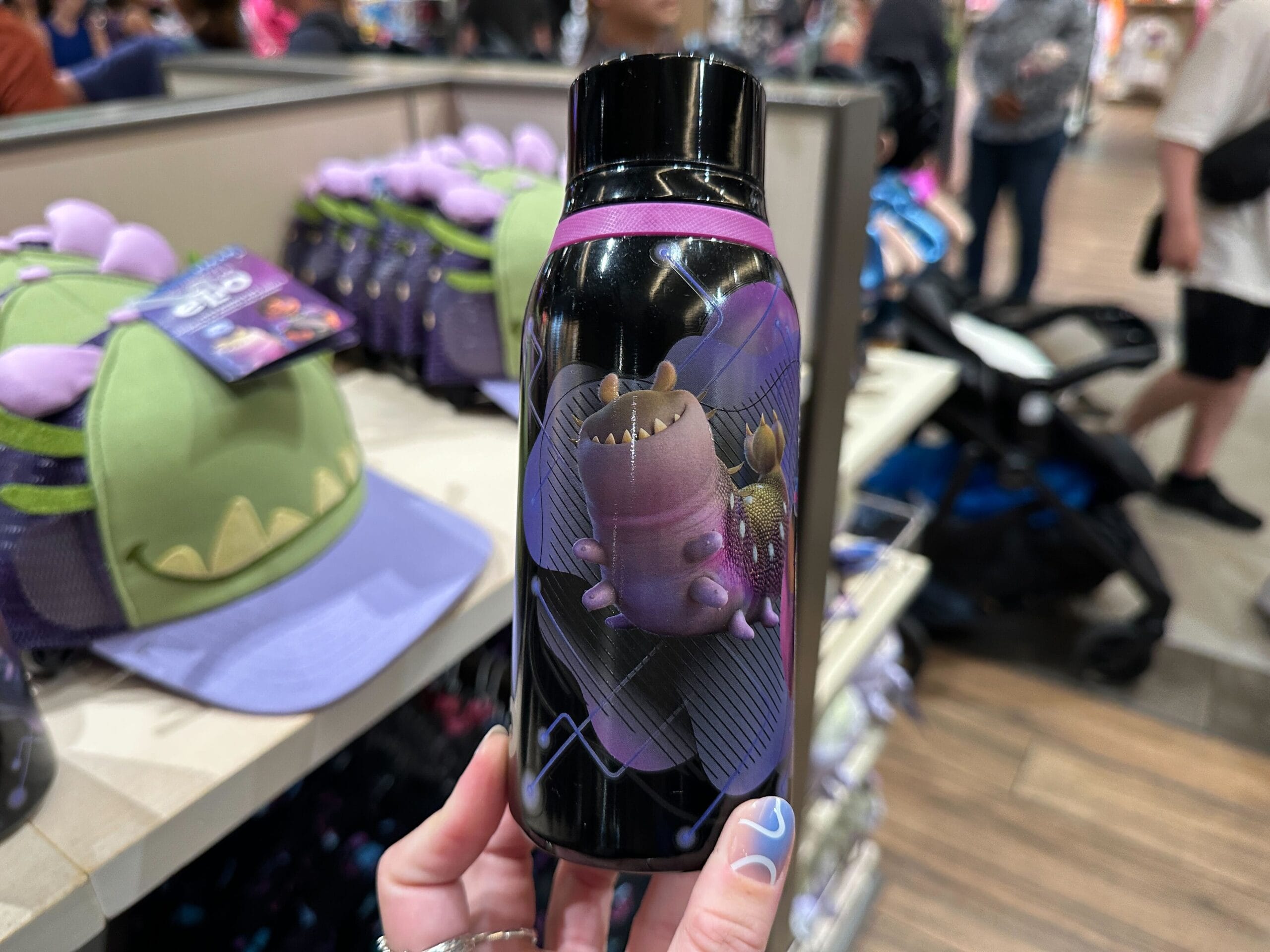 Elio and his new friend Glordon are pictured on this bottle against space-themed purple designs. The background is black and has a purple-pink silicone ring around the top, which attaches to the twist-off cap.