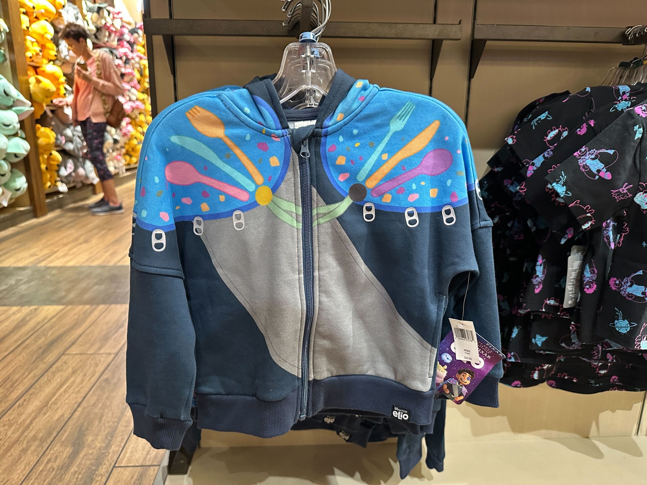 Inspired by Elio’s home-made space gear, this zip-up hoodie is printed with a gray stripe running diagonally across the chest and some cape details. Soda can tabs and cutlery make up the cape’s shoulder decorations. There are pockets on the side hems.