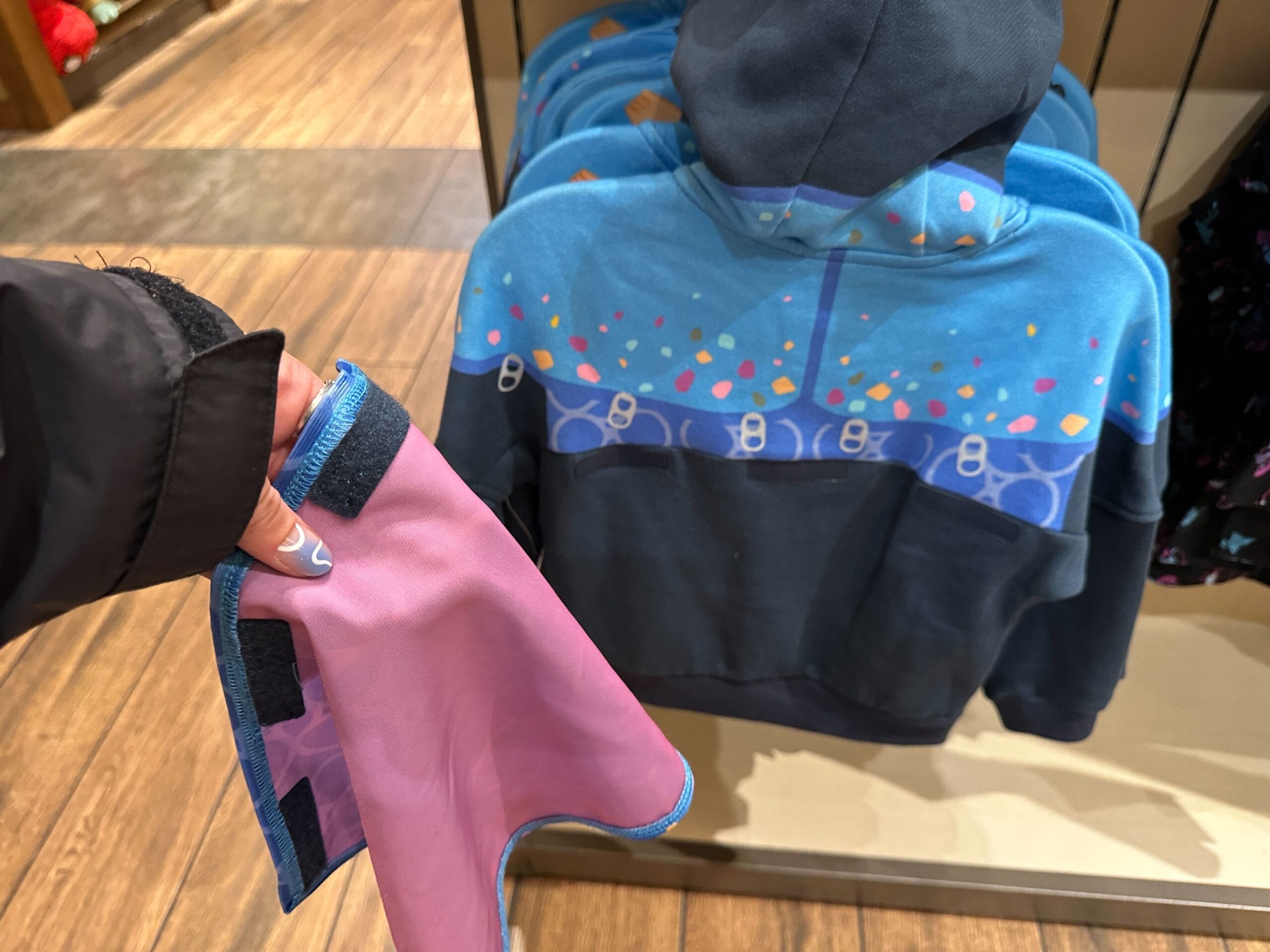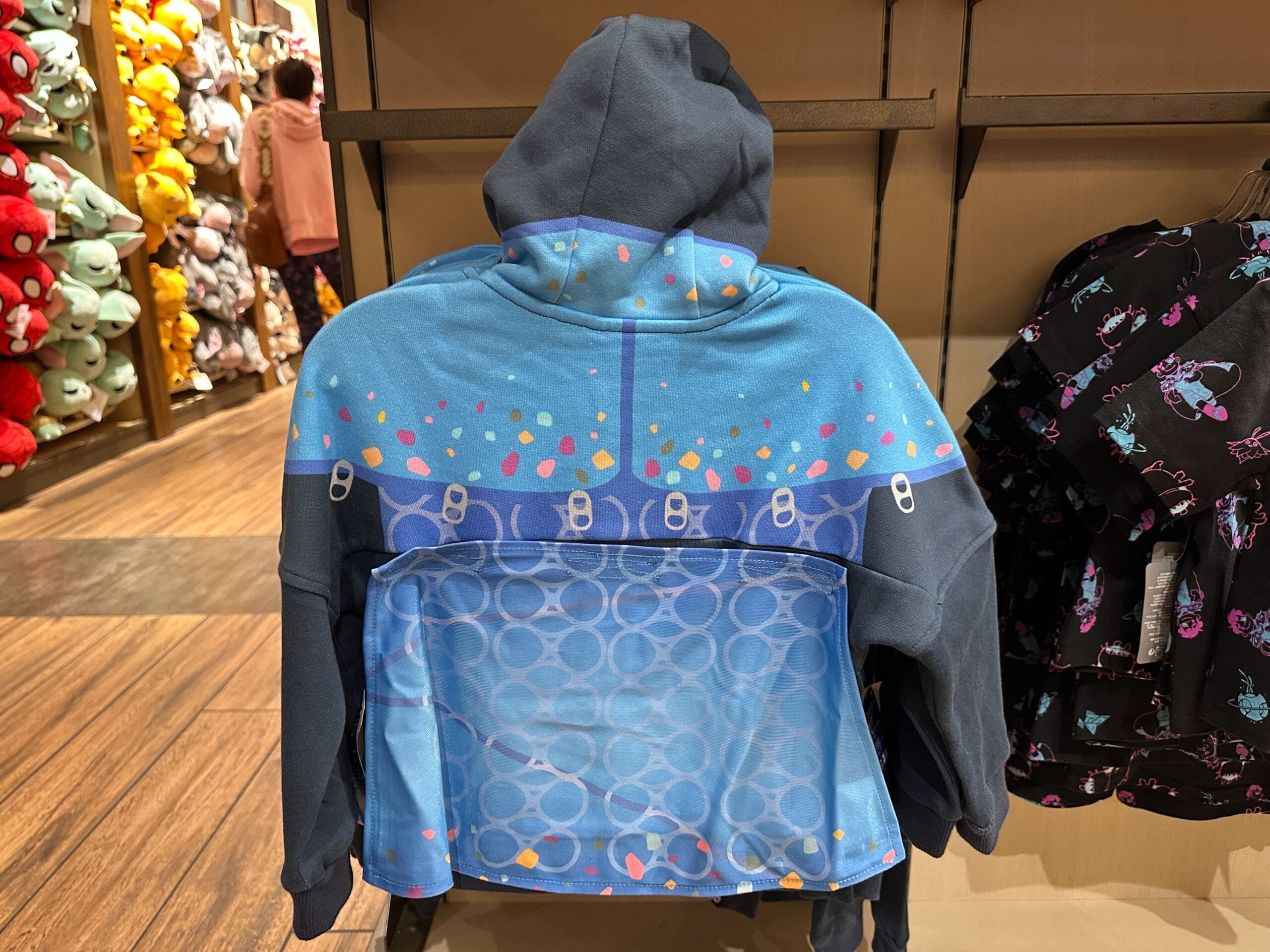 A Velcro removable cape is attached on the back. It’s blue with printed soda ring decorations and confetti dots.