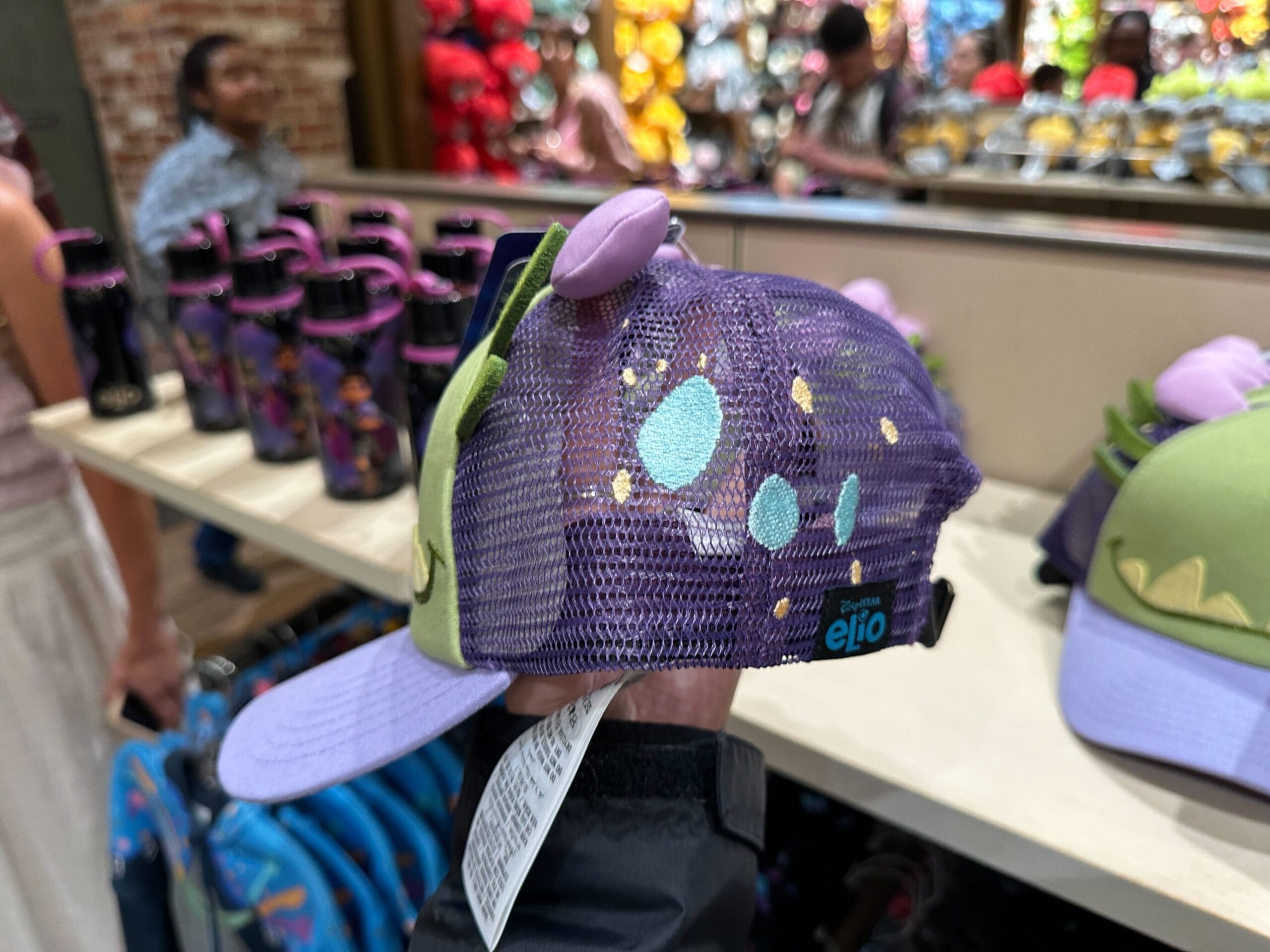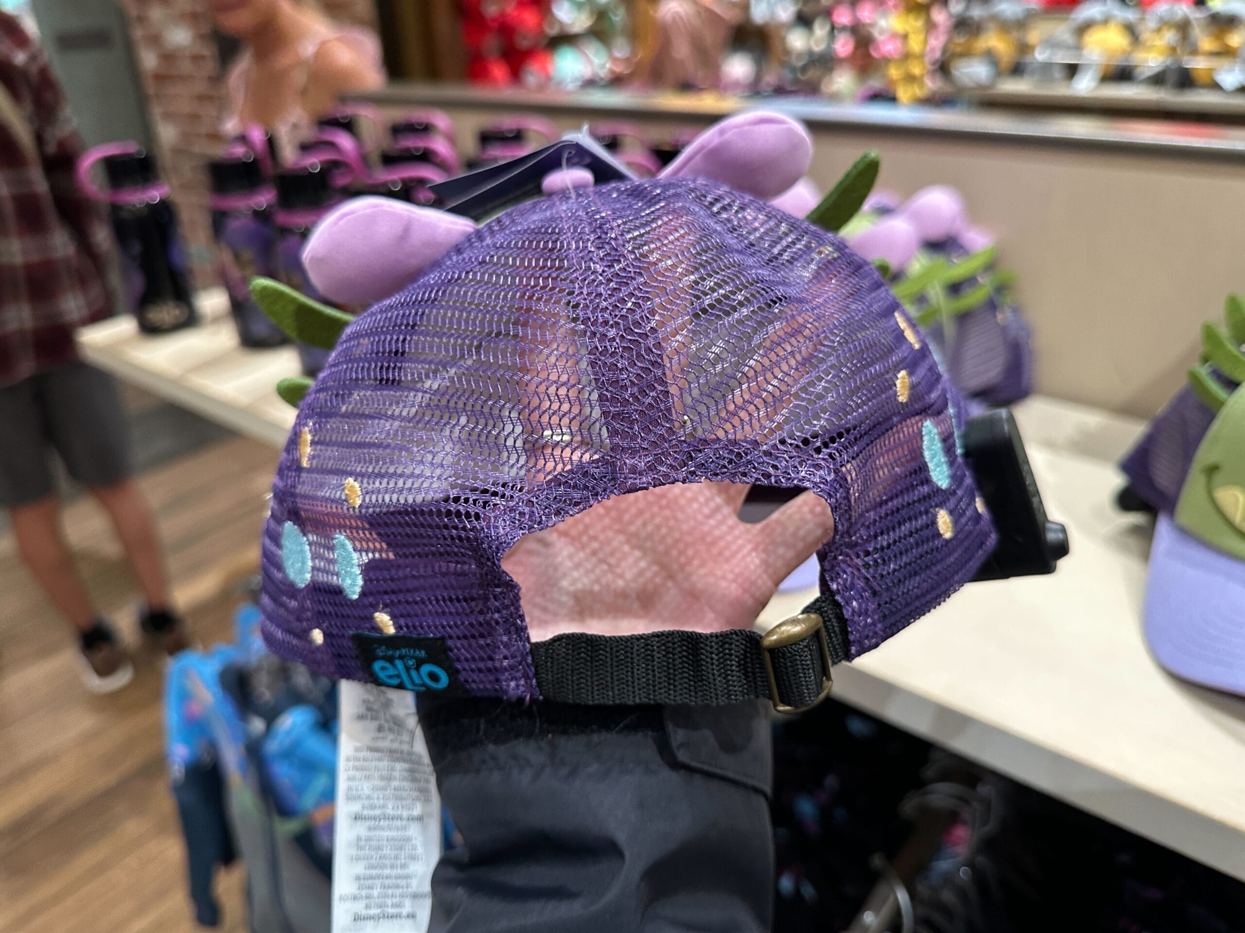 The brim is light purple. Felt antennae stick out of the front panel and padded purple ears are attached on top. The back half of the hat is purple mesh with embroidered blue and beige spots. It has an adjustable black strap and an “Elio” tag on the hem.