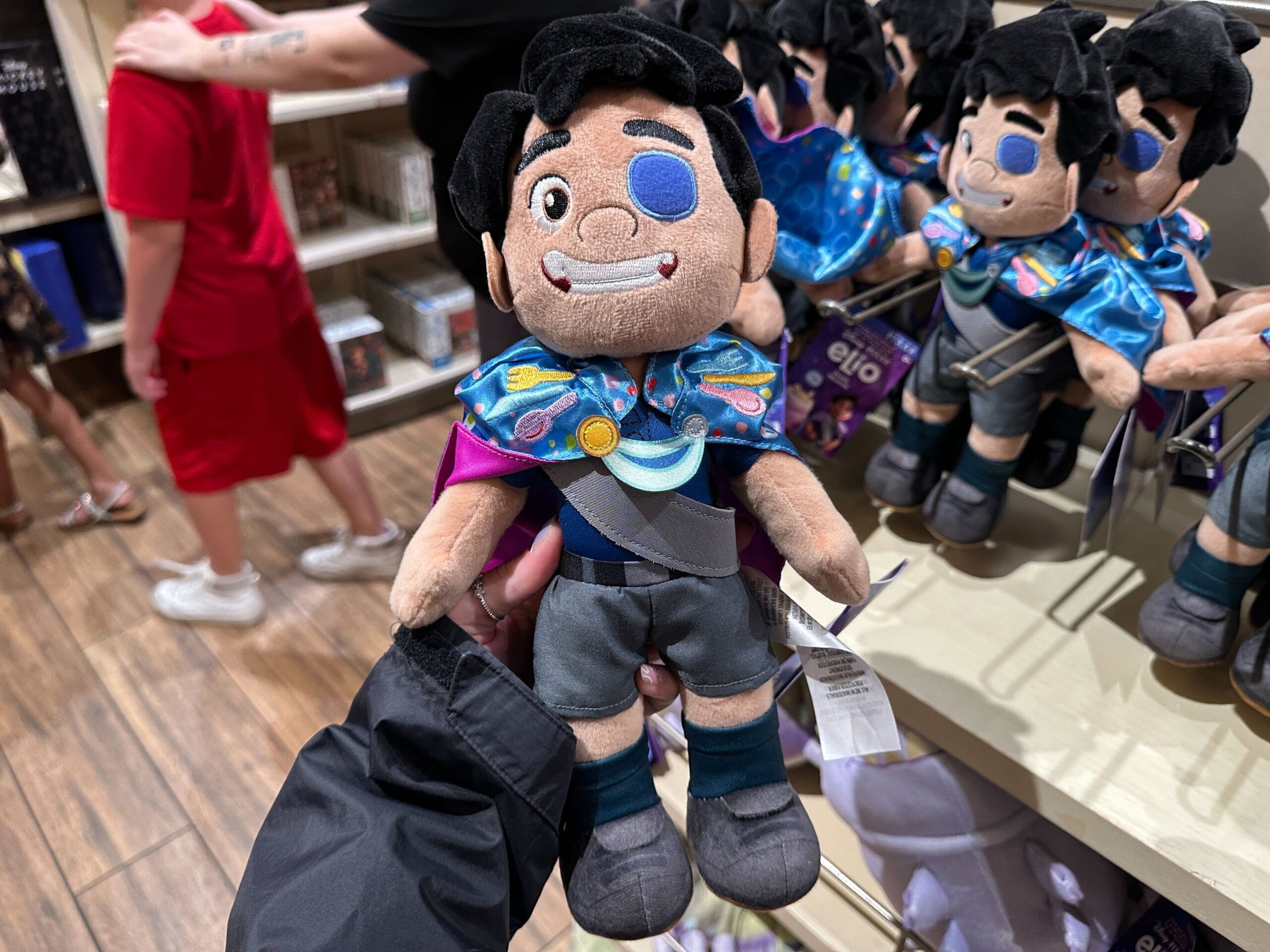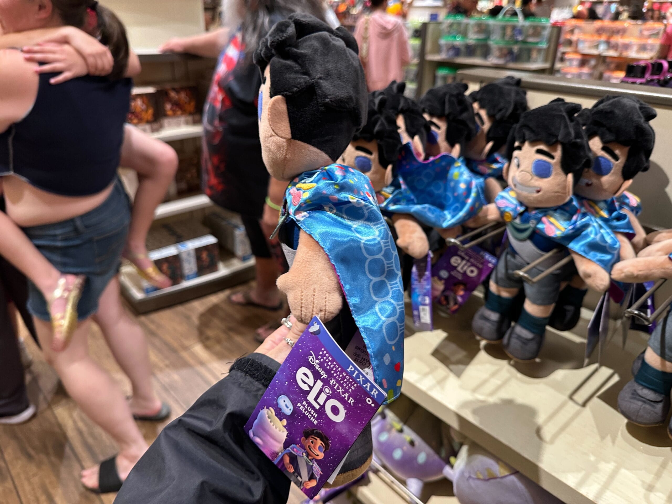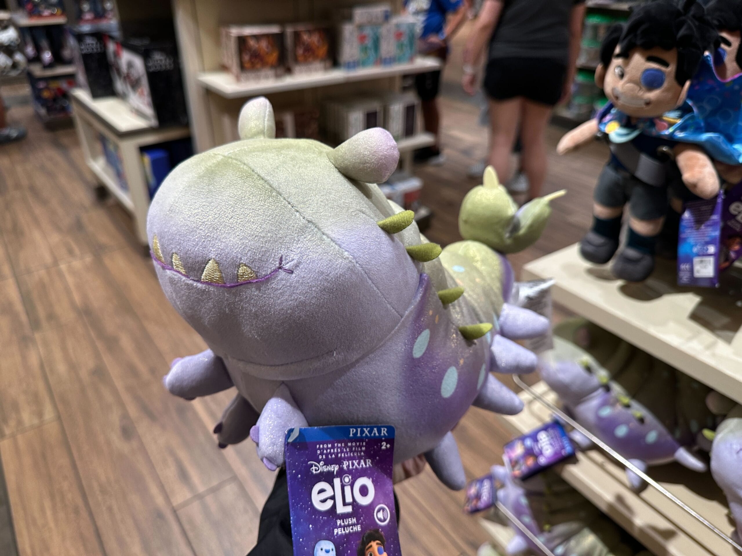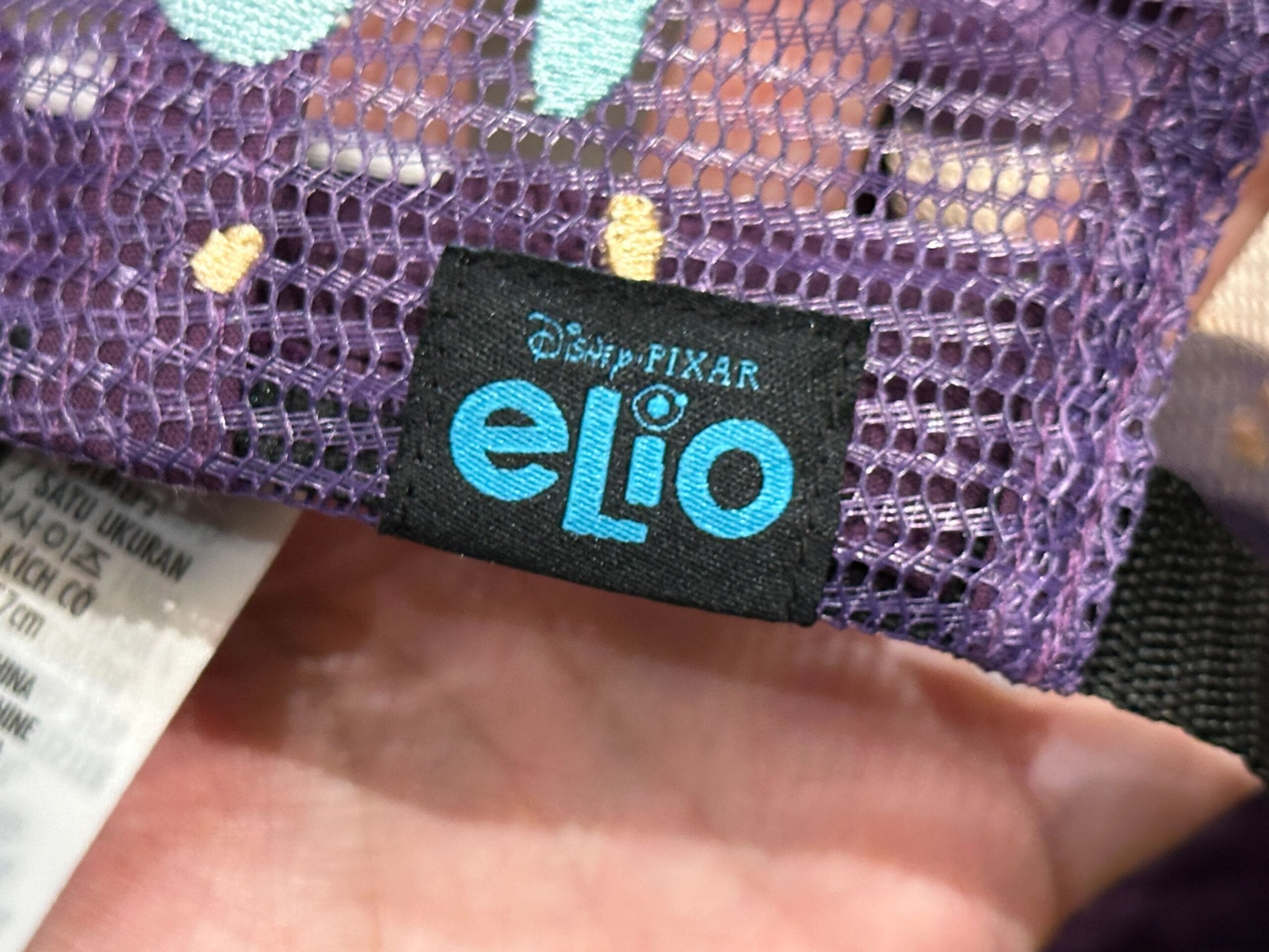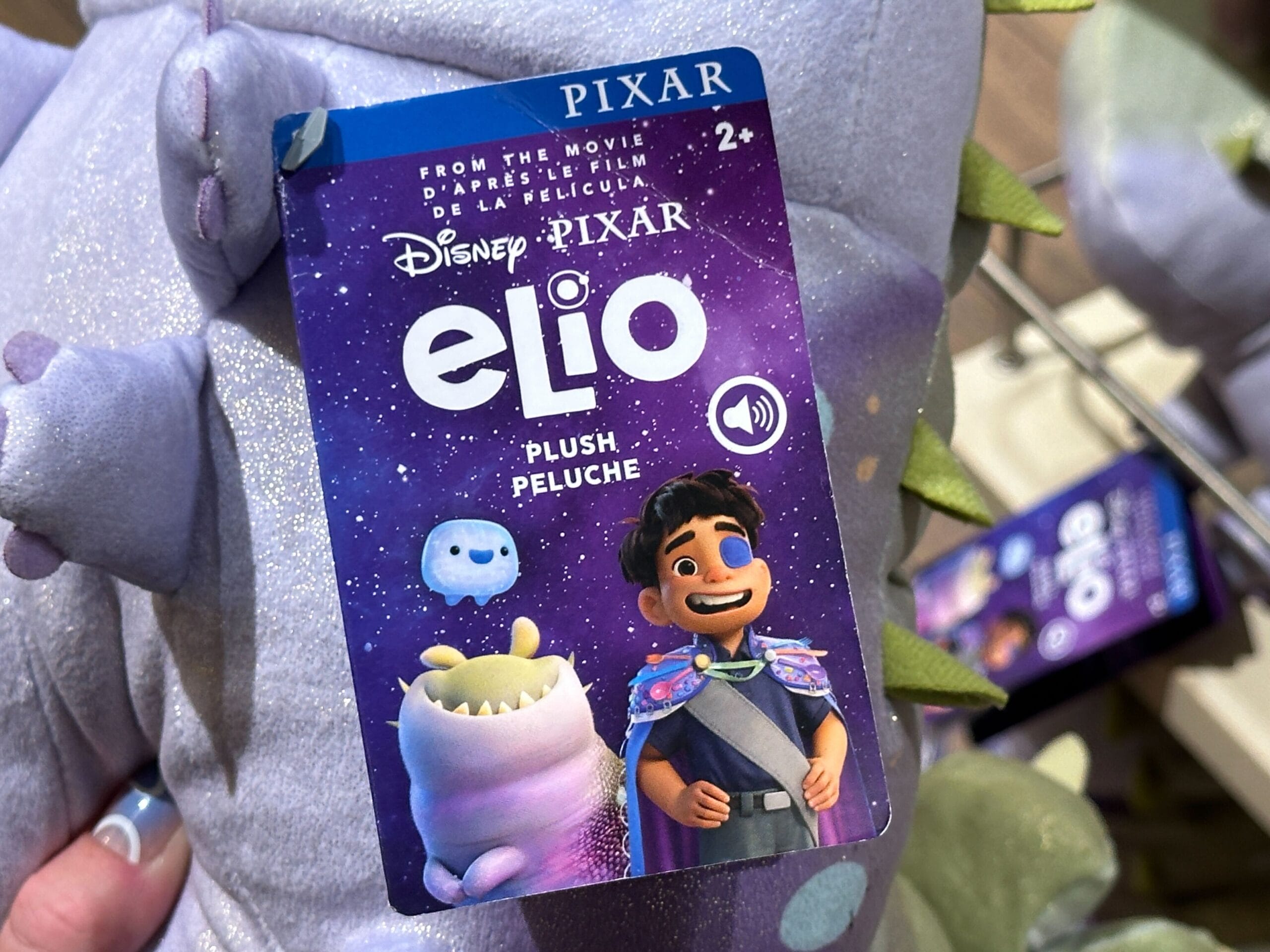 A close-up of a plush toy tag for Disney Pixar’s "Elio," featuring colorful characters and movie branding.