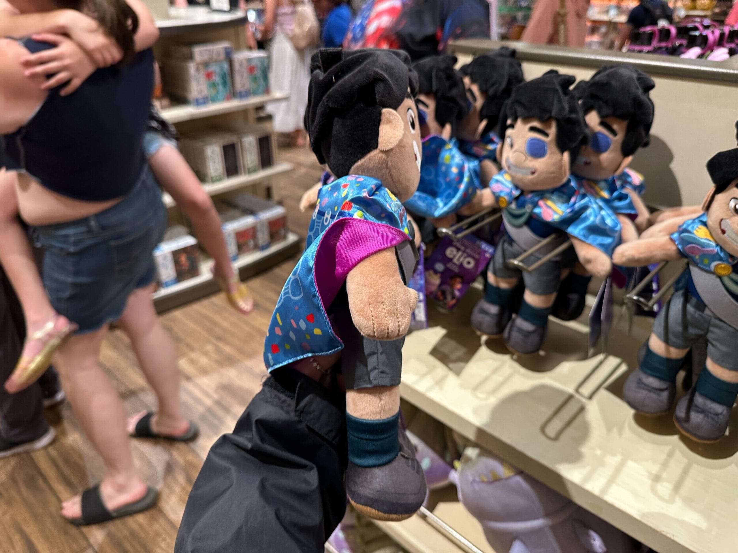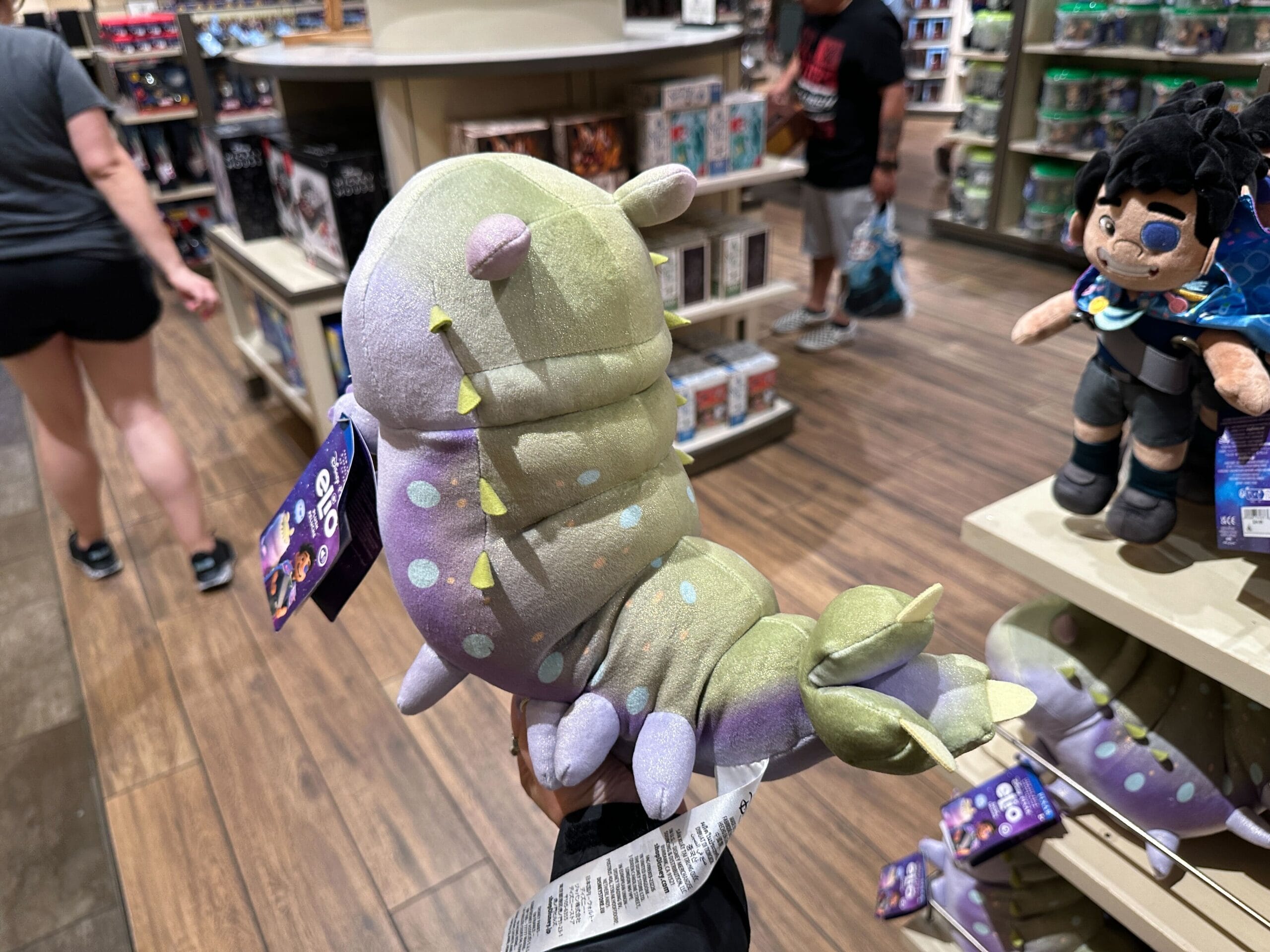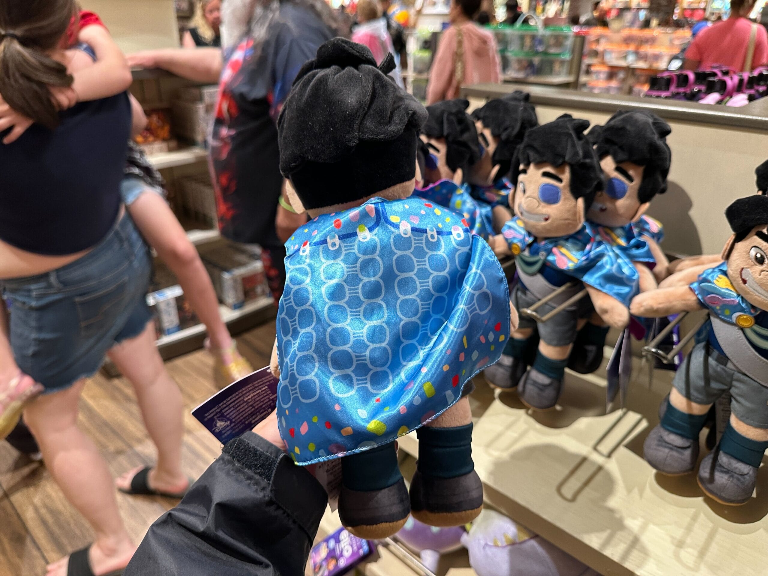 A hand holds a plush toy of Luz from "The Owl House" in a store, with more plushies and shoppers in the background.