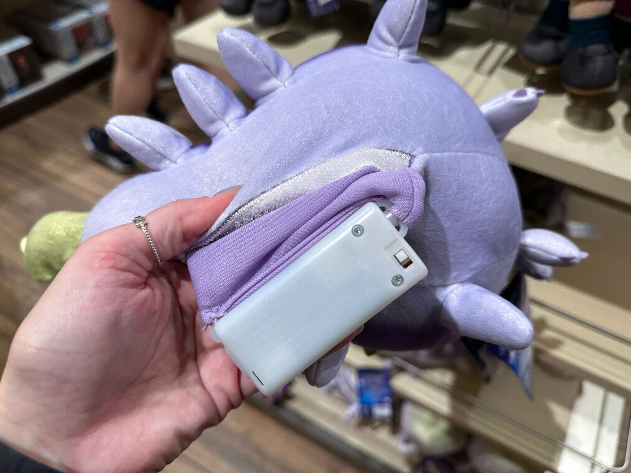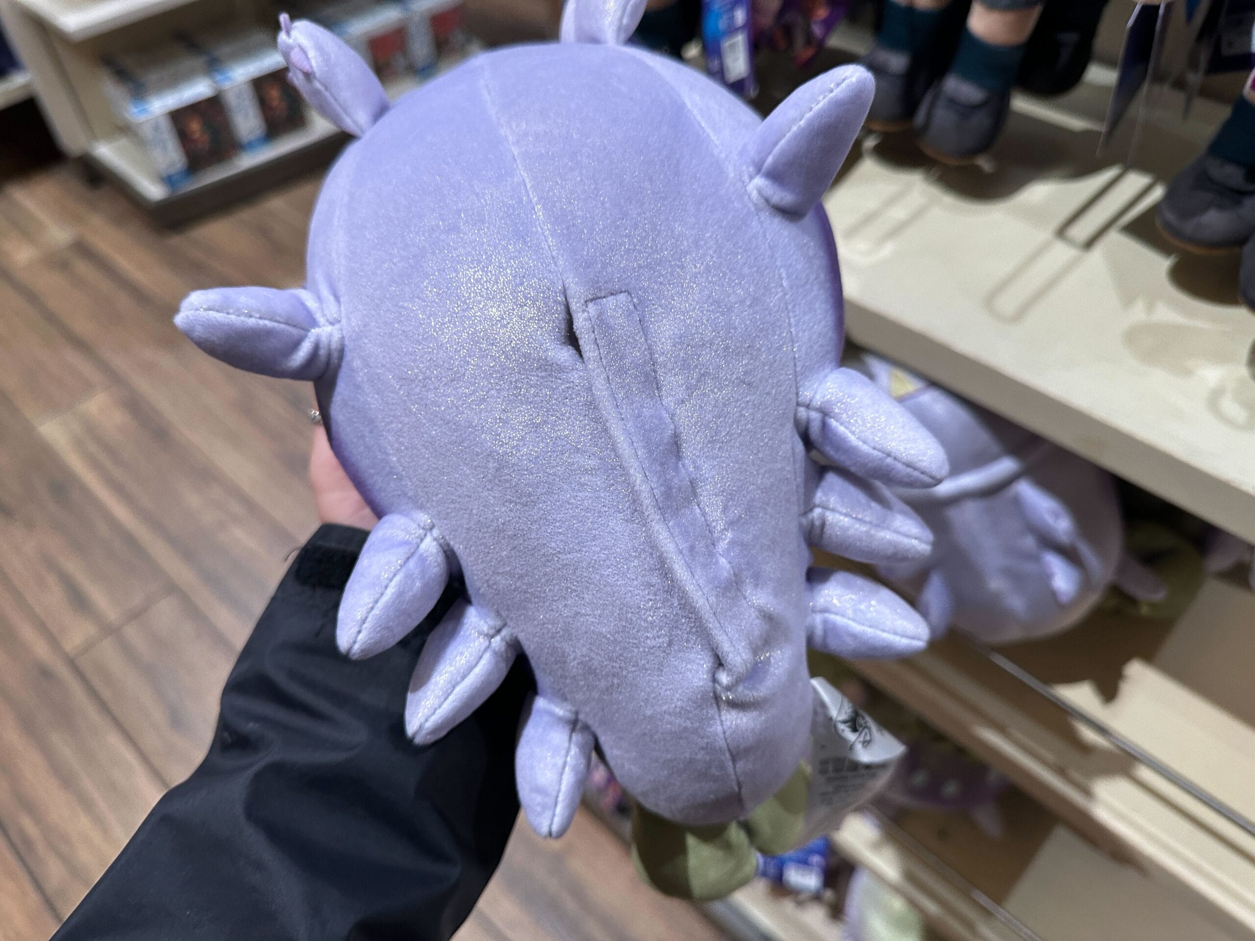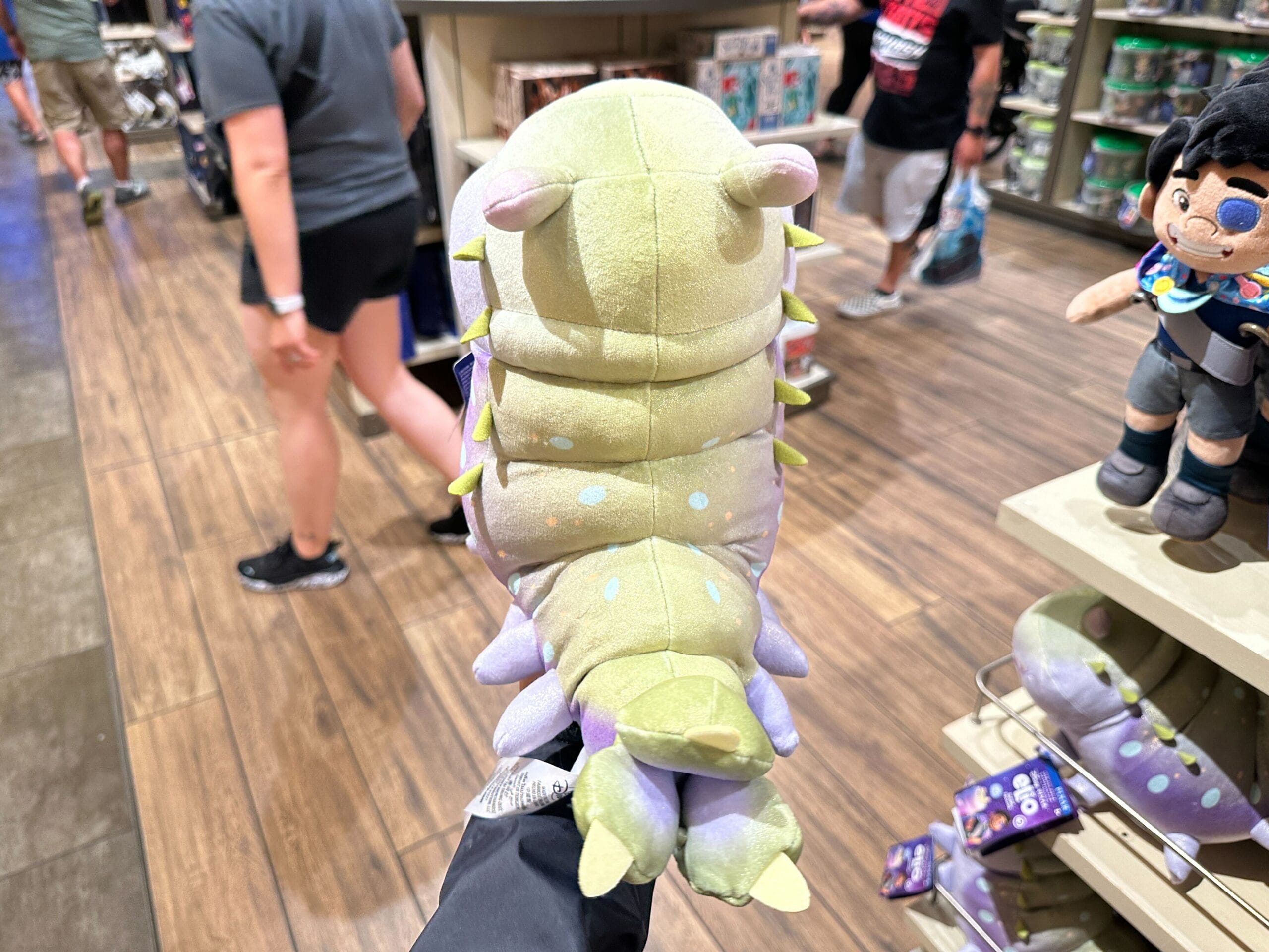 A hand holds a plush toy of Luz from "The Owl House" in a store, with more plushies and shoppers in the background.
