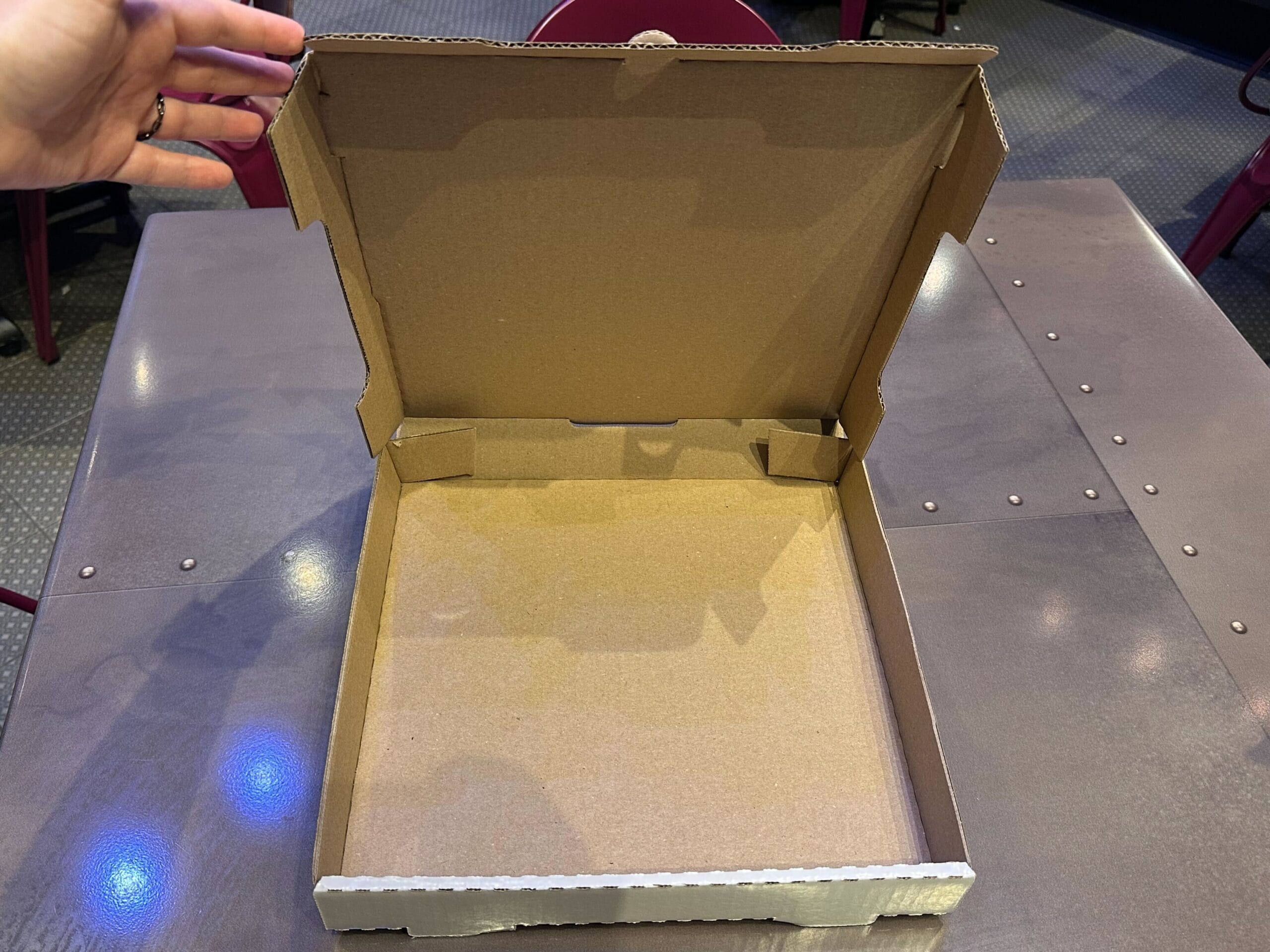 The rest of the box is a standard to-go pizza box, with white on the sides and plain cardboard for the interior.