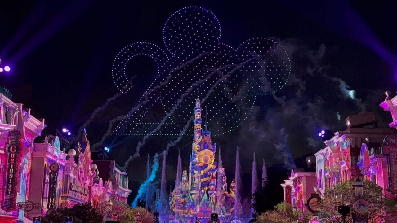 The show now begins with drones creating the anniversary’s “20” logo, which has a Mickey icon replacing the “0,” behind the Castle of Magical Dreams.