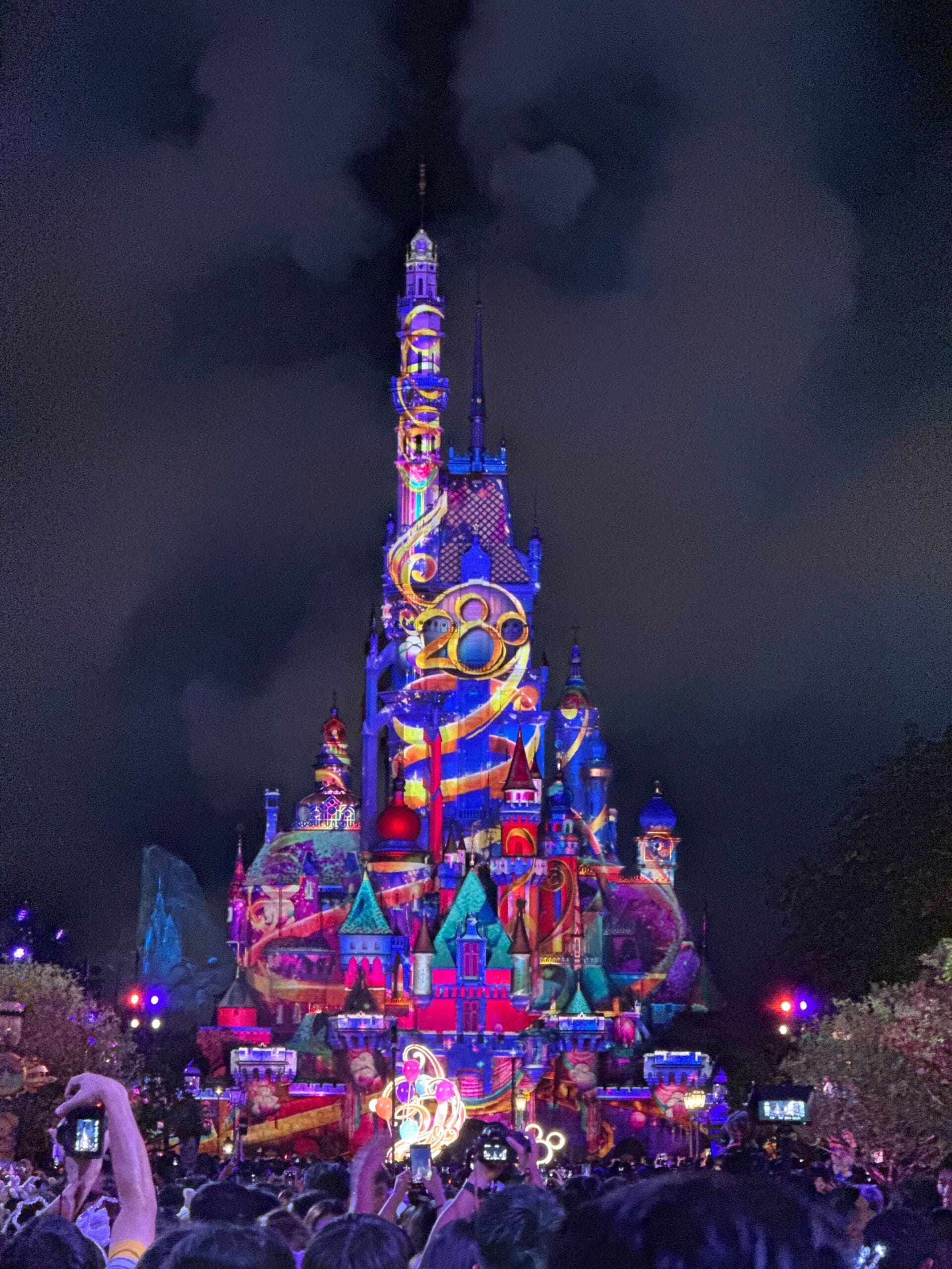 Crowd enjoys a Nighttime Spectacular of fireworks and the 20th Anniversary Drone Pre-Show above a castle, phones held high.