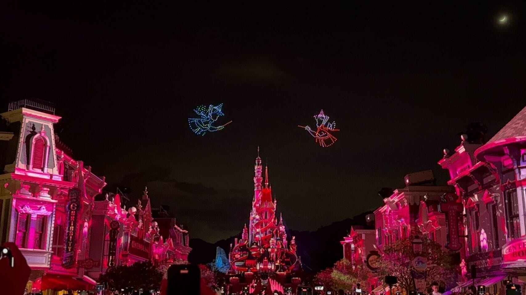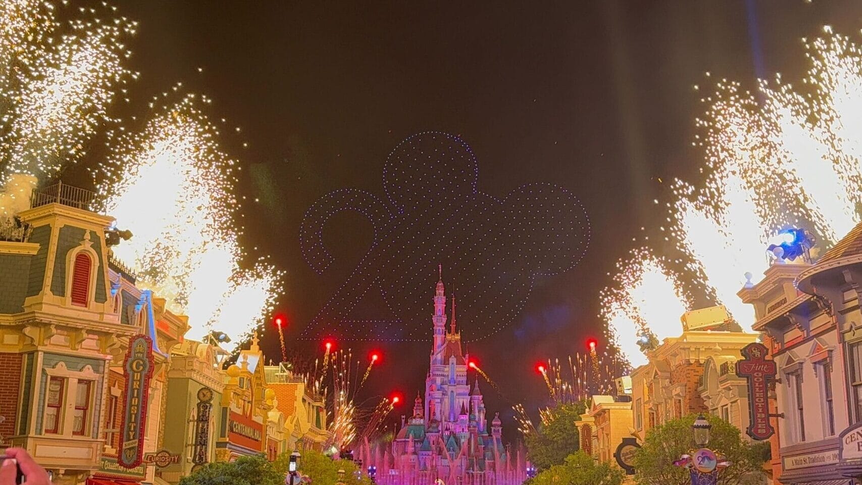 Nighttime Spectacular at Disneyland: Main Street glows red as the 20th Anniversary Drone Pre-Show dazzles above the castle.