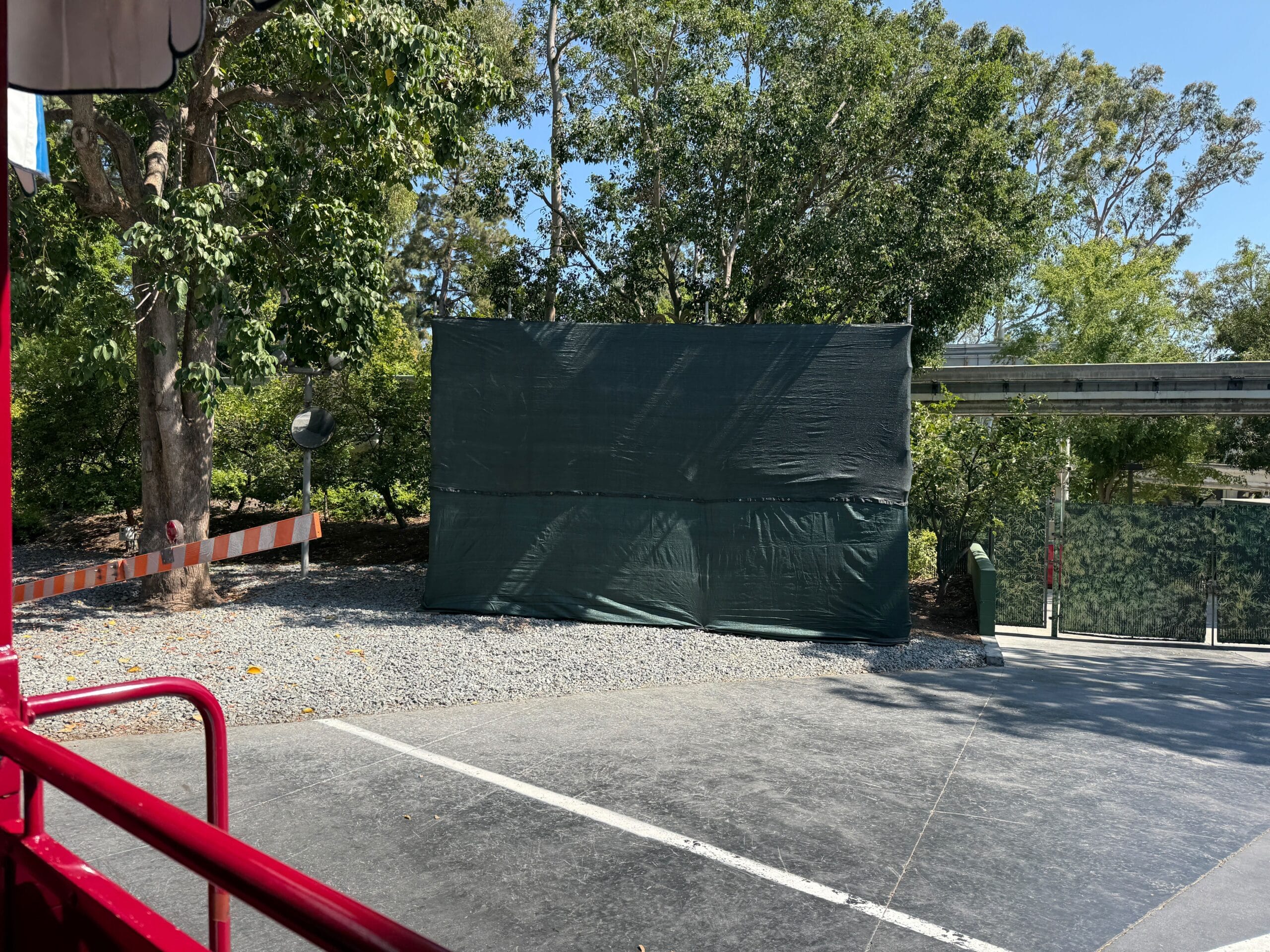 The “Agrifuture” billboard visible on the Disneyland Railroad is now surrounded by scaffolding and scrim, presumably for a refurbishment.