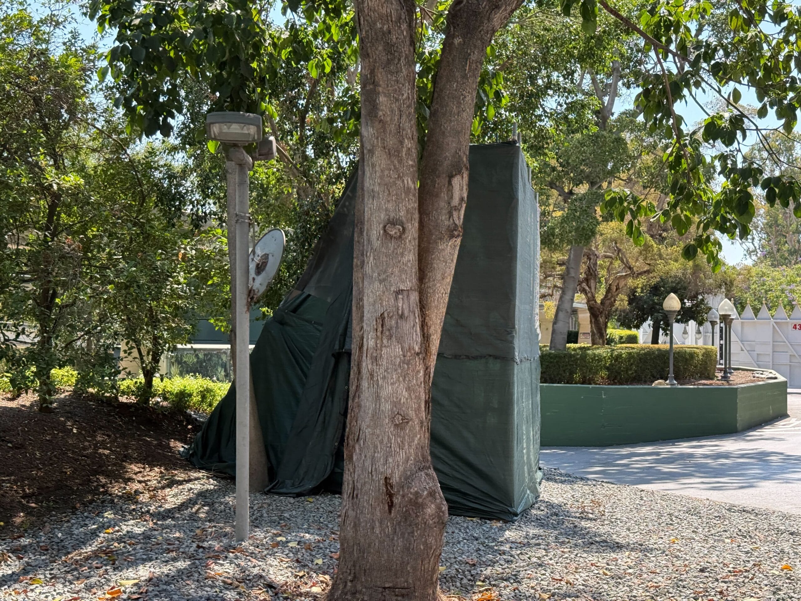 The scrim extends behind the billboard, fully covering its supports. The billboard is likely undergoing regular maintenance, like getting a new paint job. Below is our photo of the billboard from earlier this year.