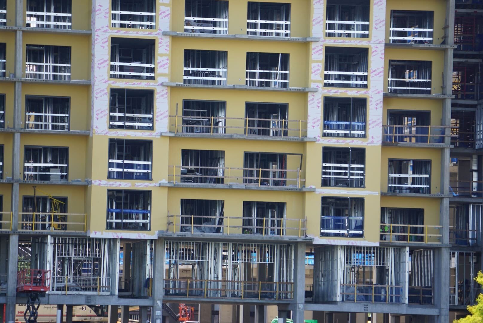 A multi-story building under construction with yellow air and water barrier-covered walls and exposed metal framework.
