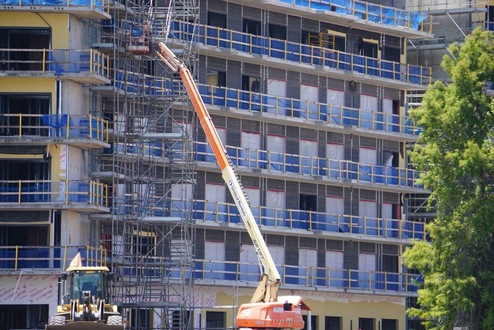 Construction site with a multi-story building, scaffolding, and a cherry picker lift near the structure.