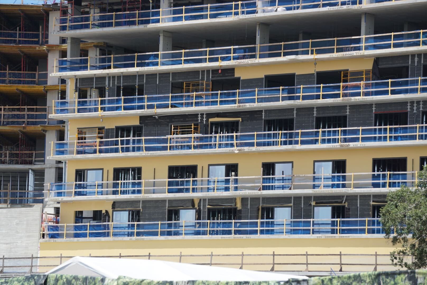 More sliding glass doors have also been installed on this side of the resort. Through the windows and openings, the frames of future walls are visible on some floors. The highest floors don’t yet have these supports.