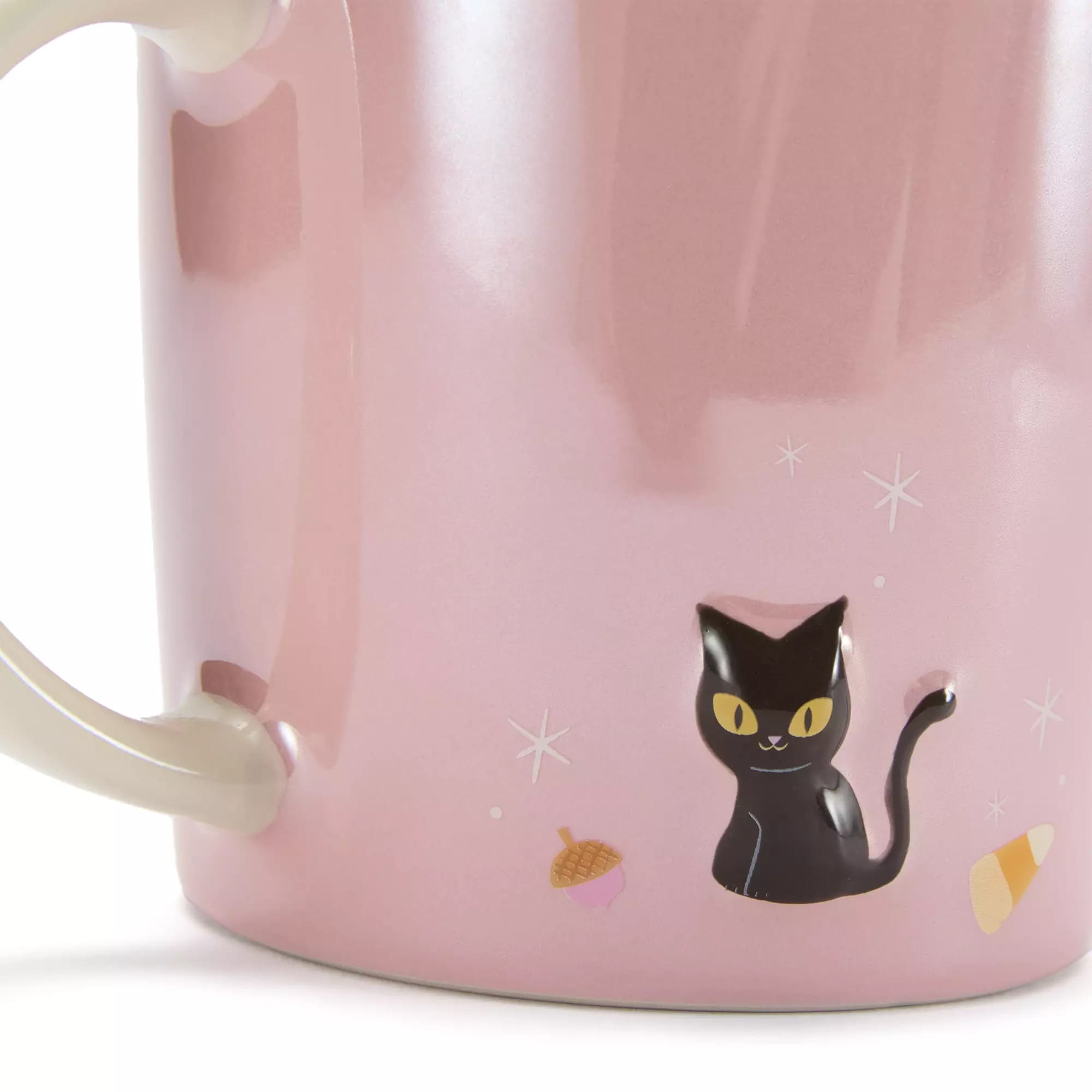 This ceramic mug has a pearlescent gloss glaze. It’s pink with a white handle. On one side is a raised Minnie ghost. A raised black cat is on the reverse. Both images have pixie dust accents around them. An acorn and piece of candy corn are next to the cat.