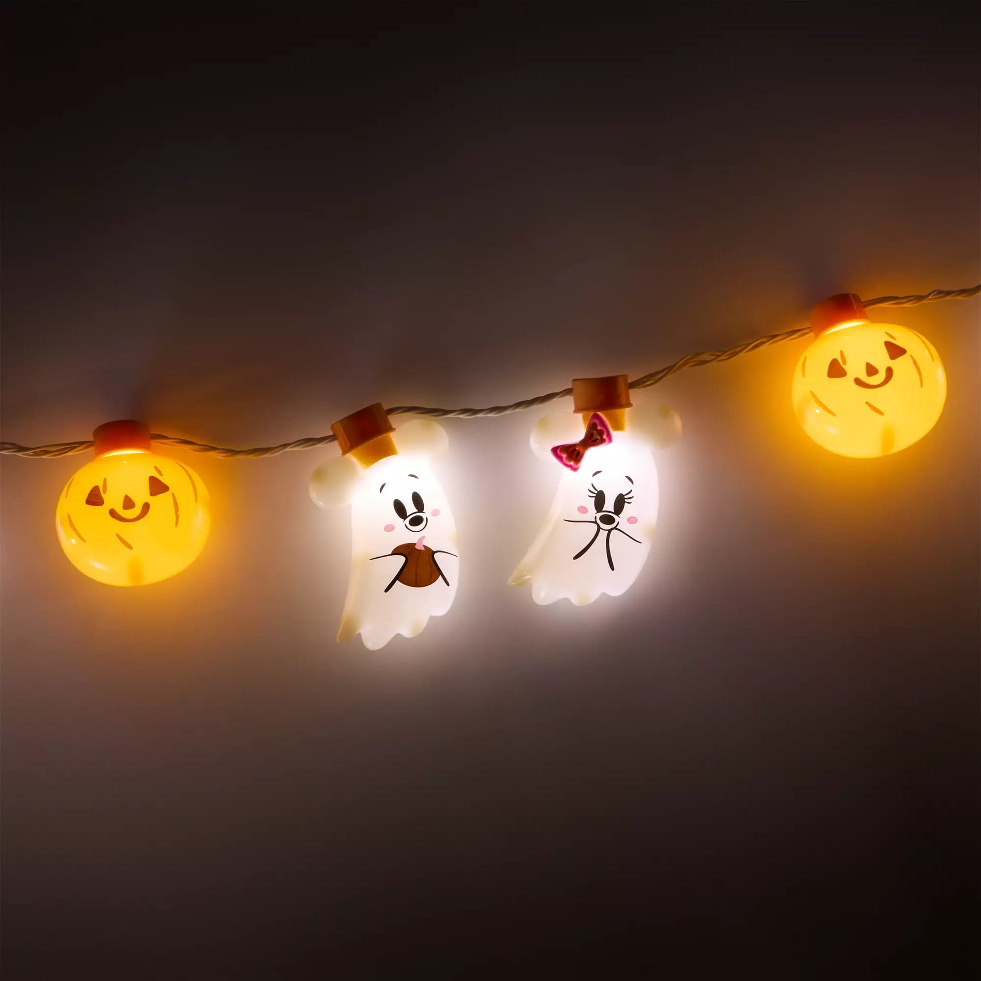 This glow necklace is made up of three Mickey ghosts, three Minnie ghosts, and three smiling jack-o’-lanterns. There are six different light modes, activated by the on/off button on the battery pack attached to the necklace. The necklace is for ages 3+.