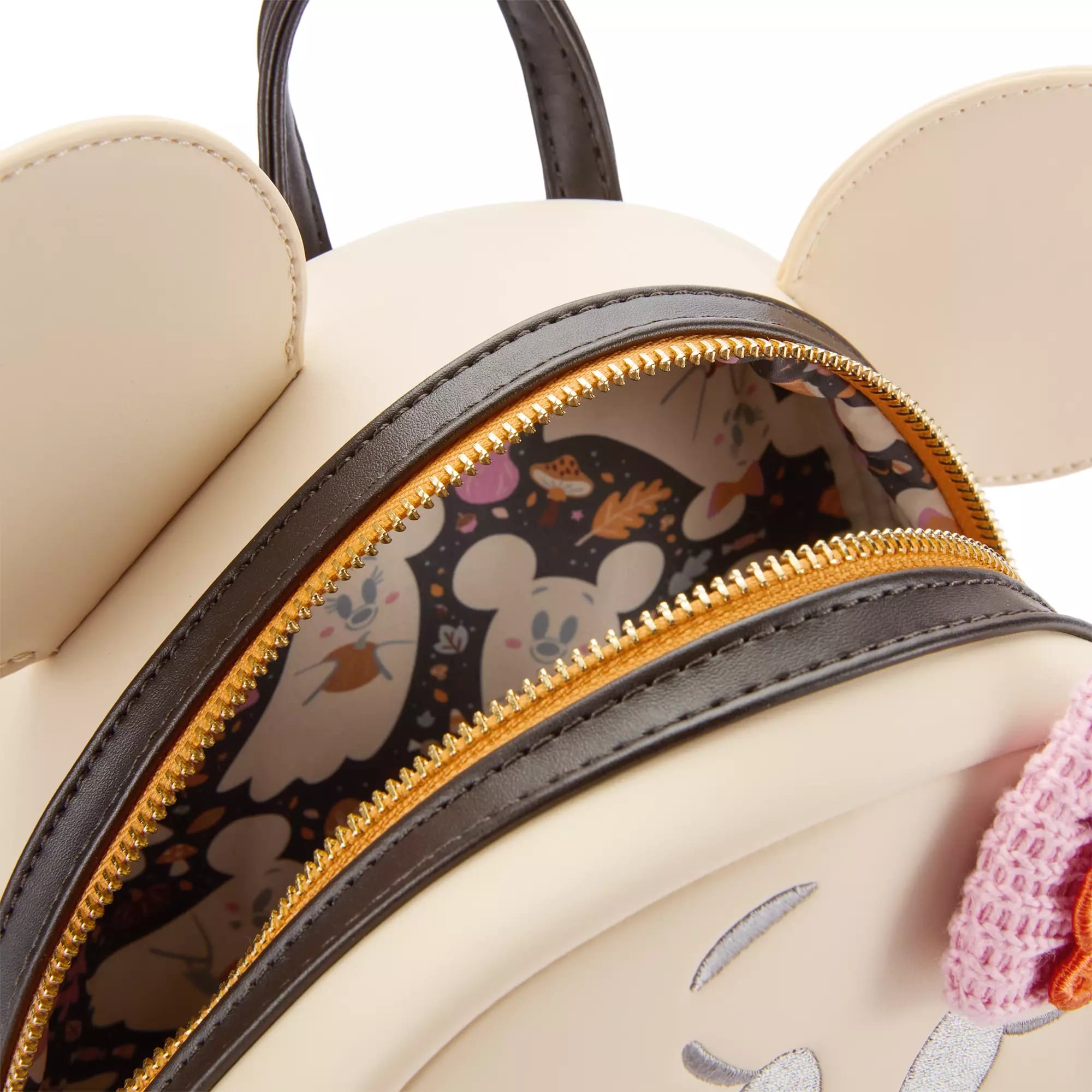 The interior lining is black with Minnie and Mickey ghosts, stars, autumn leaves, candy corn, and more. It has a front zip pocket, a double-zip main compartment, and two side slip pockets.