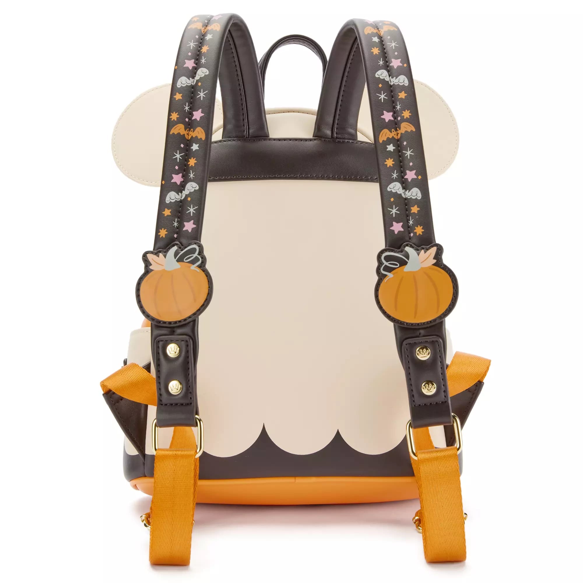 The black shoulder straps feature an orange, white, and pink print of bats and stars. Die-cut pumpkins are above the hardware. The adjustable sections of the straps are orange. It has gold-tone hardware.
