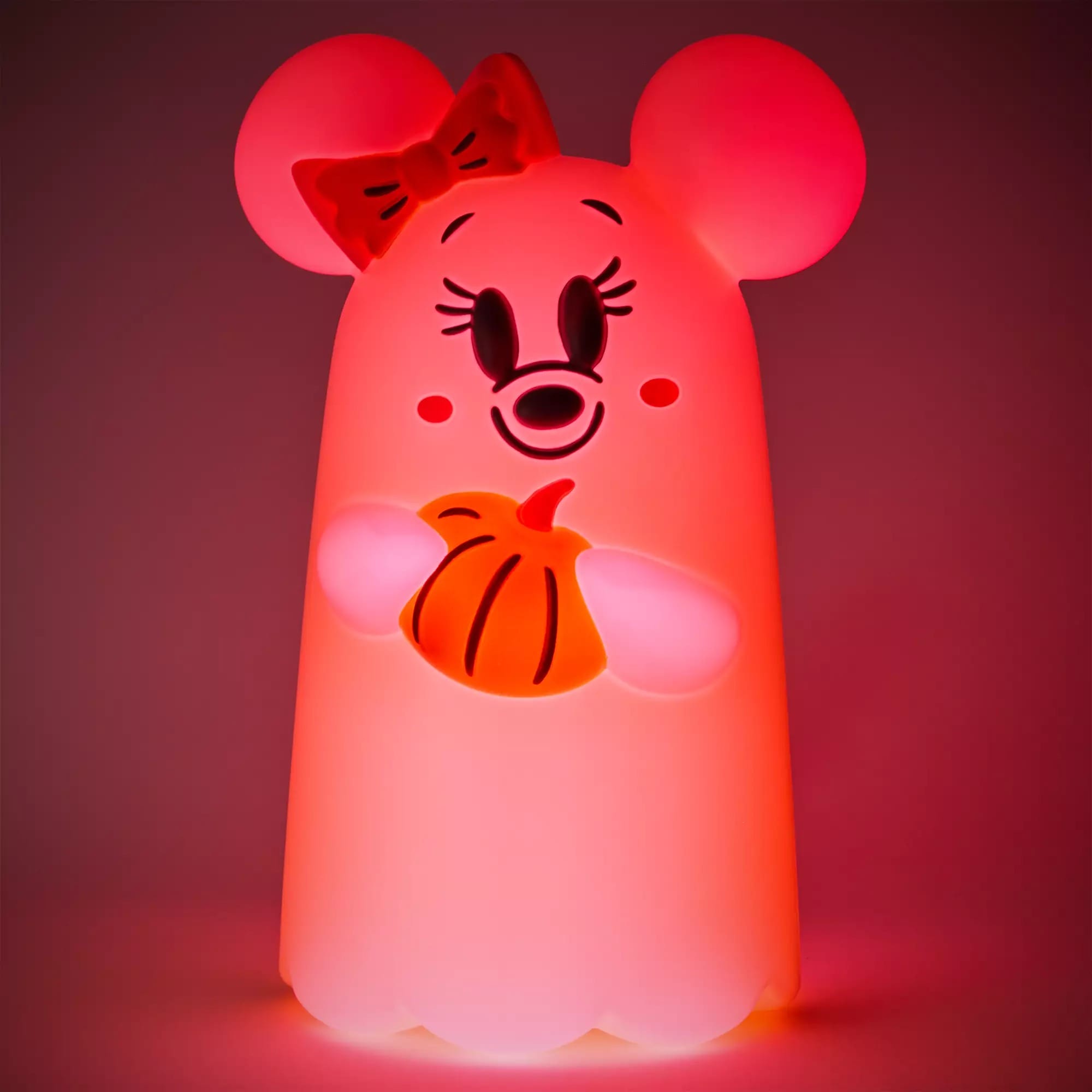This is a molded PVC figure of a Minnie ghost holding a pumpkin. It has ears, a pink and orange bow, gray features, and pink blush. The on/off switch is on the underside of the figure. The light alternates between red and yellow.