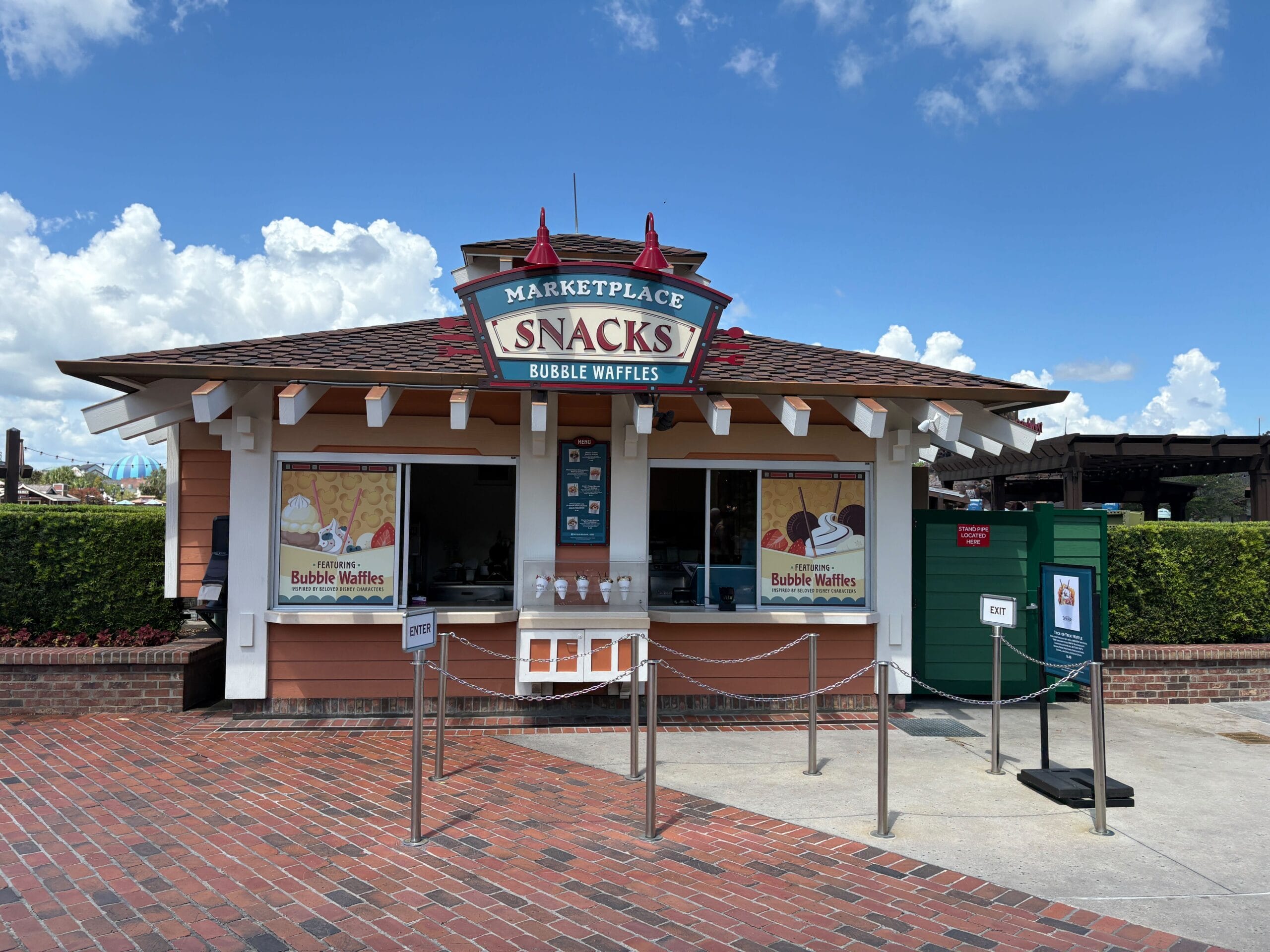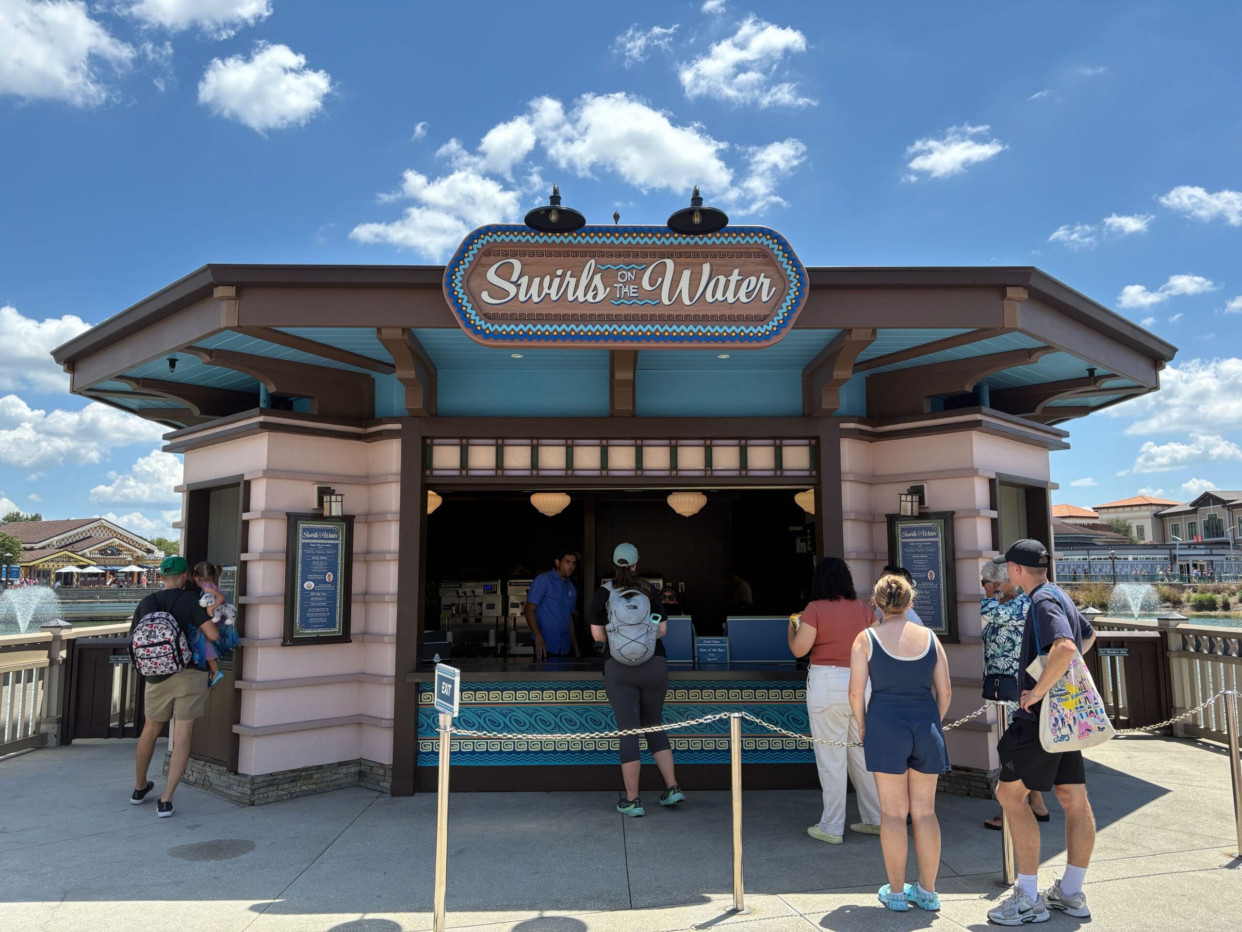 Swirls on the Water is located in the Marketplace, near the bridge entrance beside Rainforest Cafe.