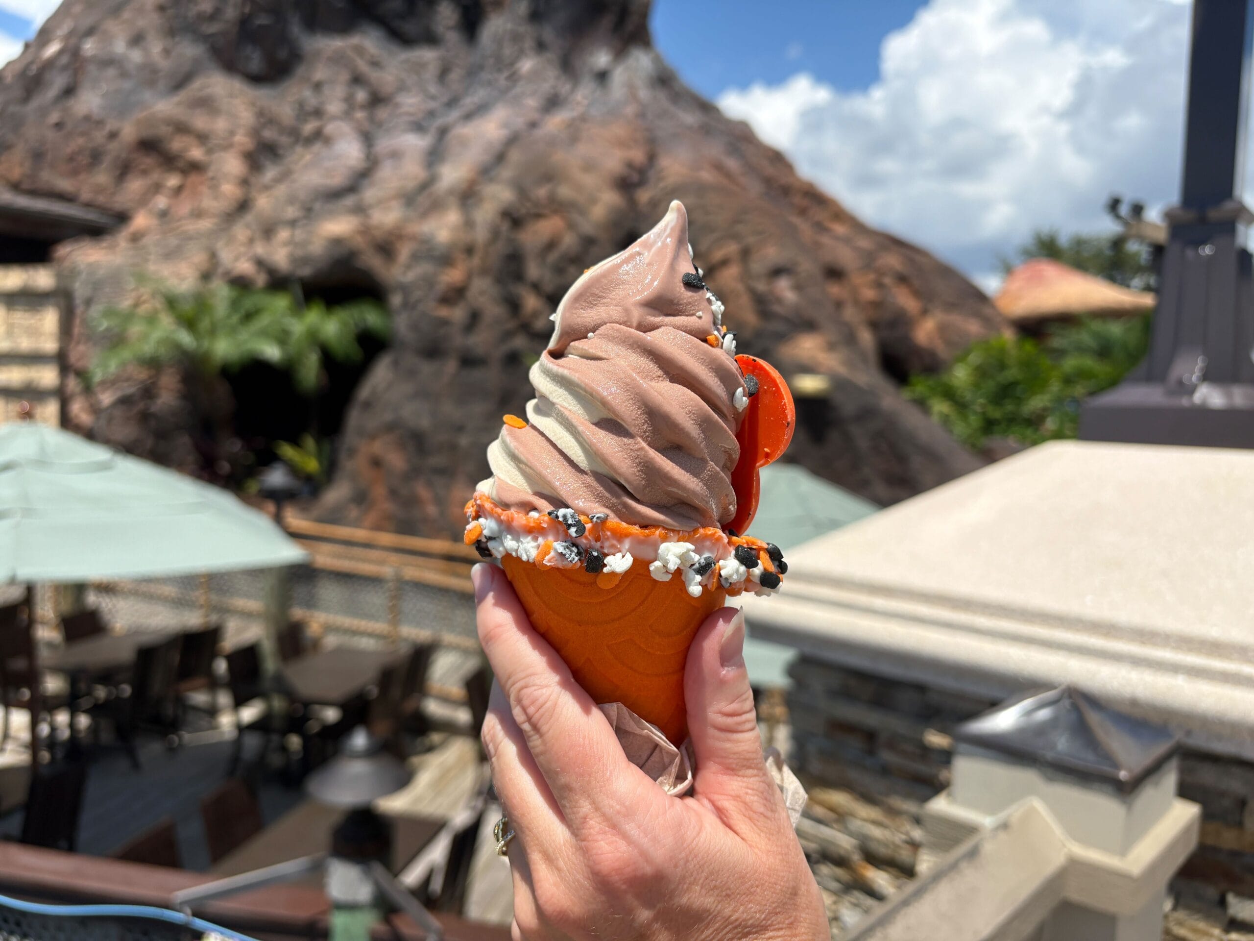 Marshmallow, chocolate soft-serve, pumpkin waffle cone, Halloween sprinkles, and a white chocolate piece