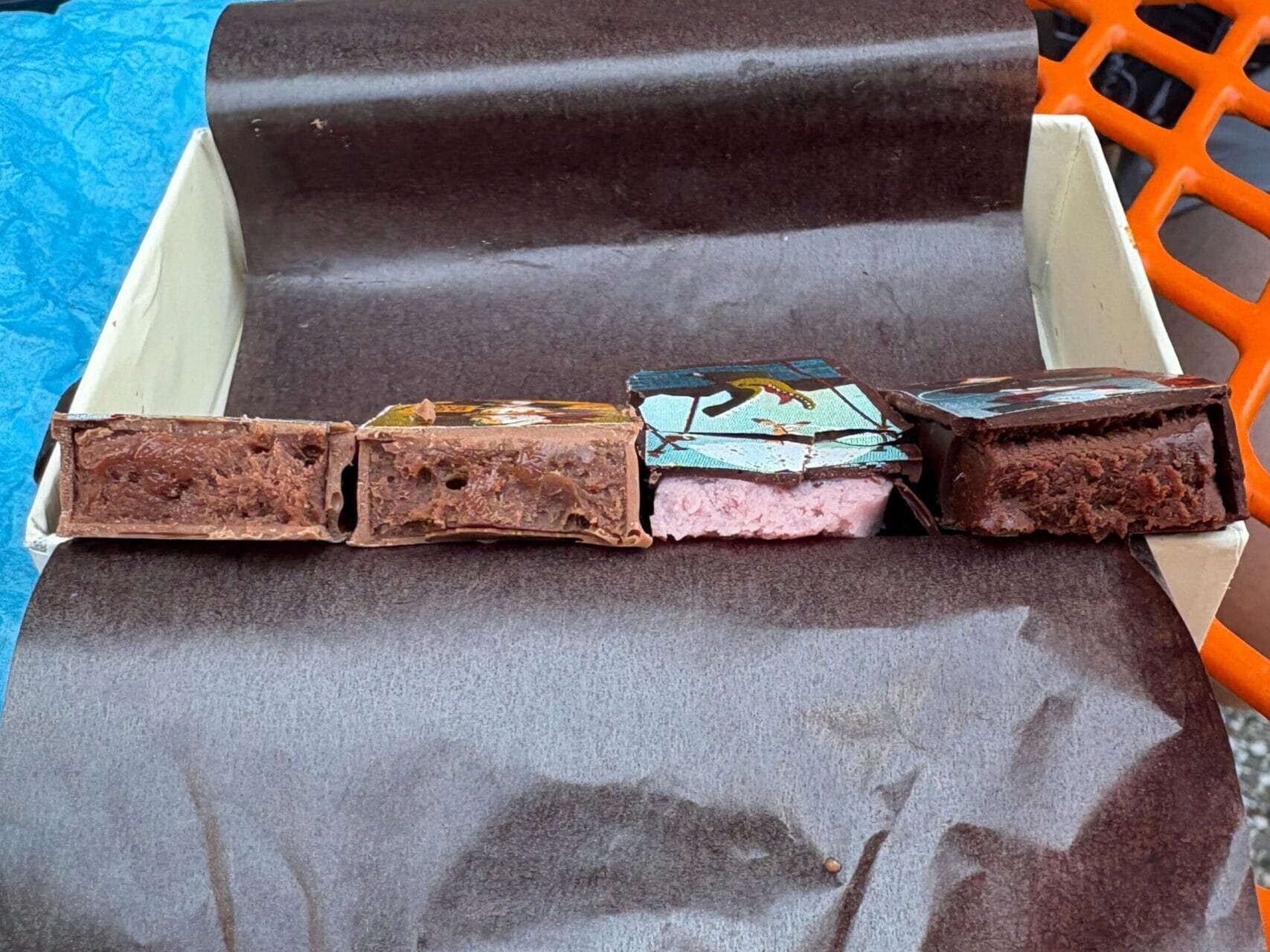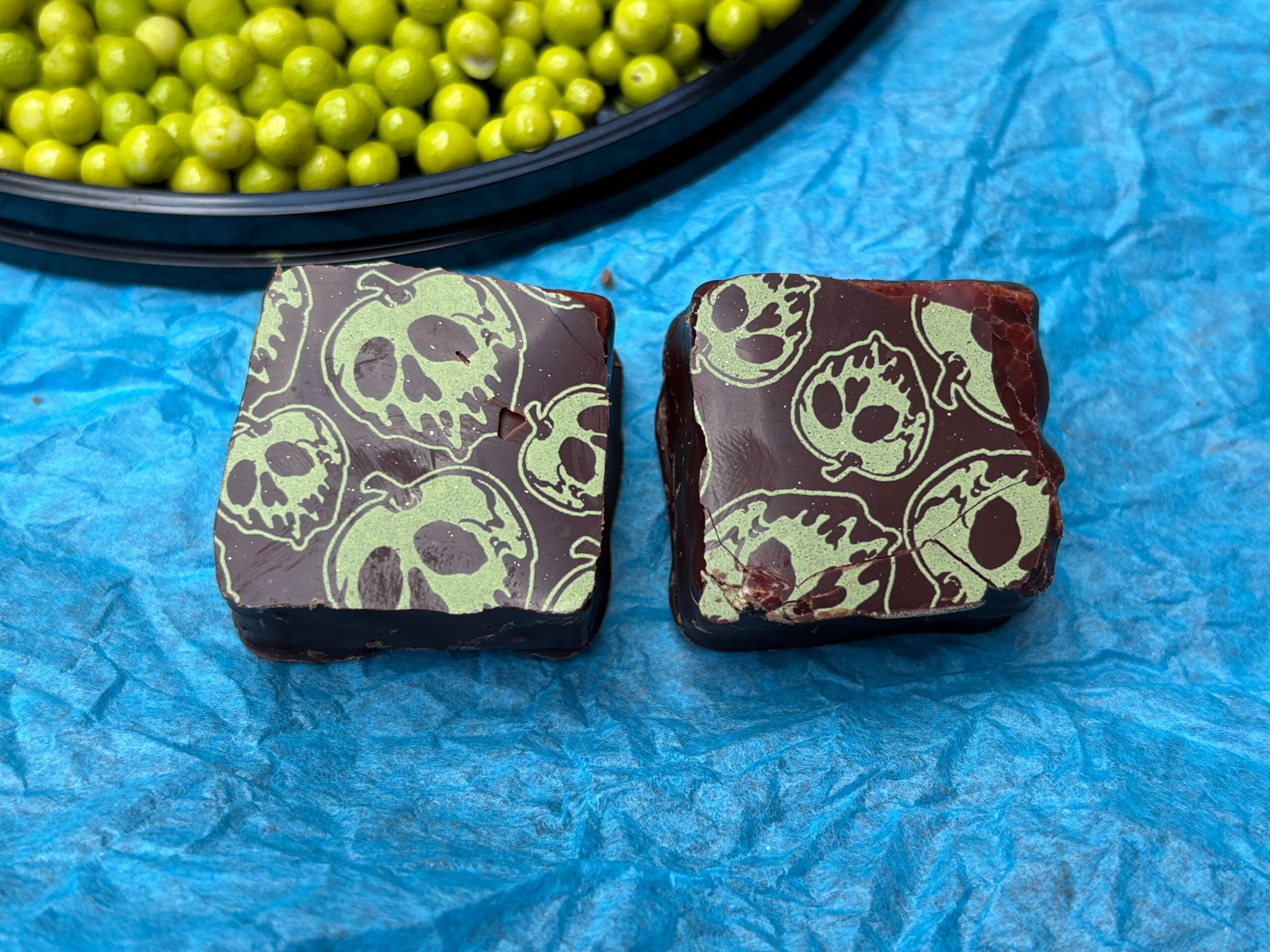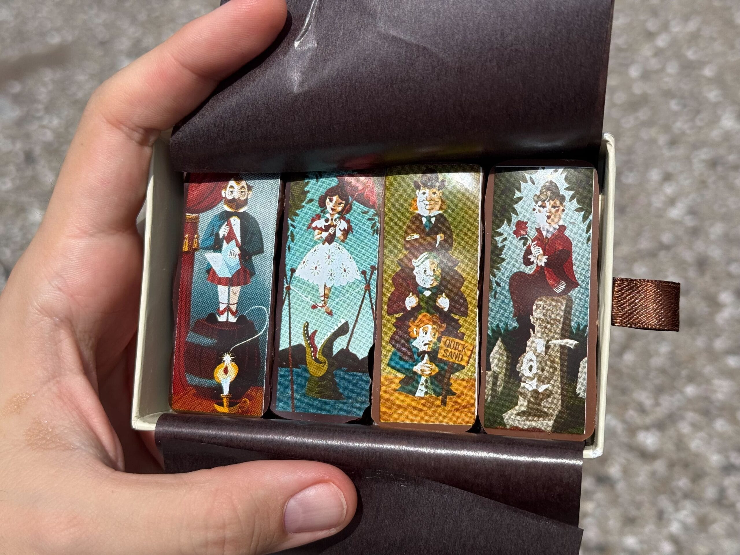 The trio in quick sand is the salted caramel flavor, which melts in your mouth. Finally Constance sitting on a tombstone is the passion fruit flavor. This would probably be our least favorite of the four, but it was still extremely good. Really, the issue is less about the quality or the chocolate and more what flavors you like.