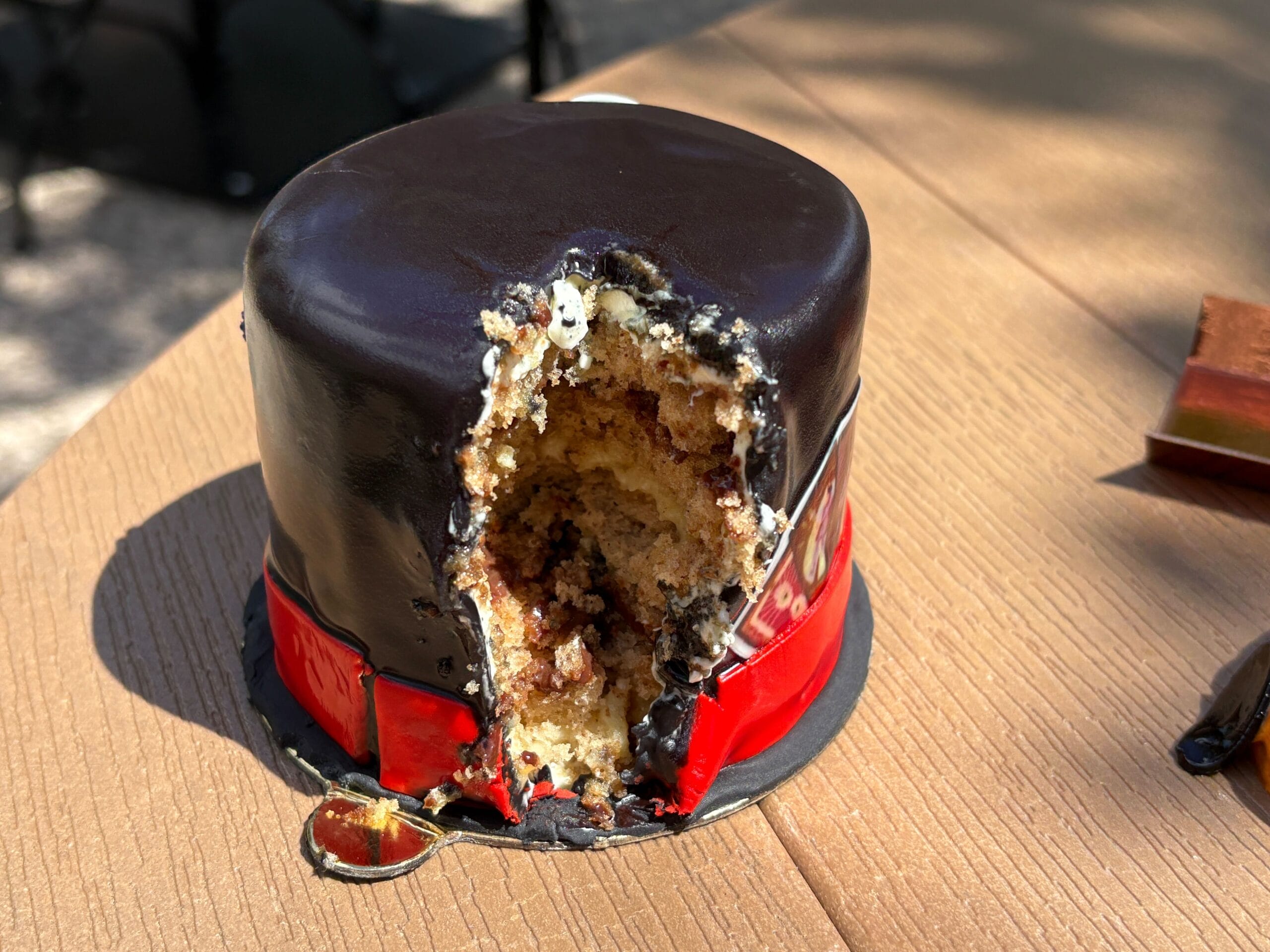 The cookies and cream mousse is the star of this dessert. The brownie base was thick and a little hard, but the mousse helped to elevate it. Neither were overly sweet, as sometimes happens with cookies and cream flavors. The top was again covered in fondant, but this was thinner than the exterior of the Dr. Facilier cake.