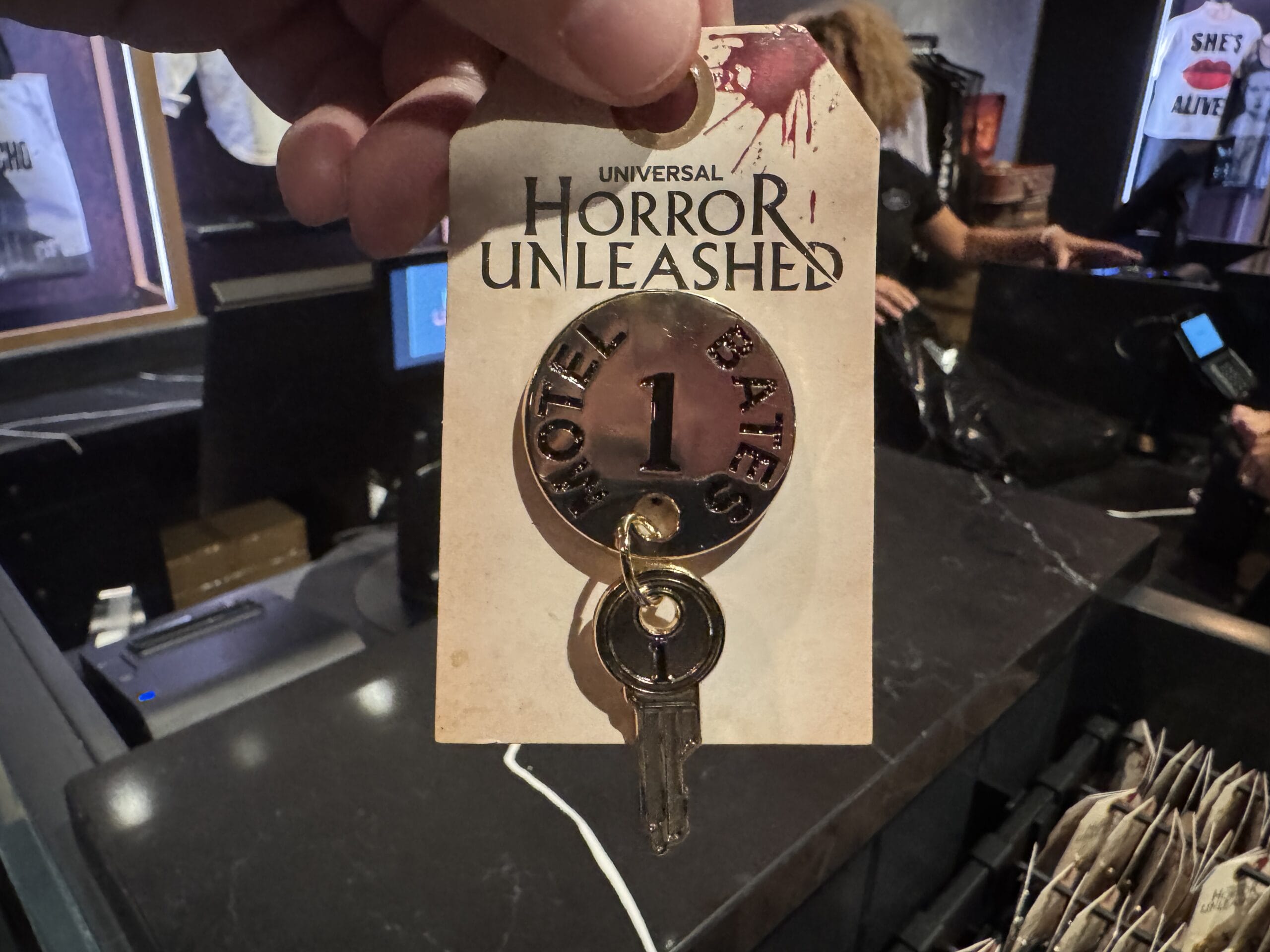 A hand holds a "Motel Bates 1" key with a "Horror Unleashed" tag, part of Universal Horror Unleashed merchandise.