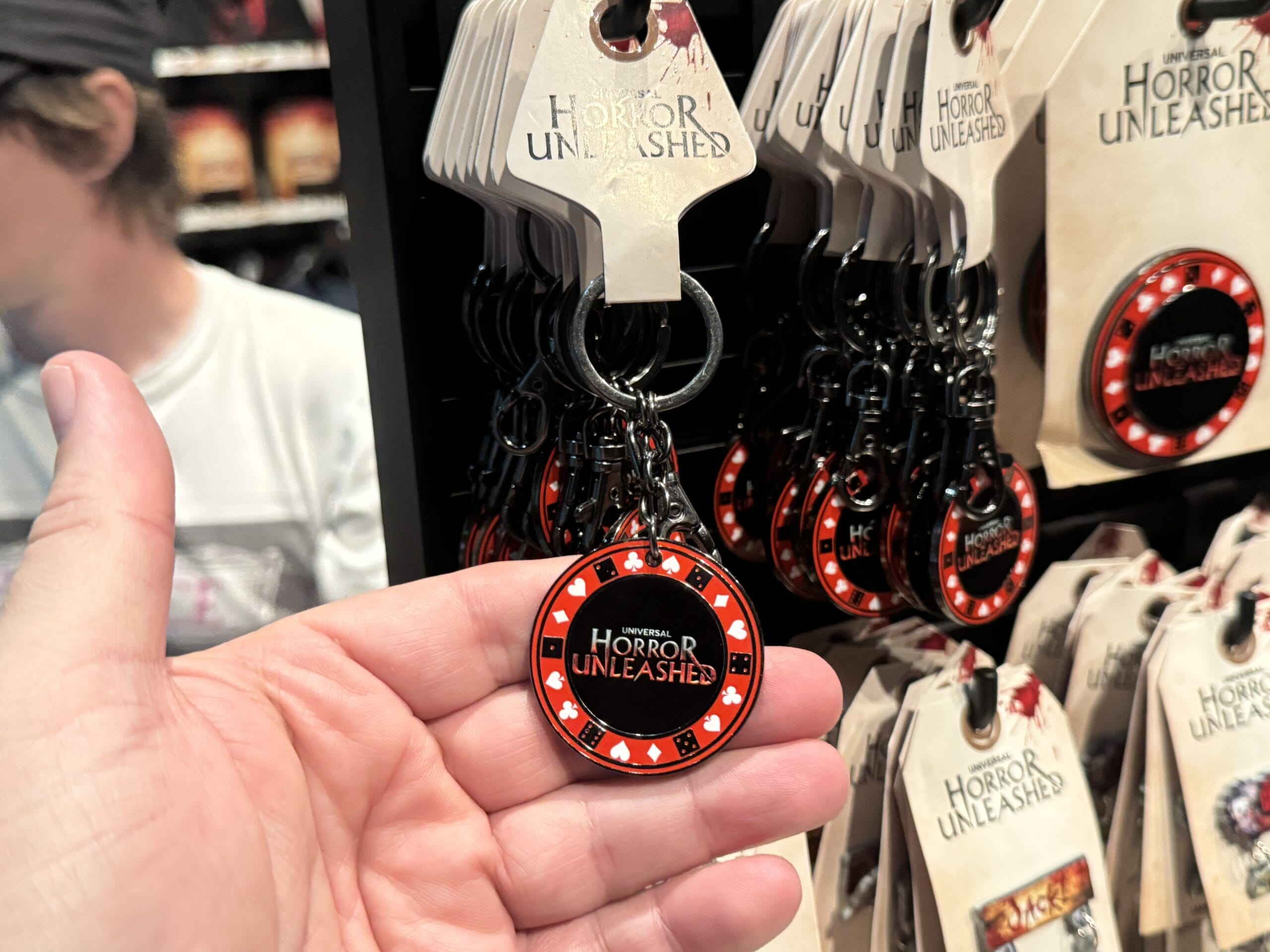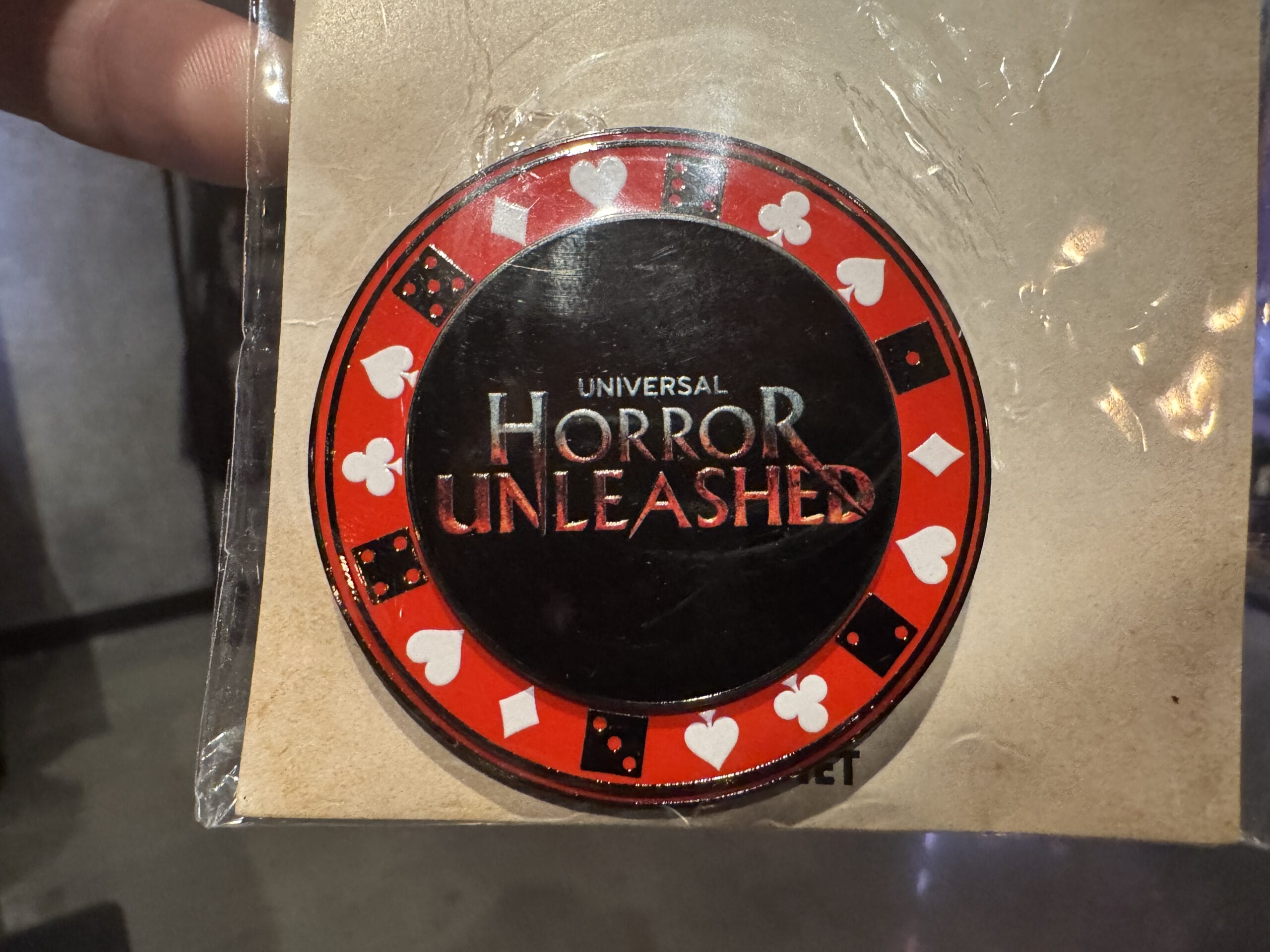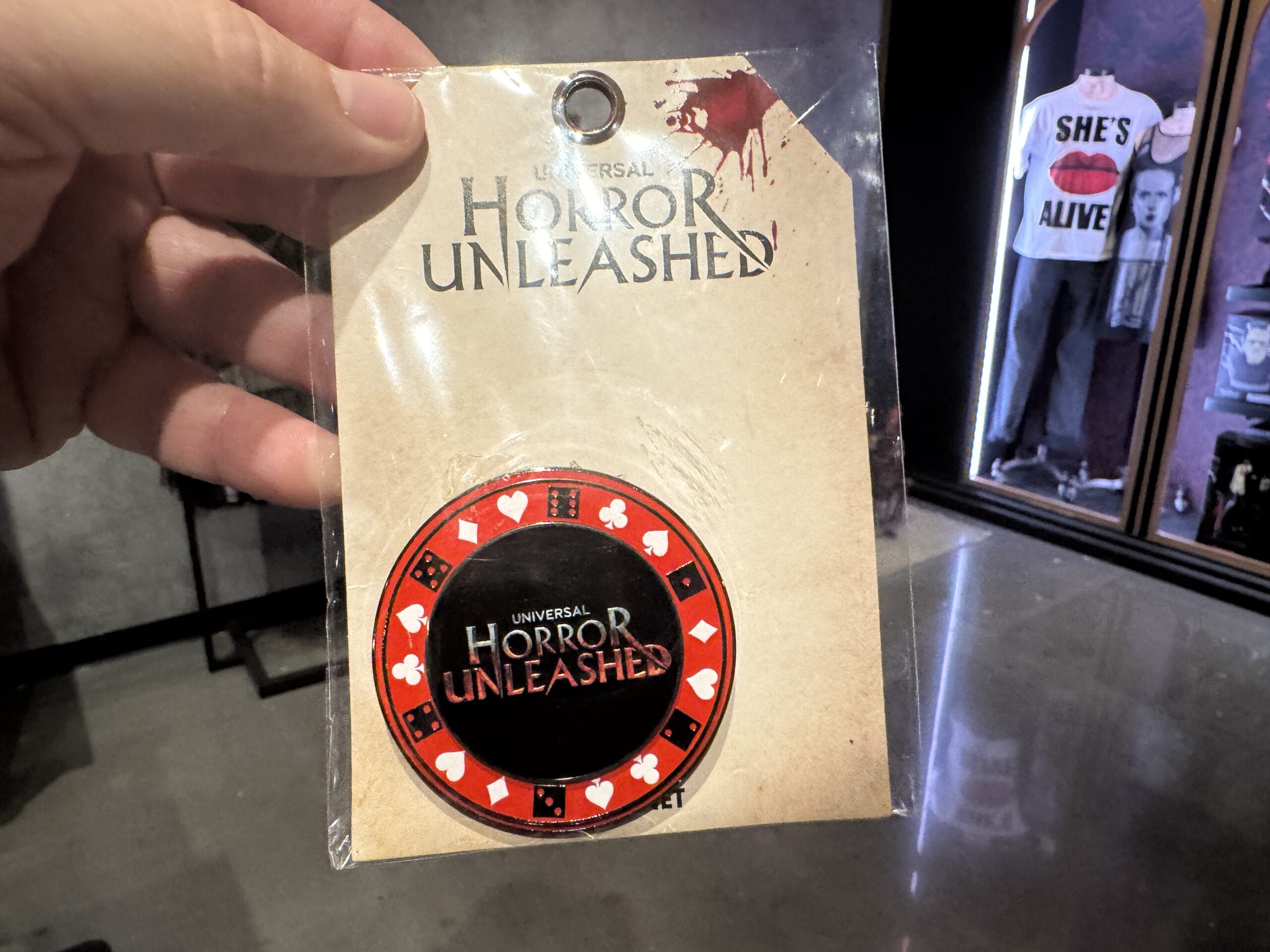 A hand holds a “Horror Unleashed” poker chip, part of Universal Horror Unleashed merchandise, on a blood-splattered tag.