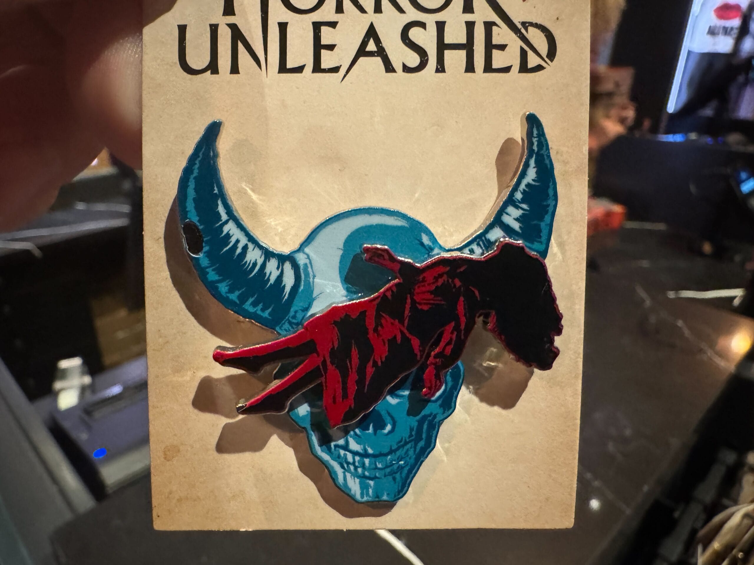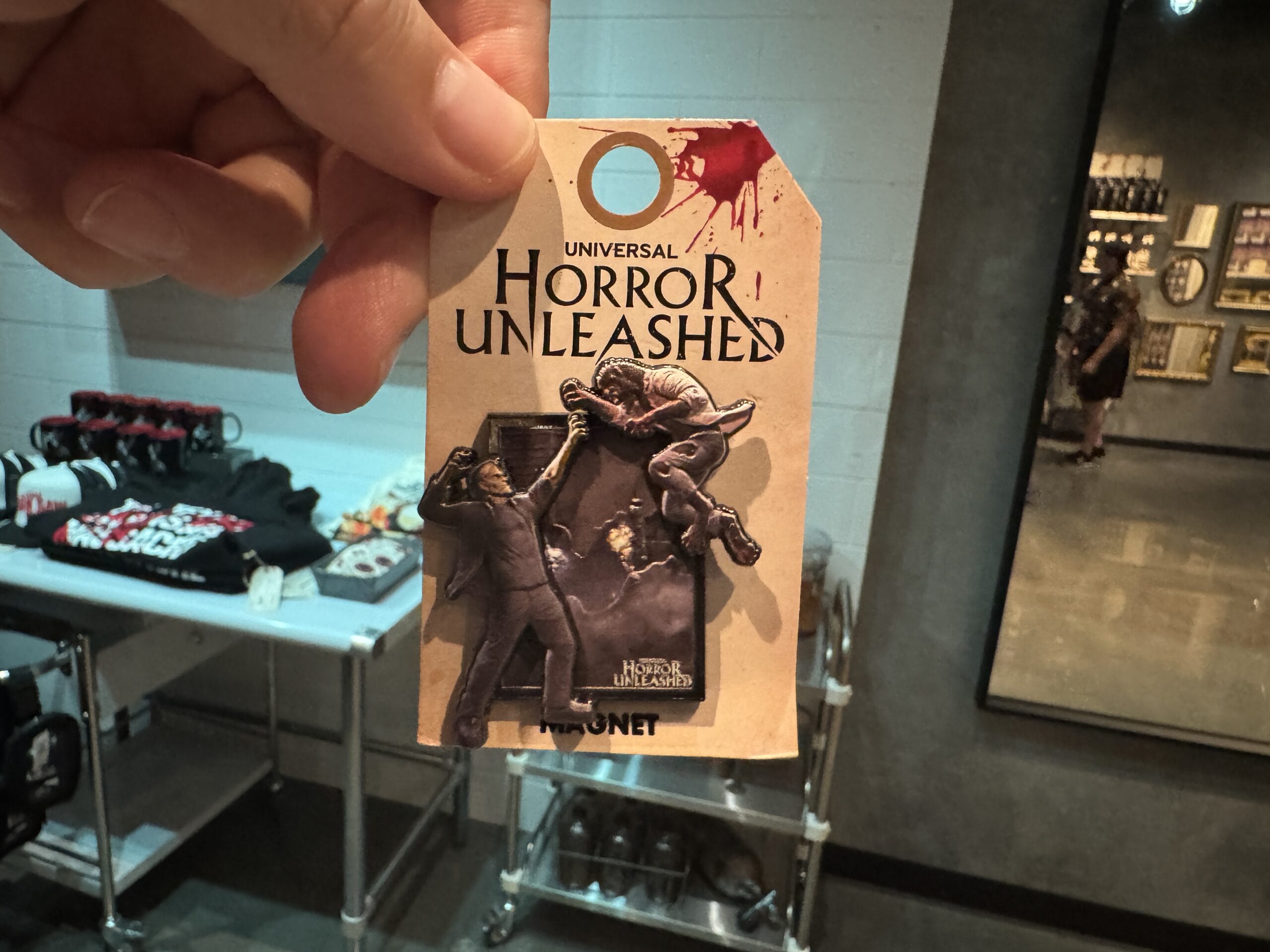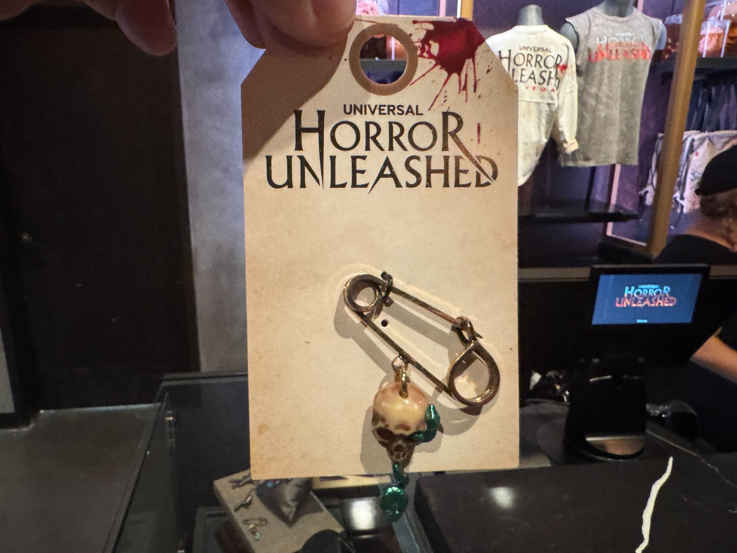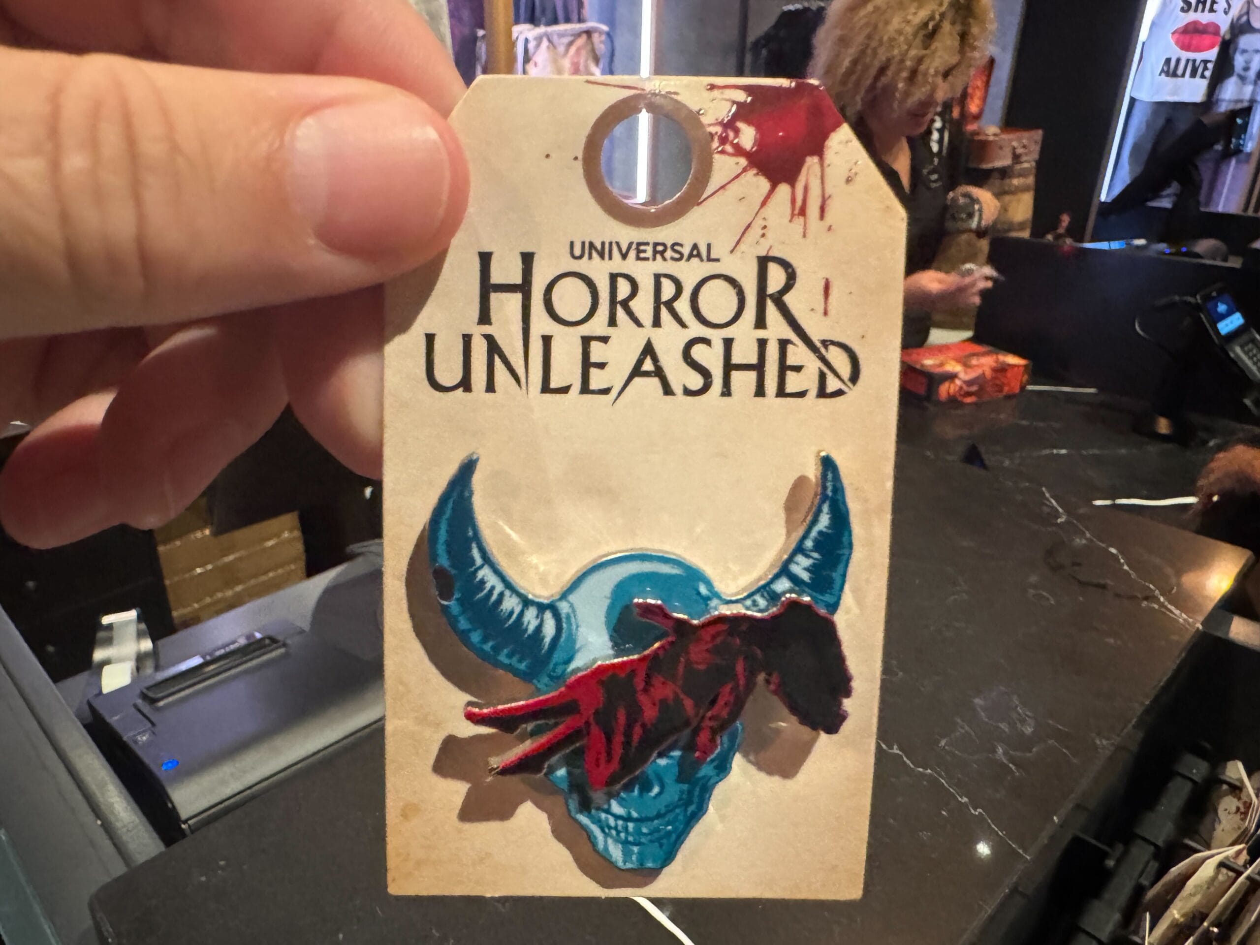 A hand holds a “Horror Unleashed” poker chip, part of Universal Horror Unleashed merchandise, on a blood-splattered tag.