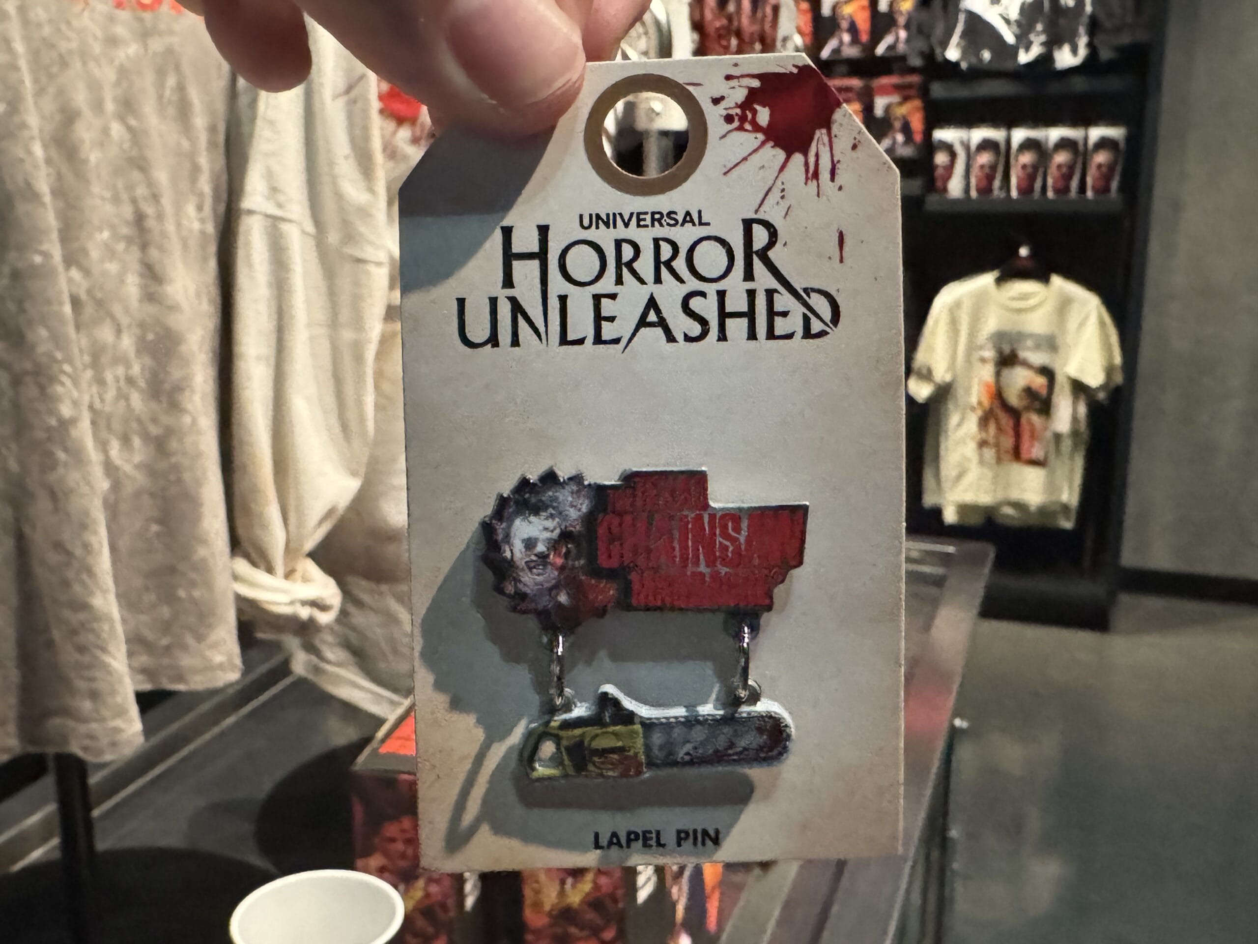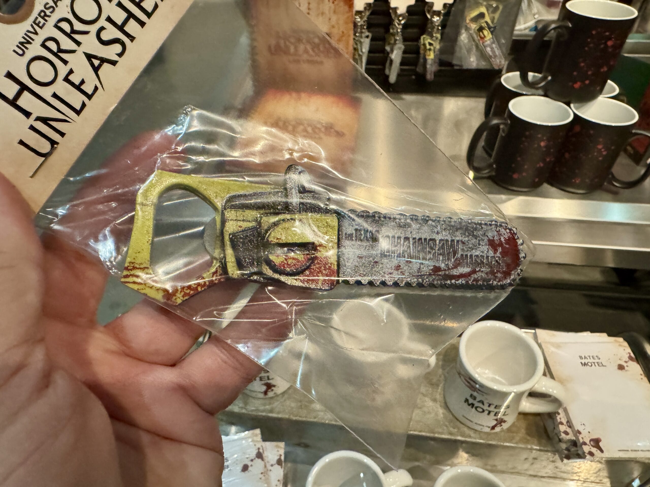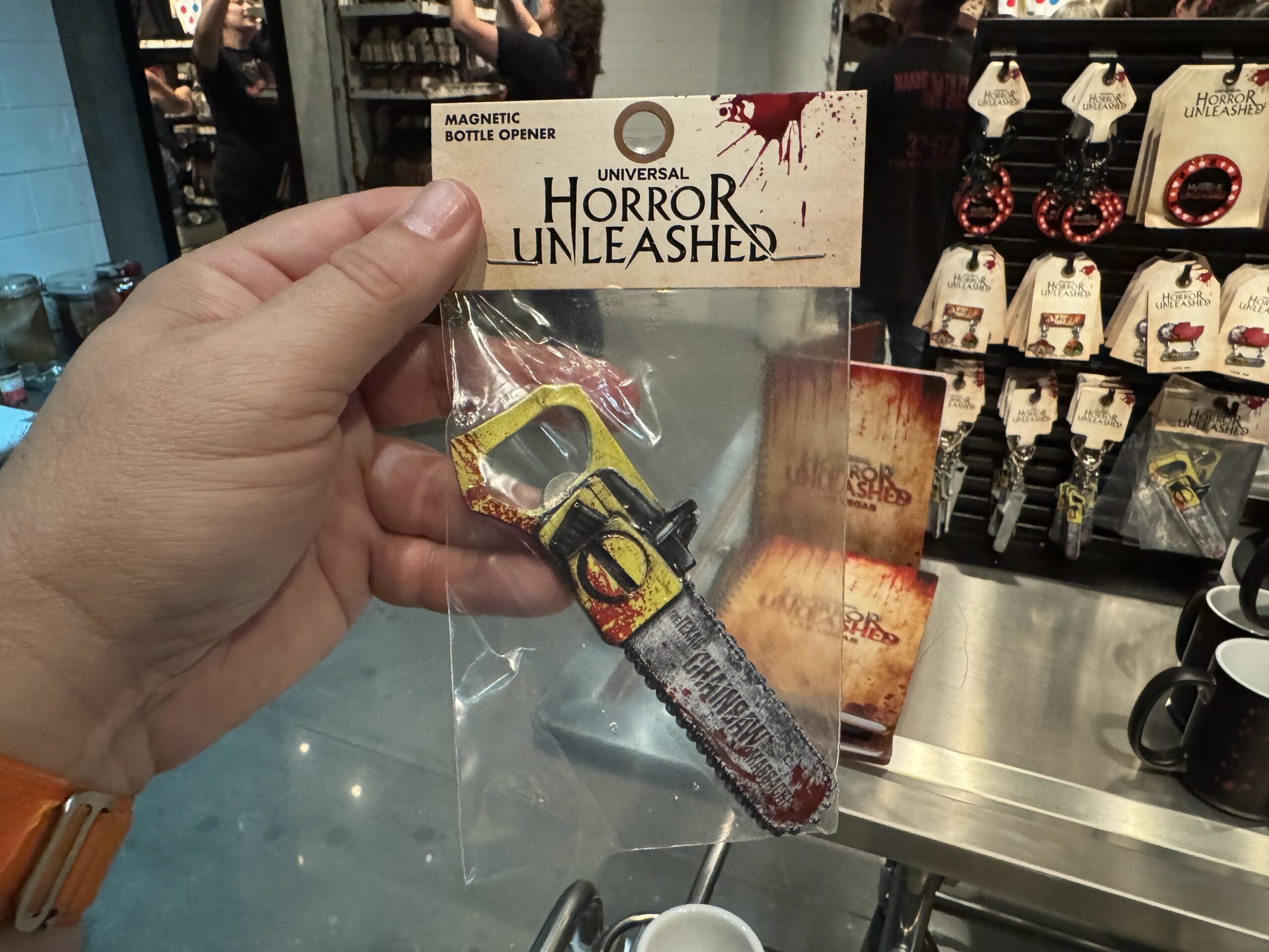 A hand holds a small "Chainsaw Massacre" keychain in front of Universal Horror Unleashed merchandise and prices.