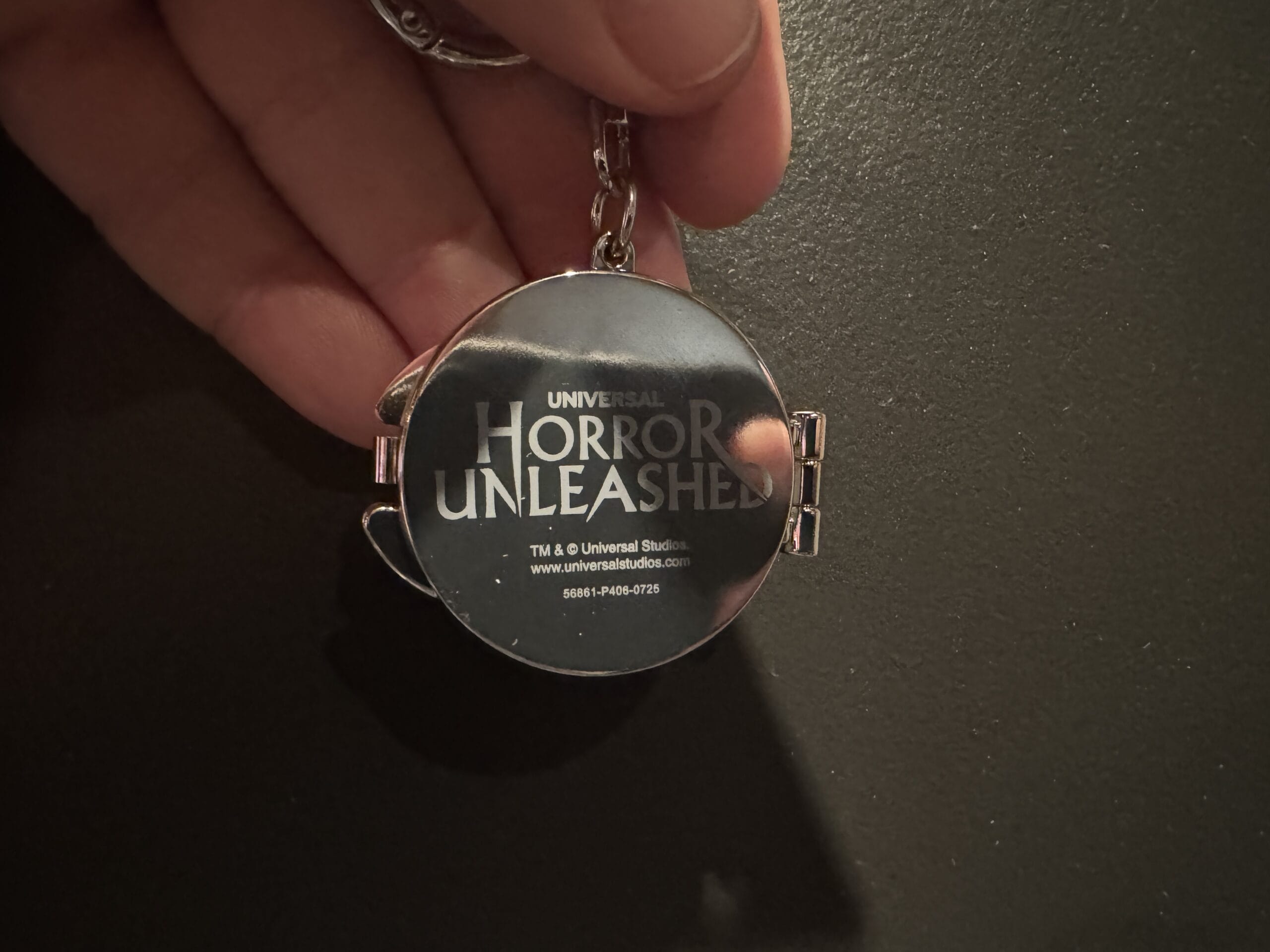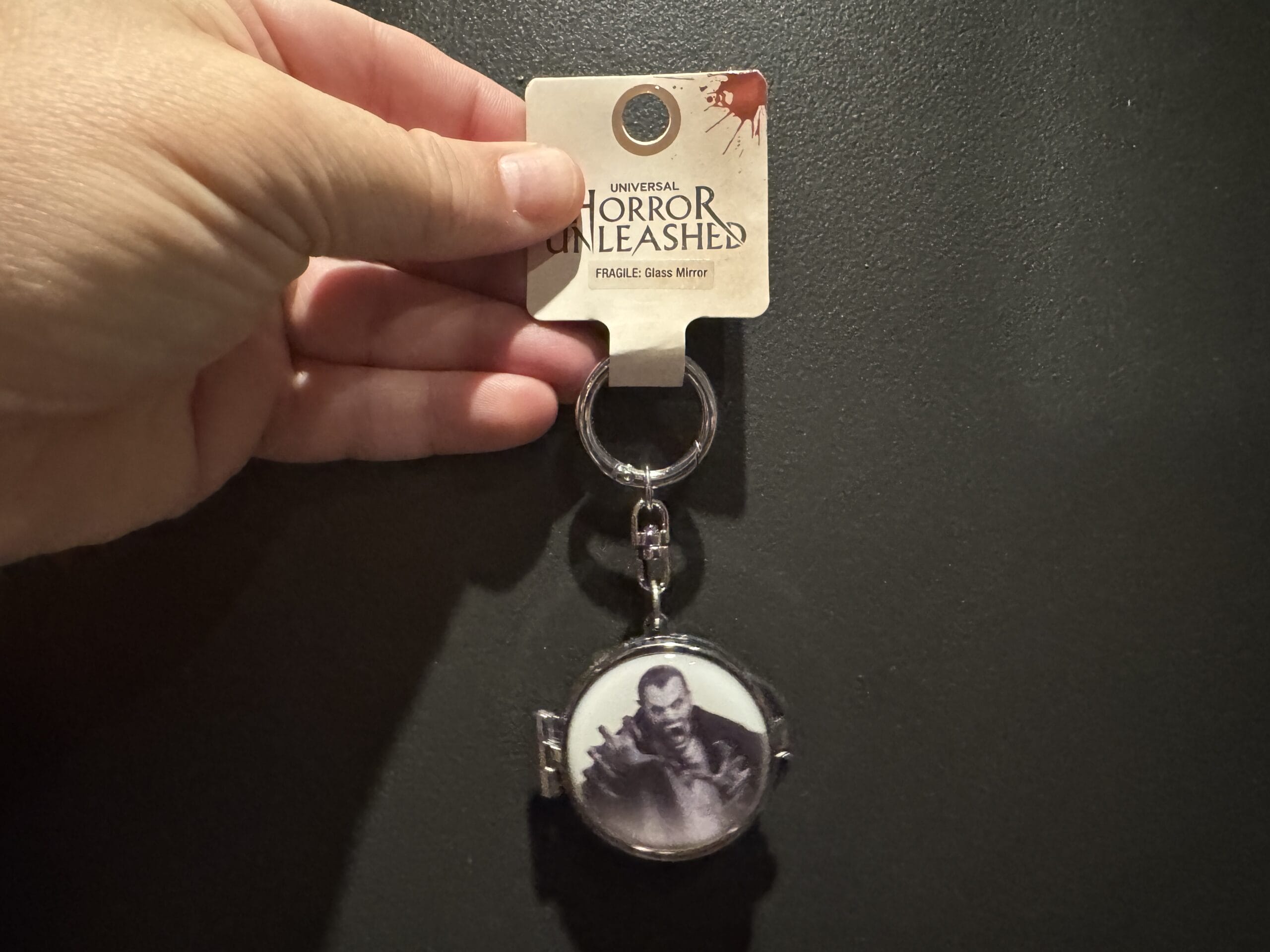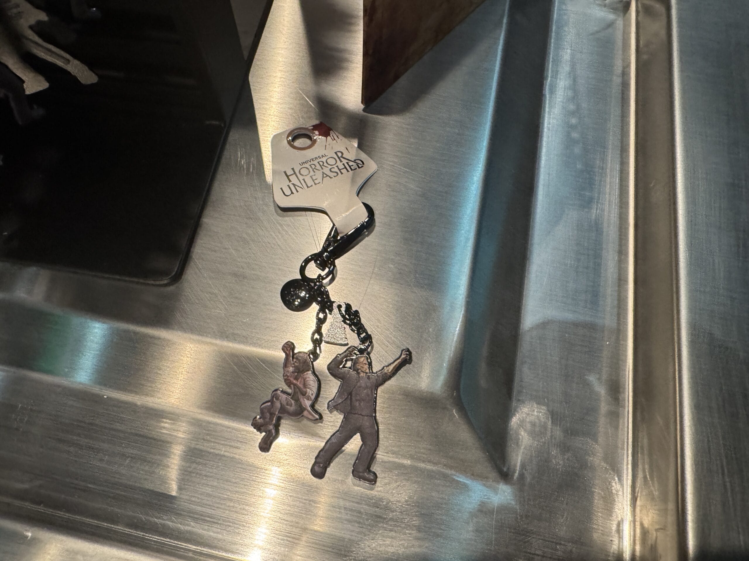 A hand holds a small "Chainsaw Massacre" keychain in front of Universal Horror Unleashed merchandise and prices.