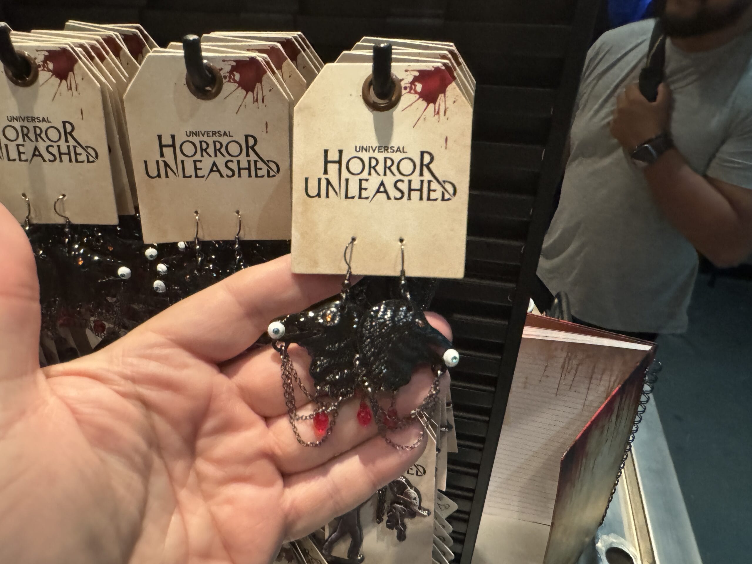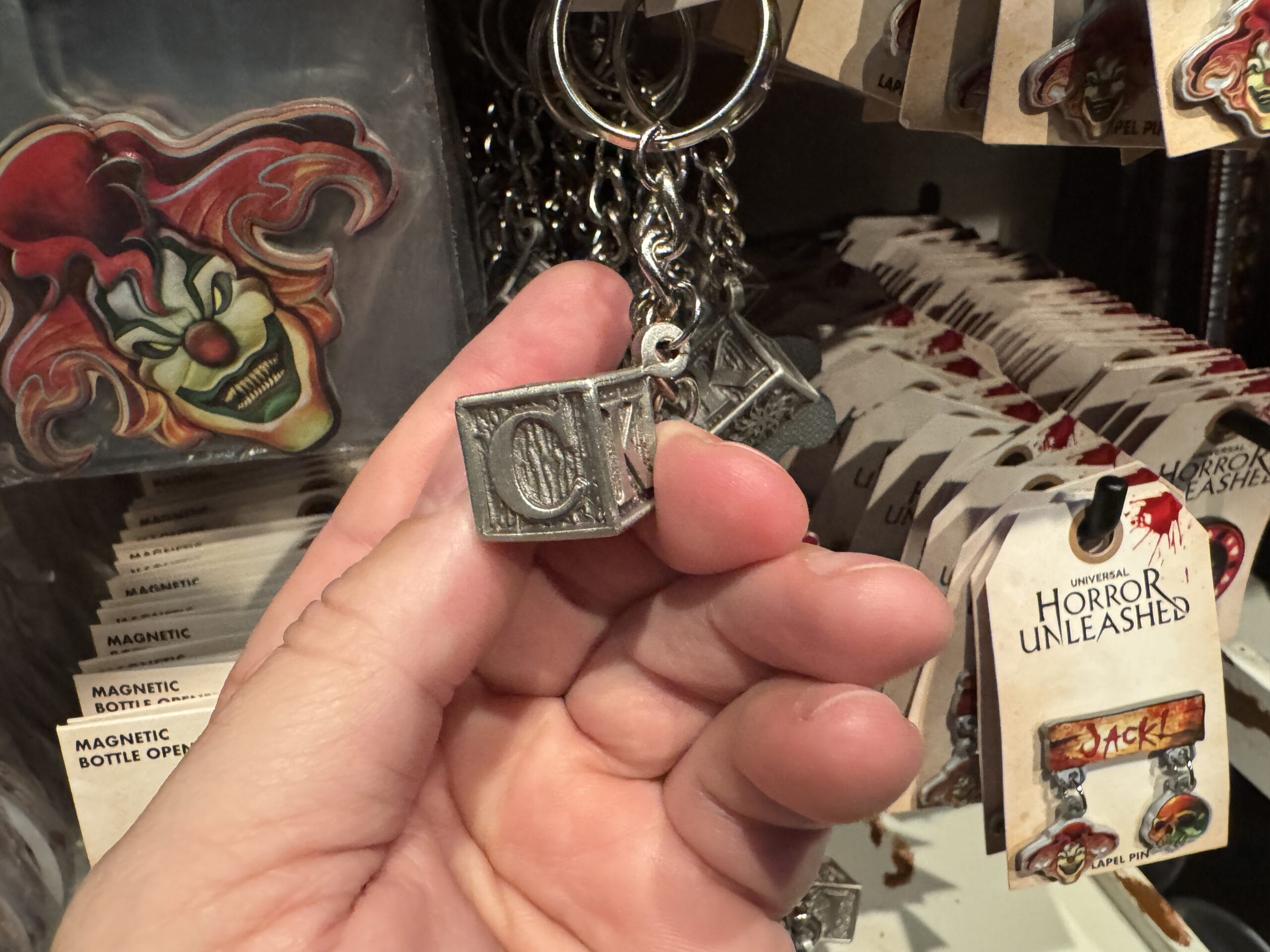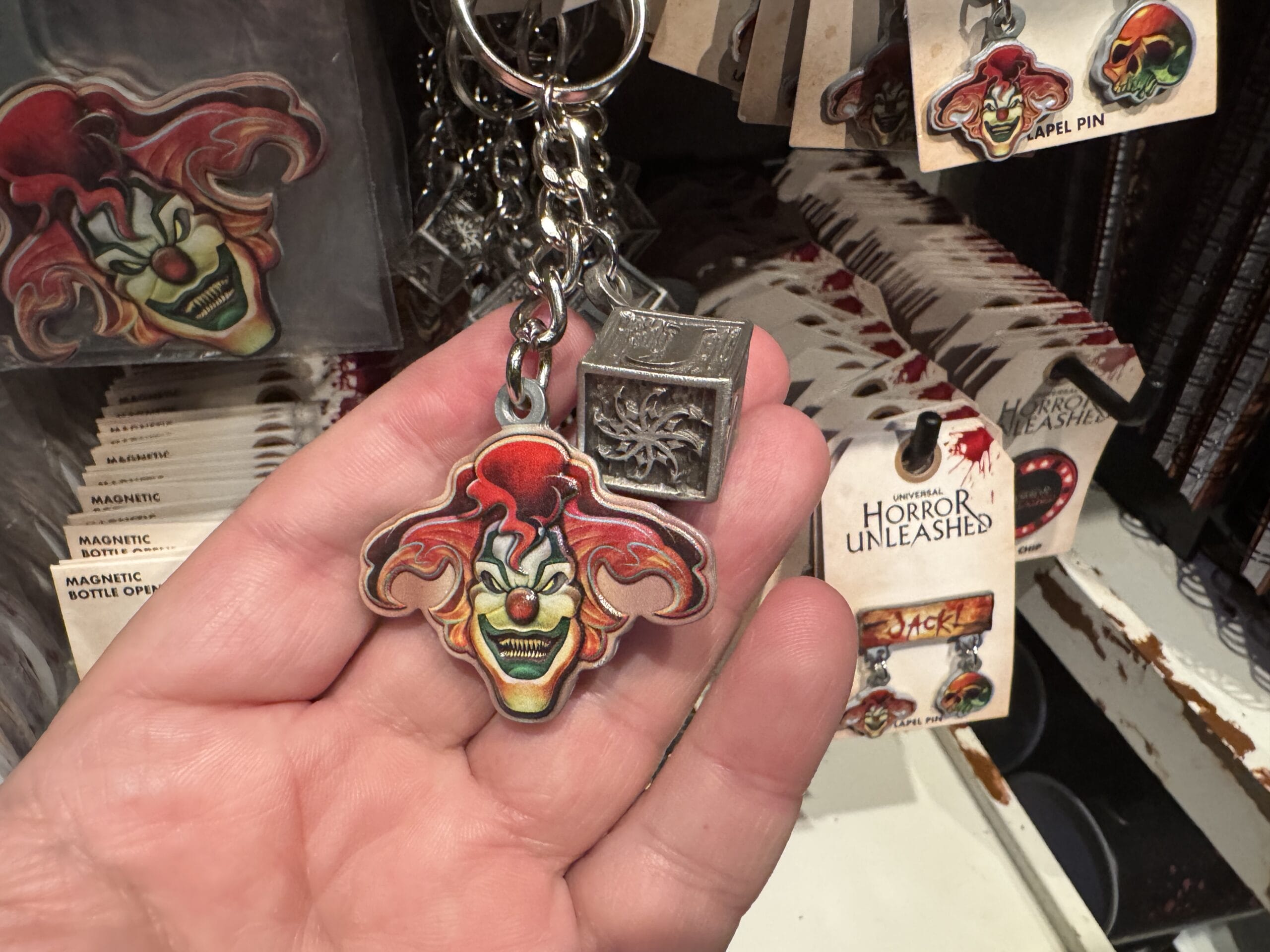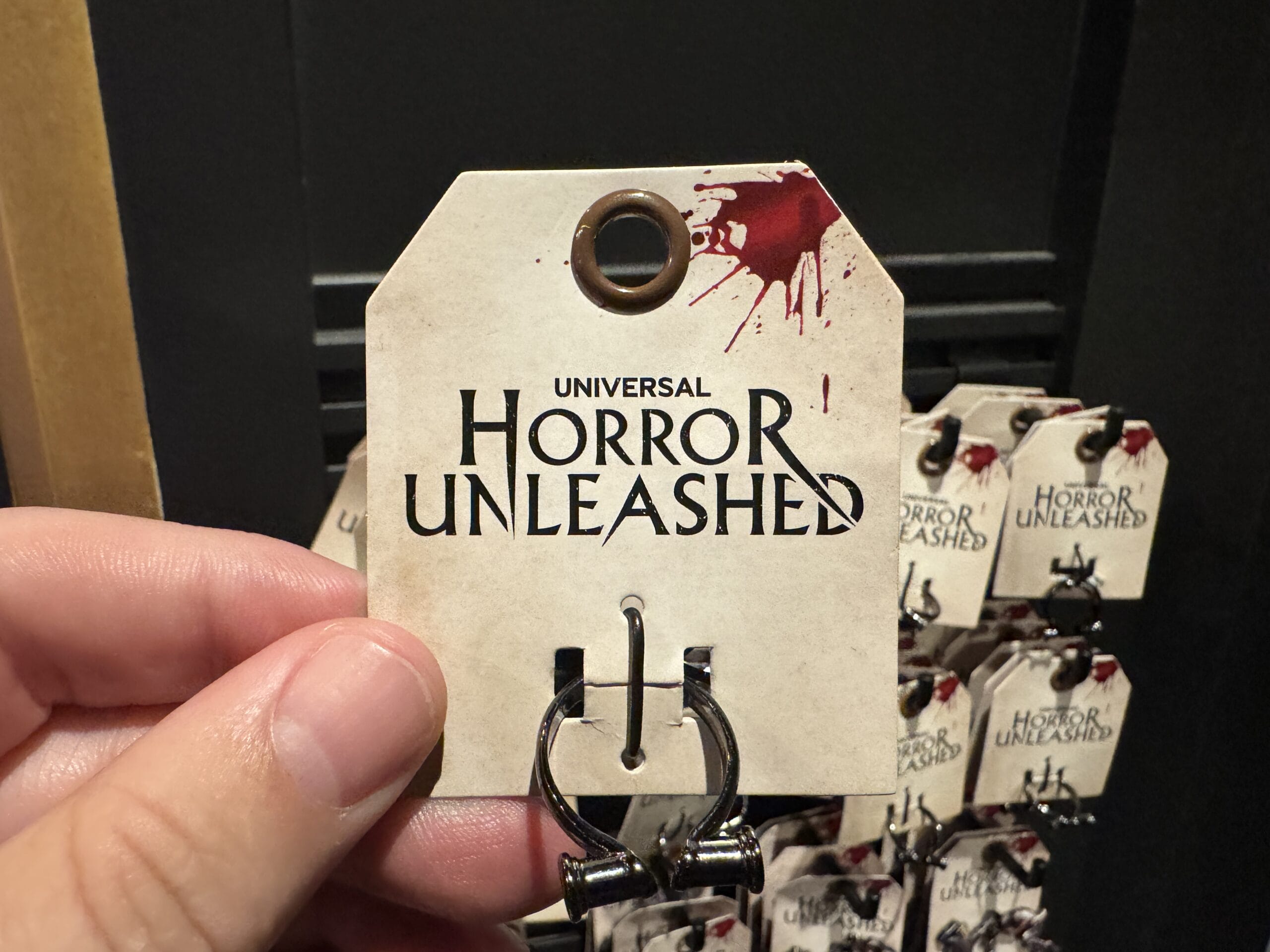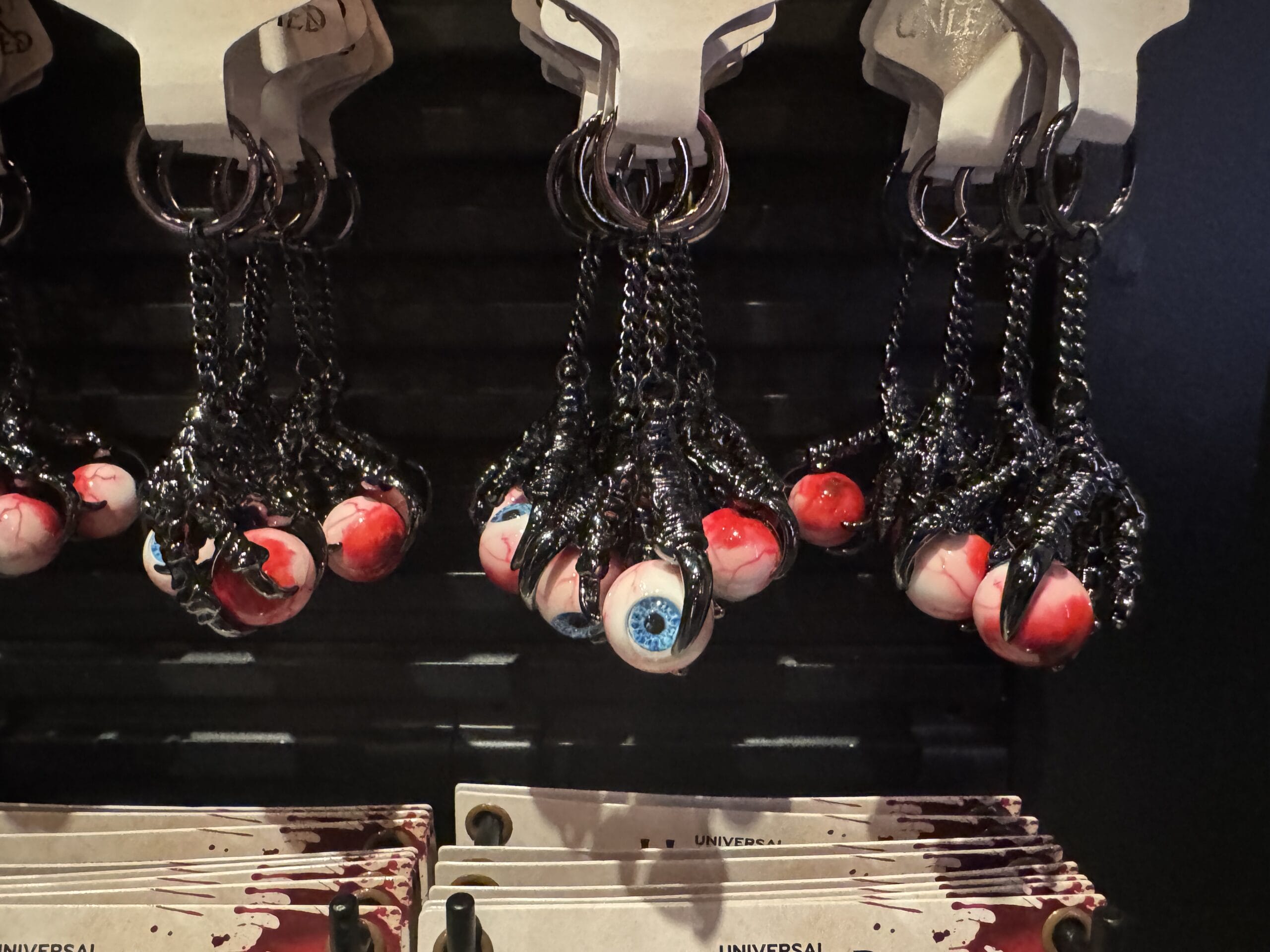Keychains with black claws clutching eyeballs hang on display hooks with prices for Universal Horror Unleashed merchandise.